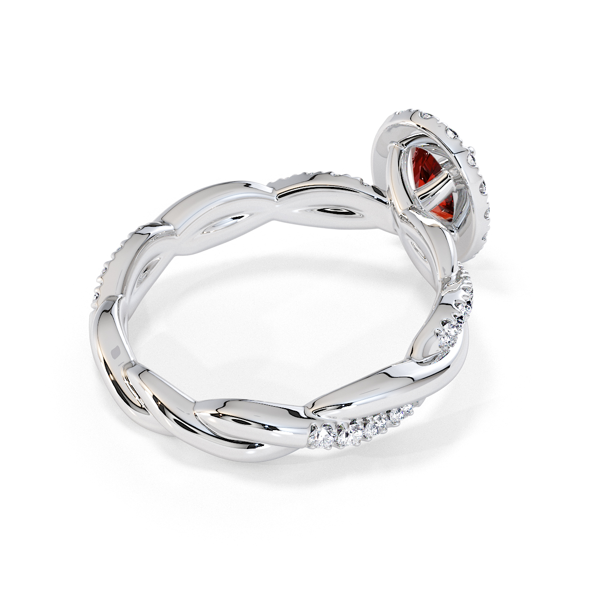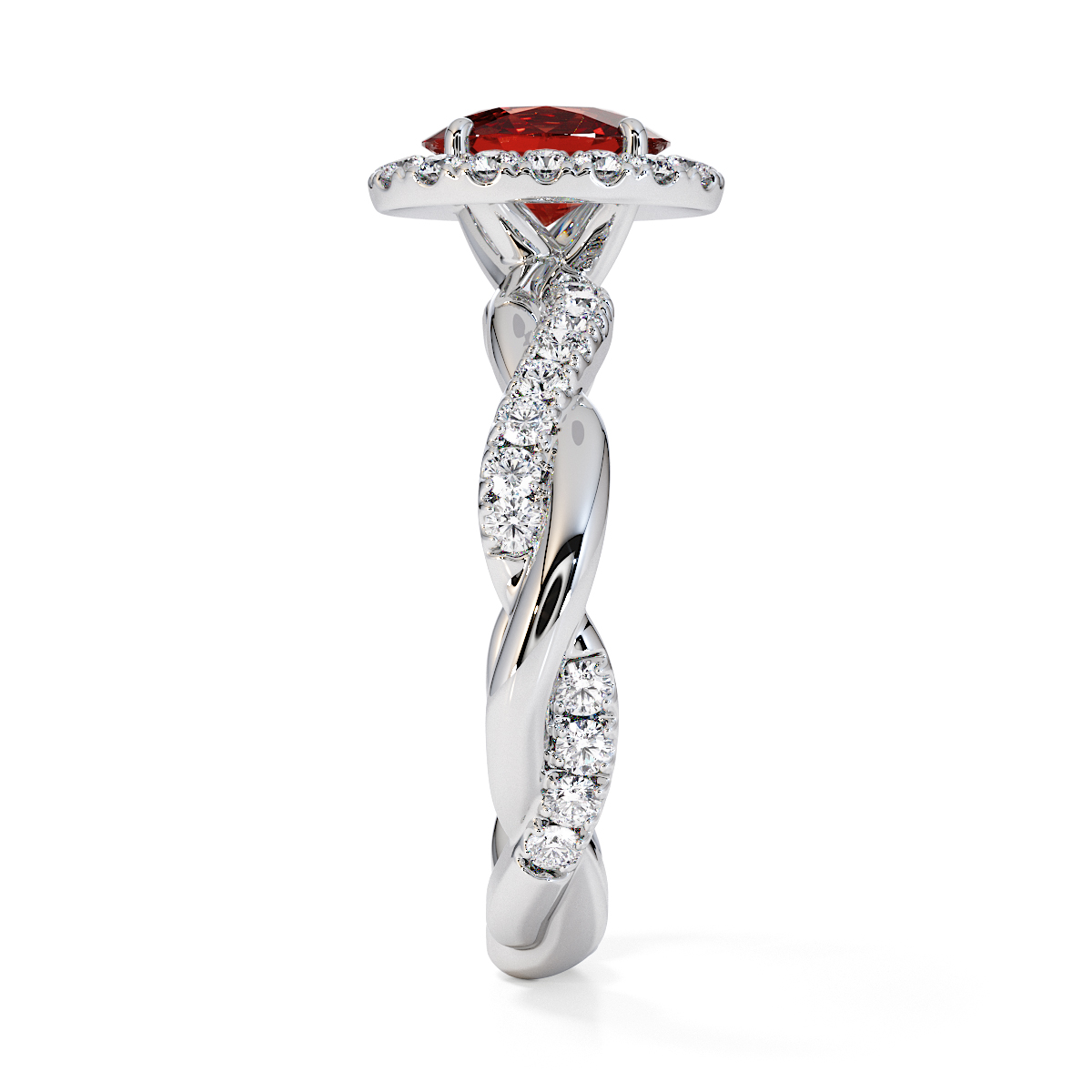 Featuring a gorgeous oval-shaped Garnet and Diamond Engagement Ring surrounded by a halo of round brilliant stones, the ring is further adorned with prong-set diamonds running up the twisted shoulders. This engagement ring beautifully complements the wedding ring of your choice.