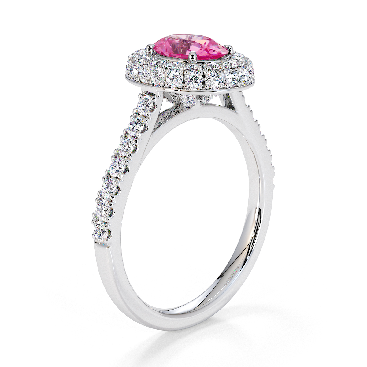 Featuring a gorgeous oval-shaped Pink Sapphire and Diamond Engagement Ring, surrounded by a halo of round brilliant stones, The ring is further adorned with prong-set diamonds running up the shoulders. This engagement ring sits beautifully with the wedding ring of your choice.