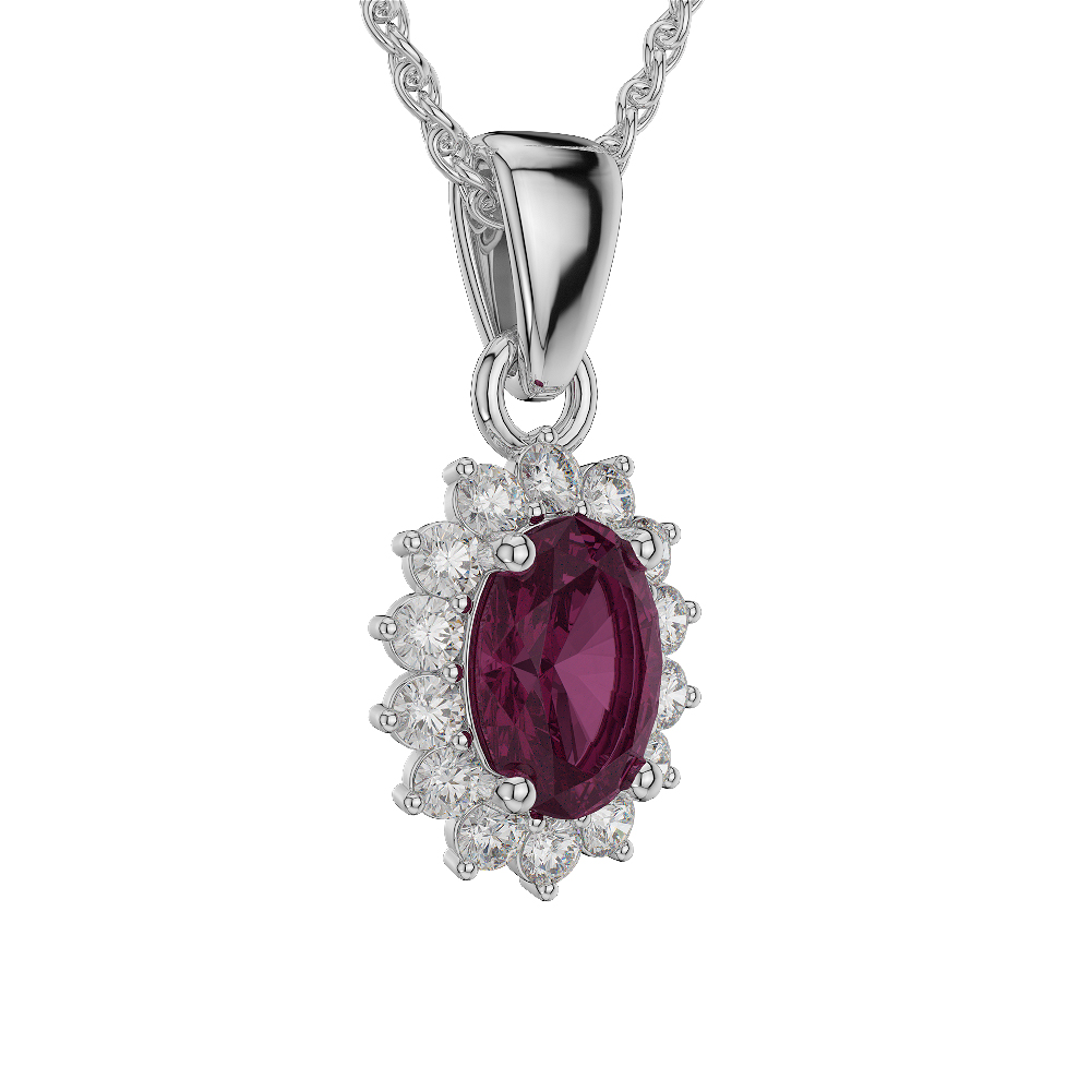 This gorgeous halo pendant made of ruby and diamonds embodies the ideal balance of sophistication and elegance. Its oval design highlights the captivating charm of ruby, enhanced by the brilliant dazzle of diamonds. While the necklace style lends elegance to any ensemble, the prong setting keeps the stones safe. Enhance your look with this classic item.