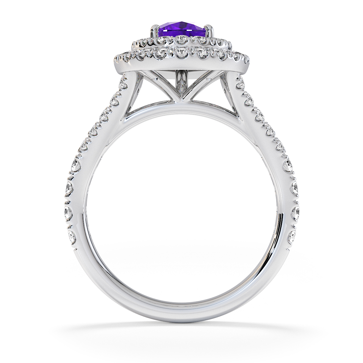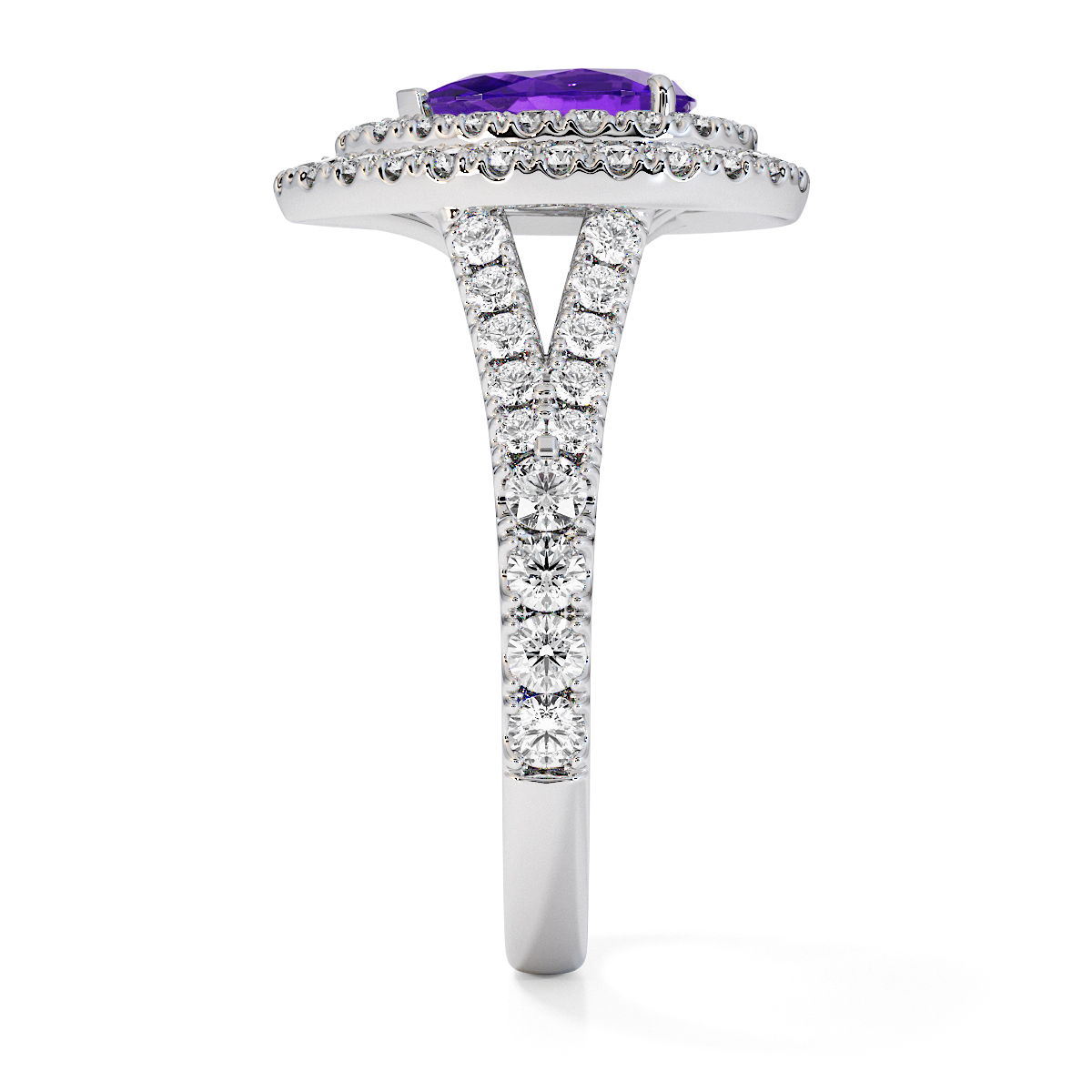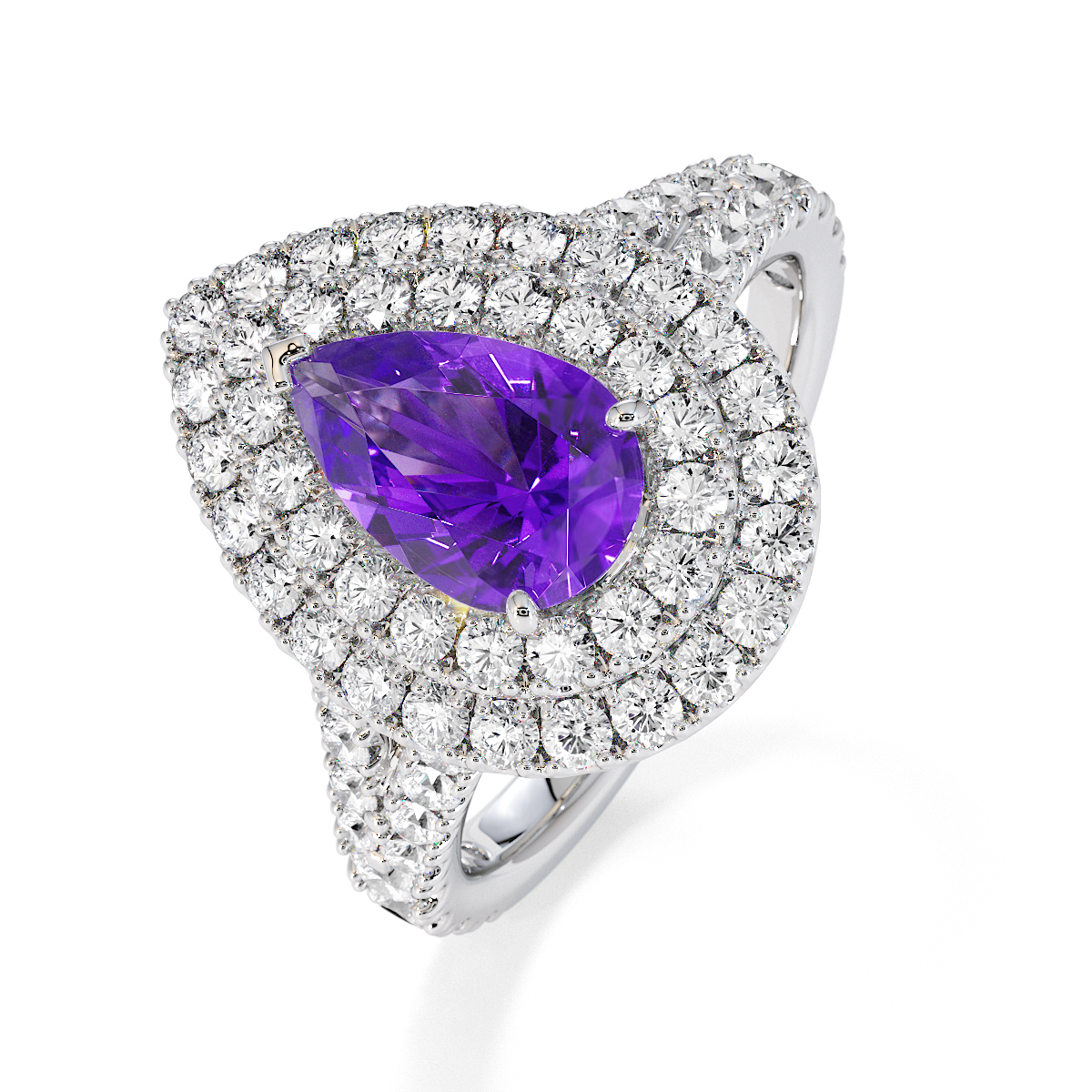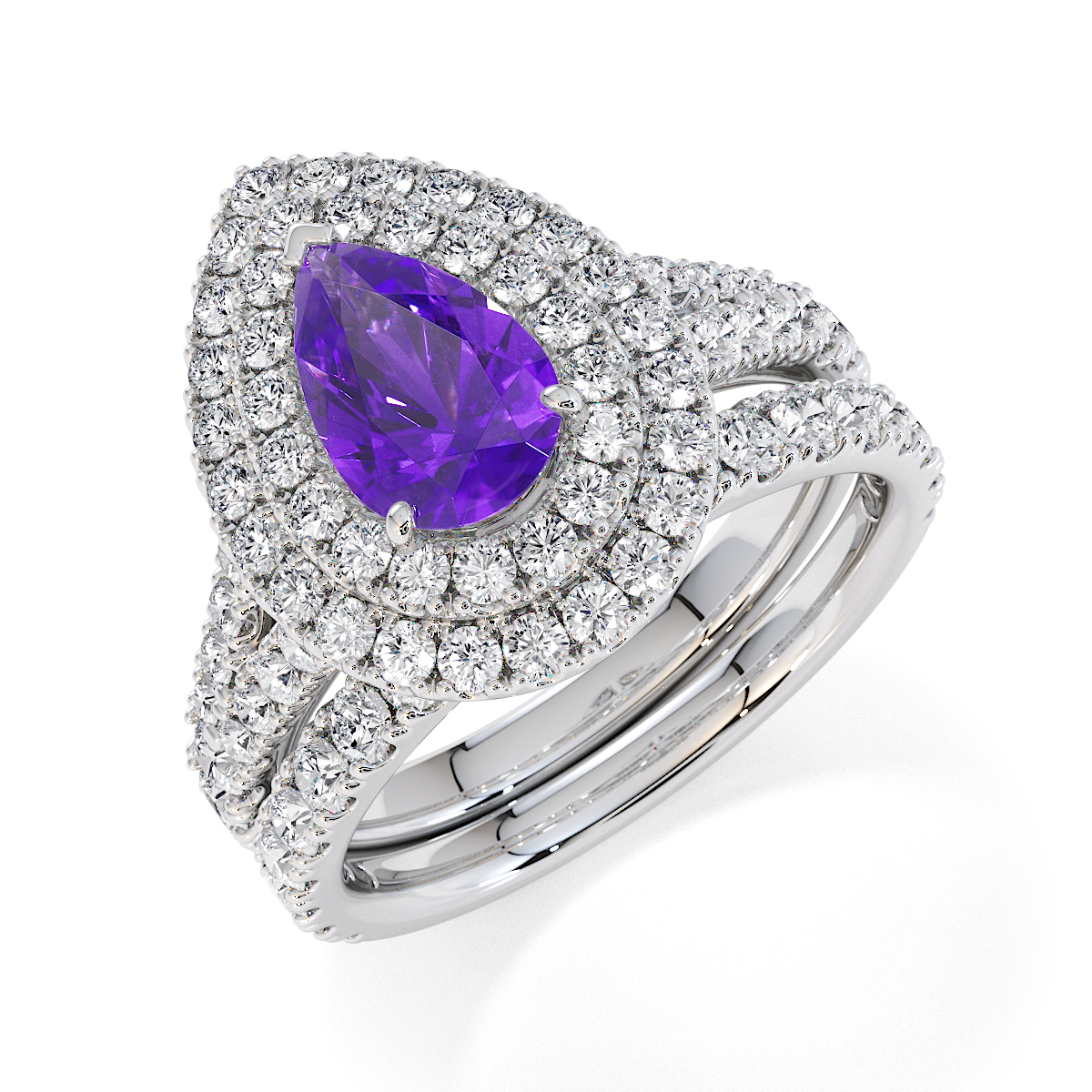 Featuring a gorgeous pear-shaped Amethyst and Diamond Engagement Ring surrounded by a double halo of round brilliant stones, the ring is further adorned with prong-set diamonds running up the split shank shoulders. This engagement ring beautifully complements the wedding ring of your choice.