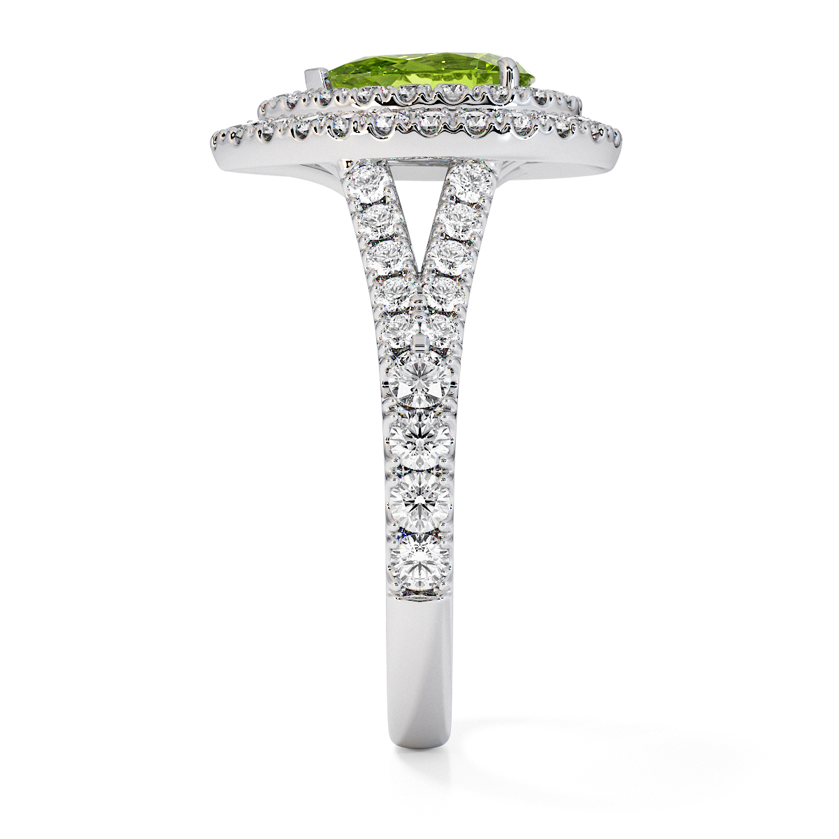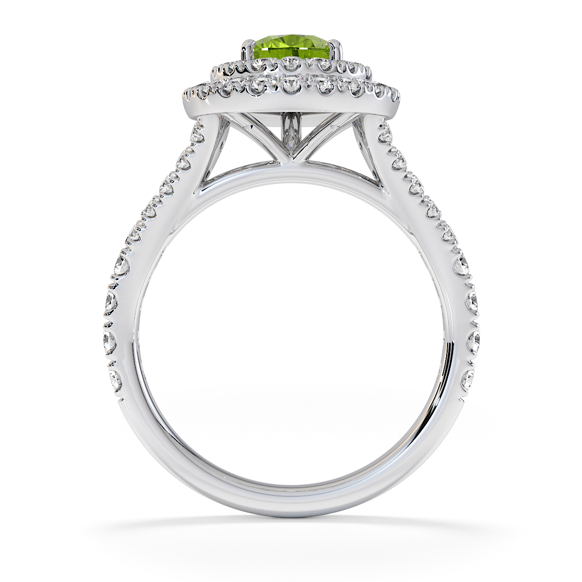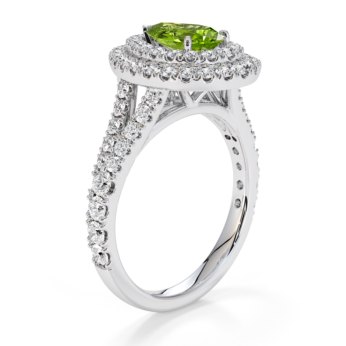 Featuring a gorgeous pear-shaped Peridot and Diamond Engagement Ring surrounded by a double halo of round brilliant stones, the ring is further adorned with prong-set diamonds running up the split shank shoulders. This engagement ring beautifully complements the wedding ring of your choice.