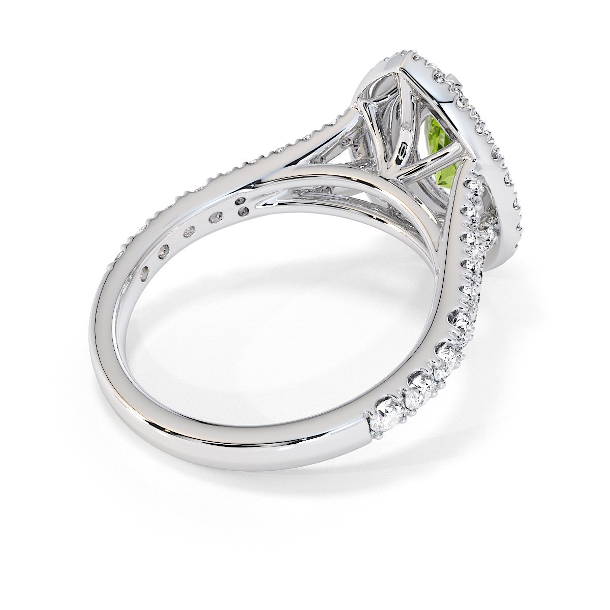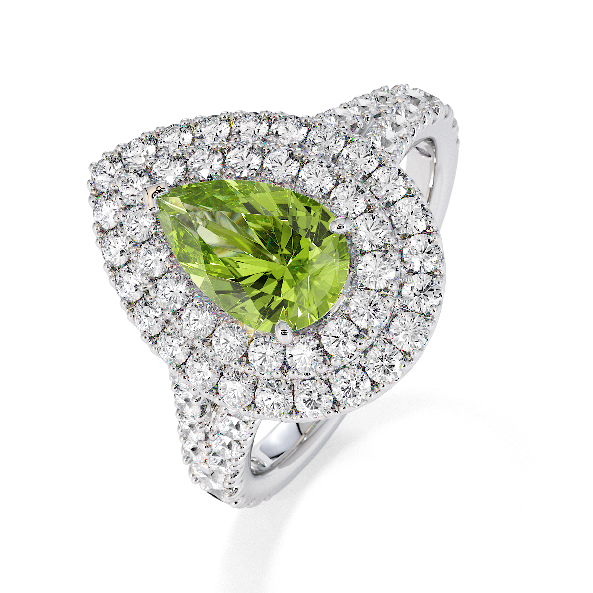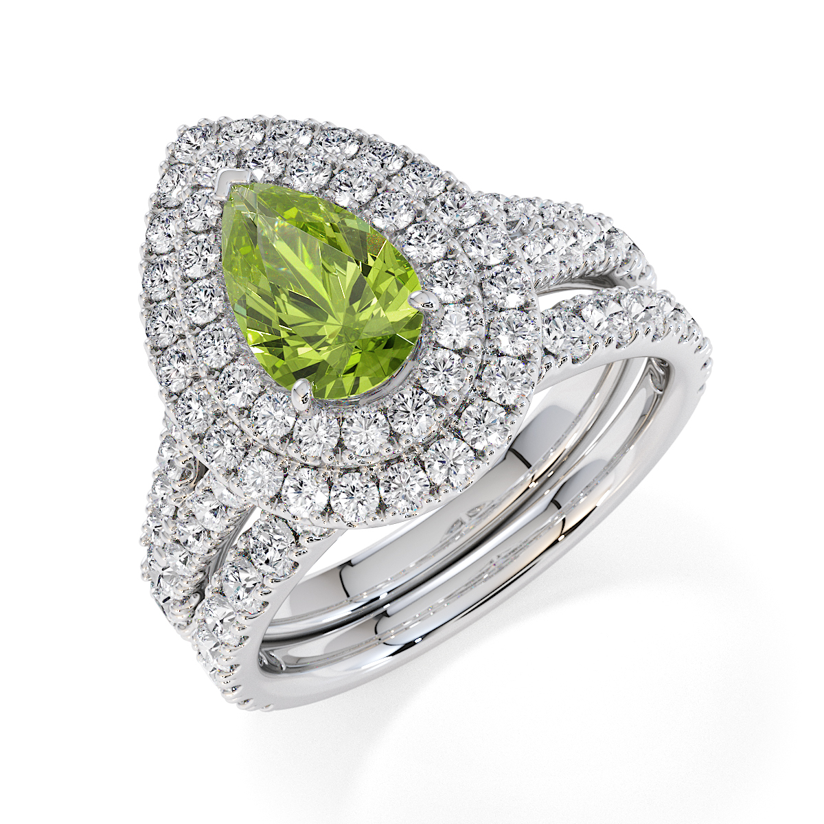 Featuring a gorgeous pear-shaped Peridot and Diamond Engagement Ring surrounded by a double halo of round brilliant stones, the ring is further adorned with prong-set diamonds running up the split shank shoulders. This engagement ring beautifully complements the wedding ring of your choice.