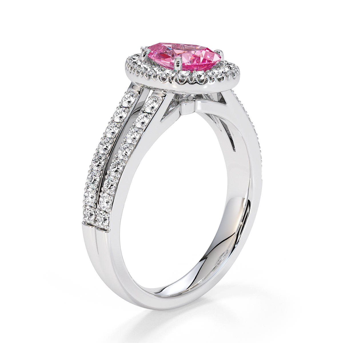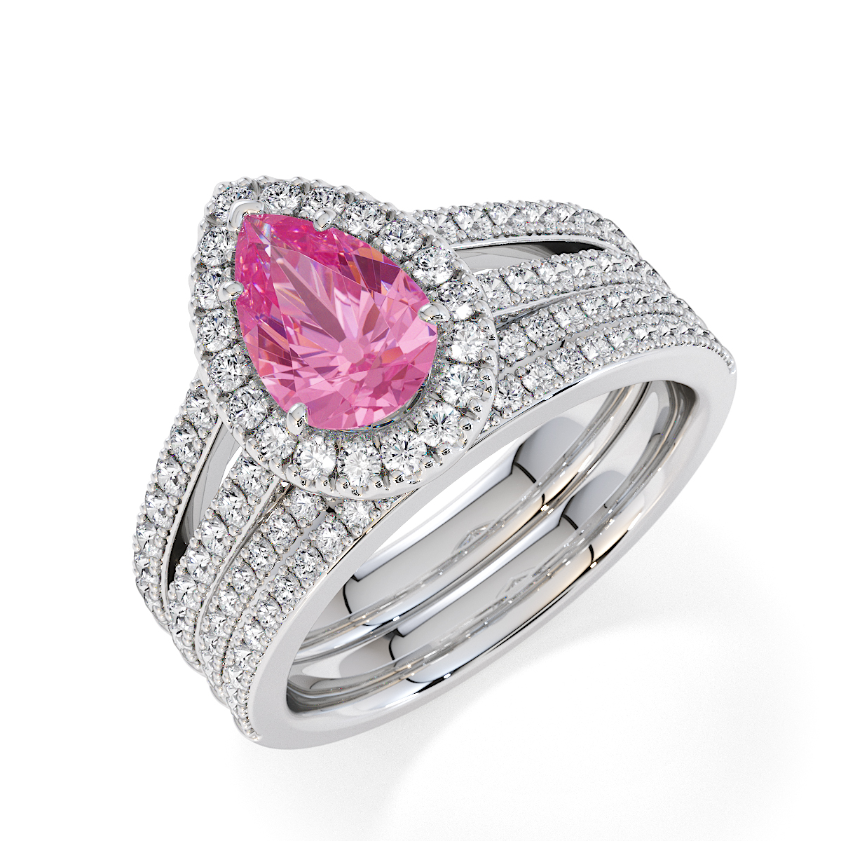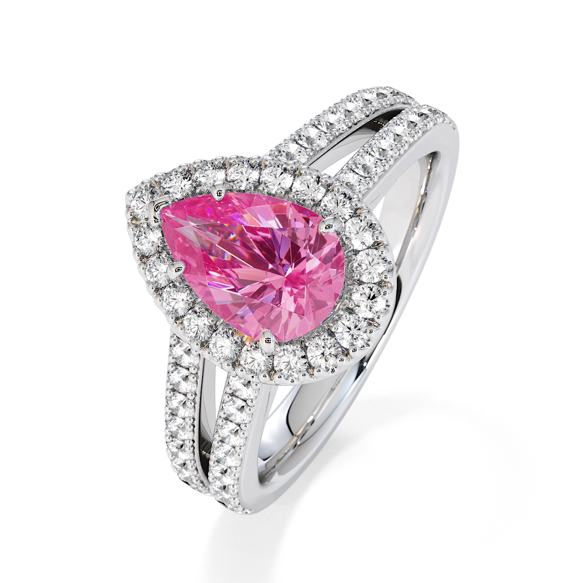 Featuring a gorgeous pear-shaped Pink Sapphire and Diamond Engagement Ring surrounded by a halo of round brilliant stones, the ring is further adorned with prong-set diamonds running up the split shank shoulders. This engagement ring beautifully complements the wedding ring of your choice.