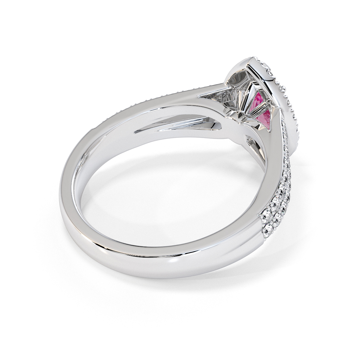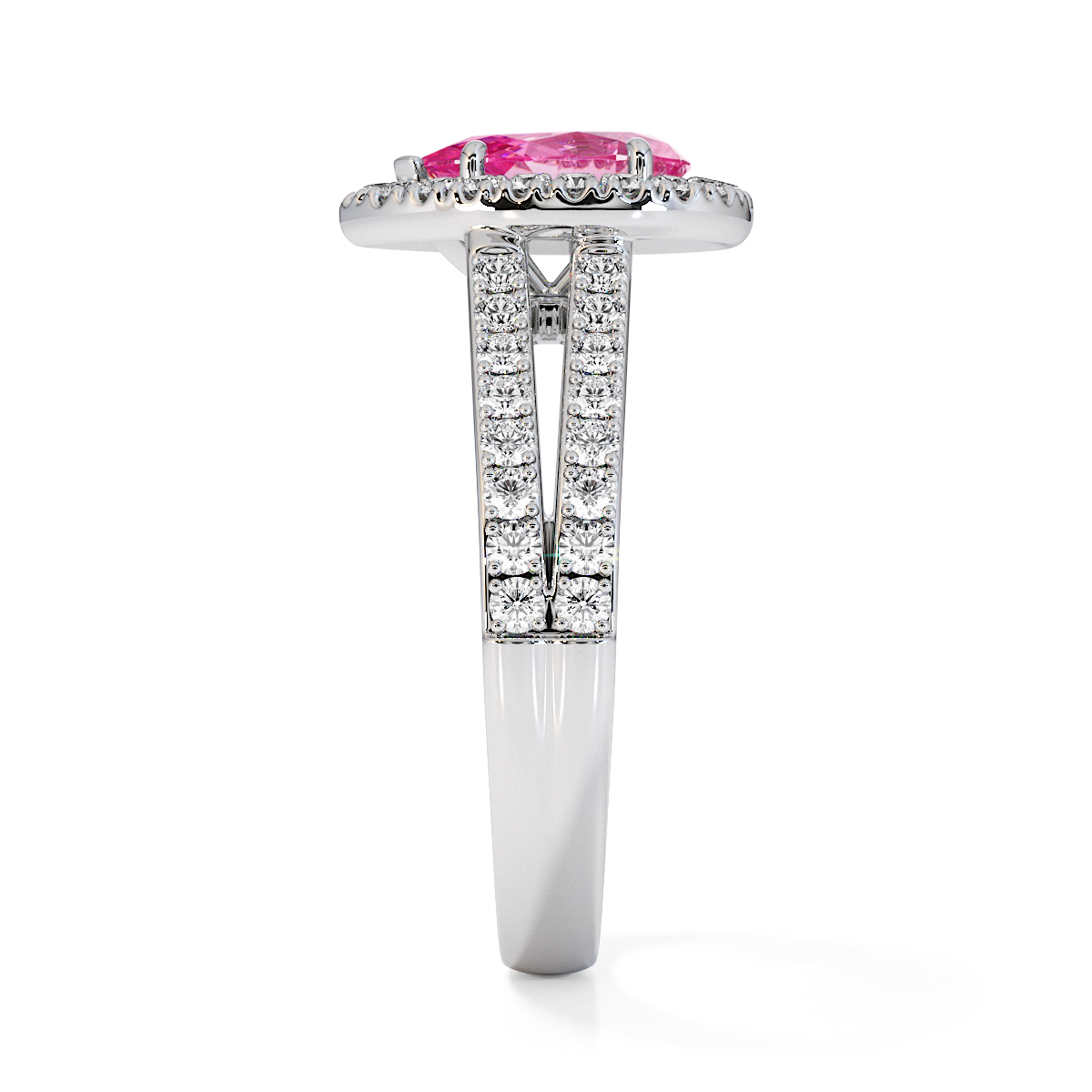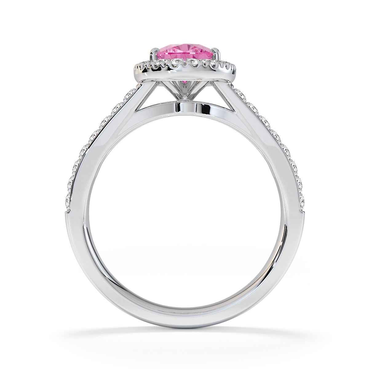 Featuring a gorgeous pear-shaped Pink Sapphire and Diamond Engagement Ring surrounded by a halo of round brilliant stones, the ring is further adorned with prong-set diamonds running up the split shank shoulders. This engagement ring beautifully complements the wedding ring of your choice.