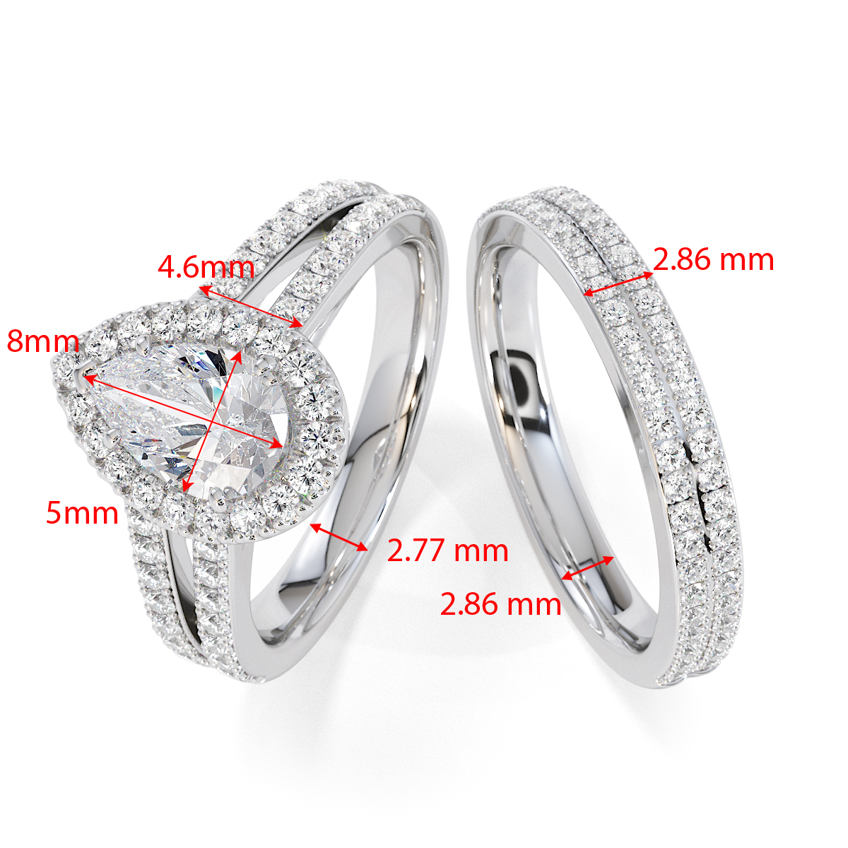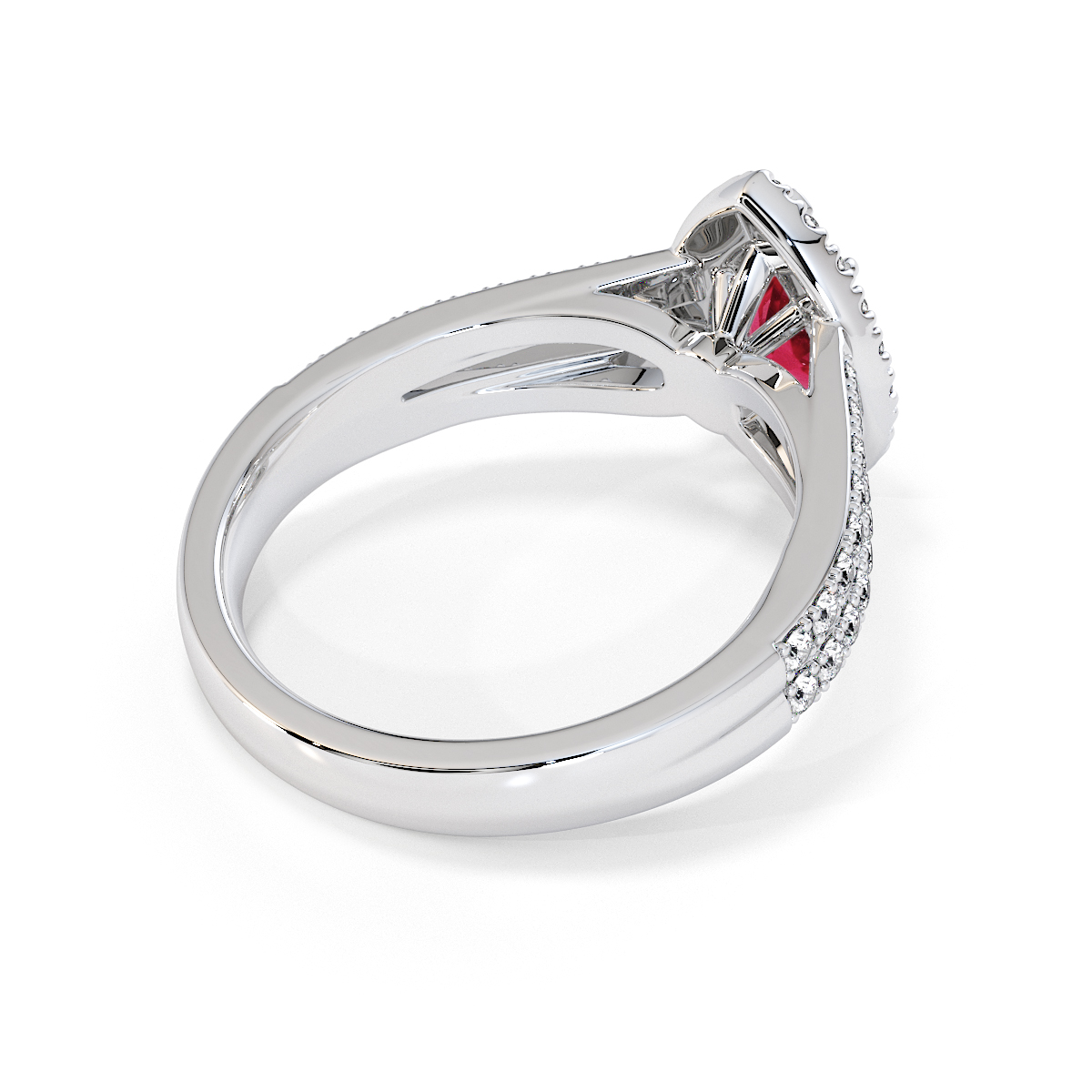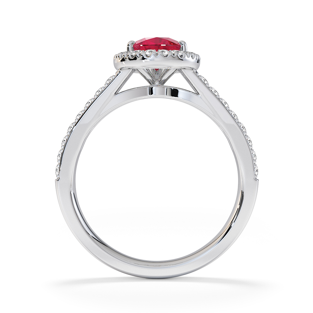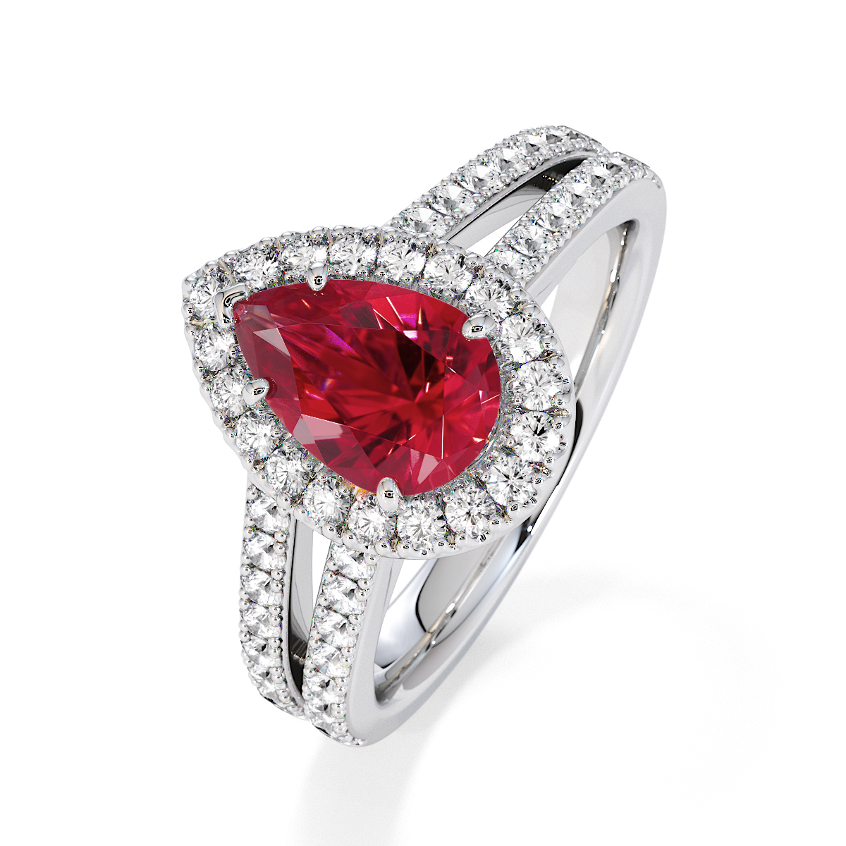 Featuring a gorgeous pear-shaped Ruby and Diamond Engagement Ring surrounded by a halo of round brilliant stones, the ring is further adorned with prong-set diamonds running up the split shank shoulders. This engagement ring beautifully complements the wedding ring of your choice.