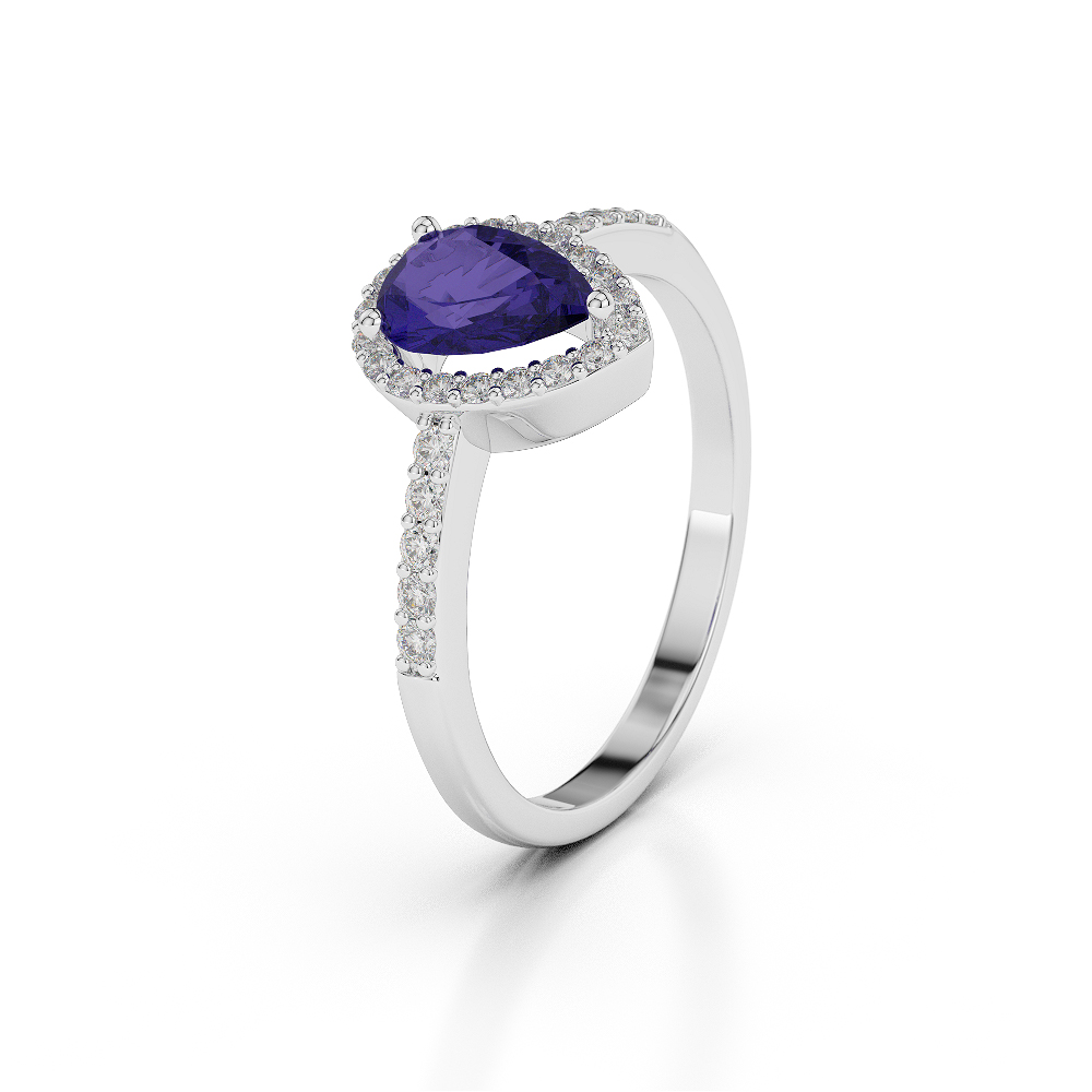 This pear-shaped tanzanite and diamond ring is a stunning masterpiece with a vibrant violet blue hue and exceptional clarity. The tanzanite, prong-set and surrounded by a halo of round-cut diamonds, is further enhanced, elevating its natural beauty. Crafted with meticulous attention to detail, it's perfect for any occasion.