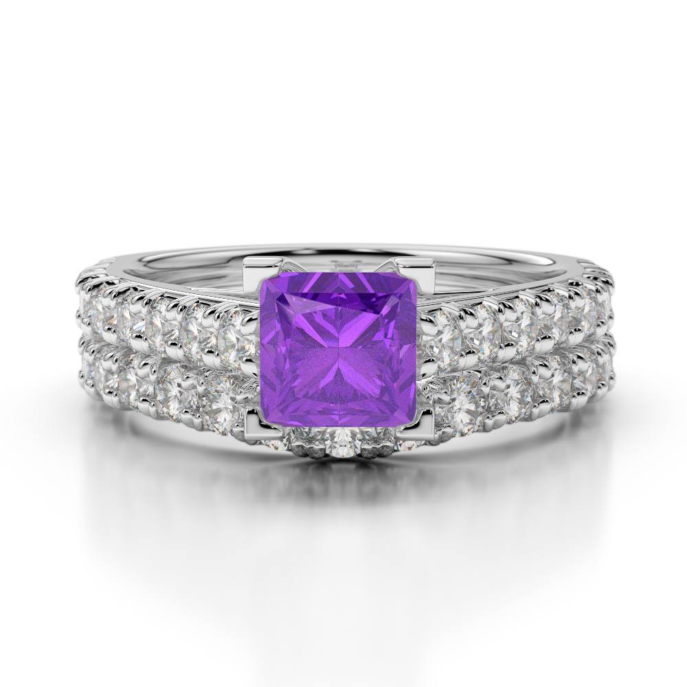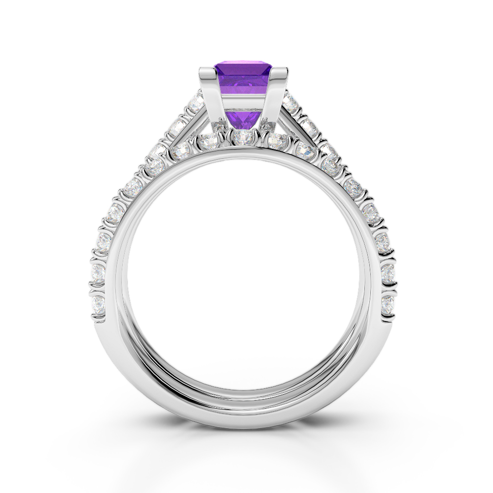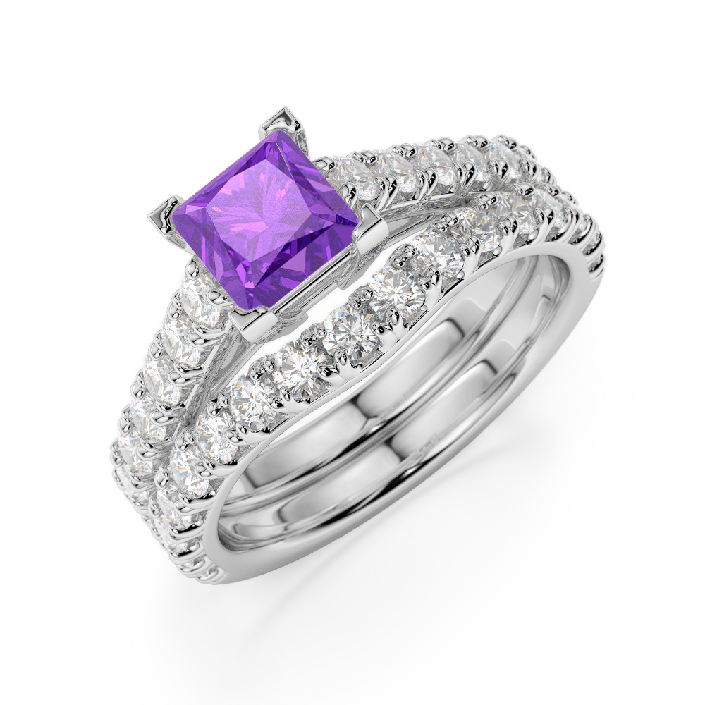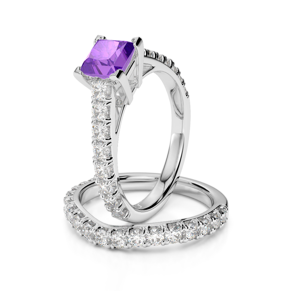 The Bridal Set Ring with Prong Setting is a stunning piece of jewellery featuring beautiful diamond bridal set adorned with princess-cut amethyst. Crafted to symbolise love and commitment, these rings sparkle beautifully and are adorned with a prong setting for maximum security. This cherished treasure will be a perfect way to celebrate your special bond and serve as a cherished treasure for a lifetime.
