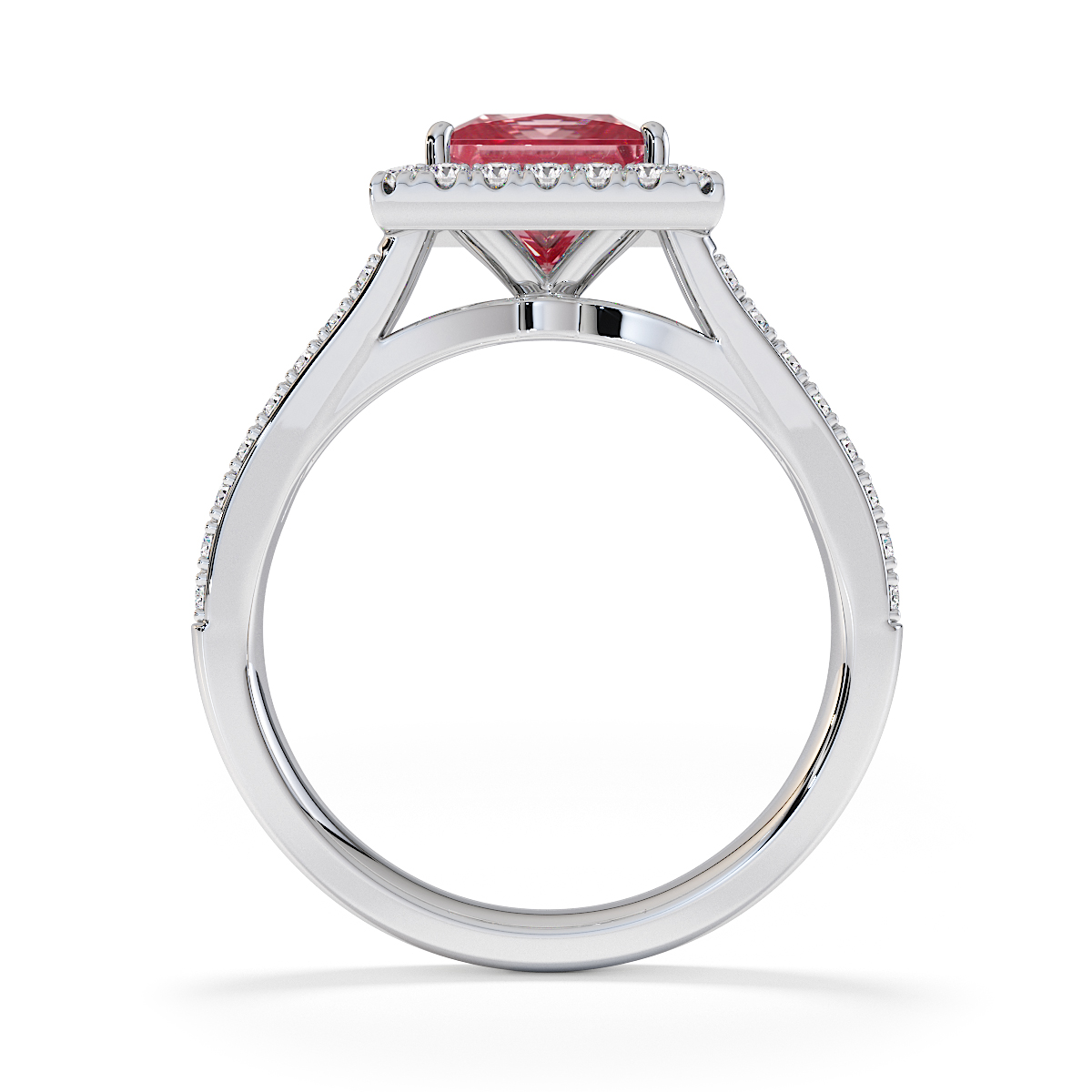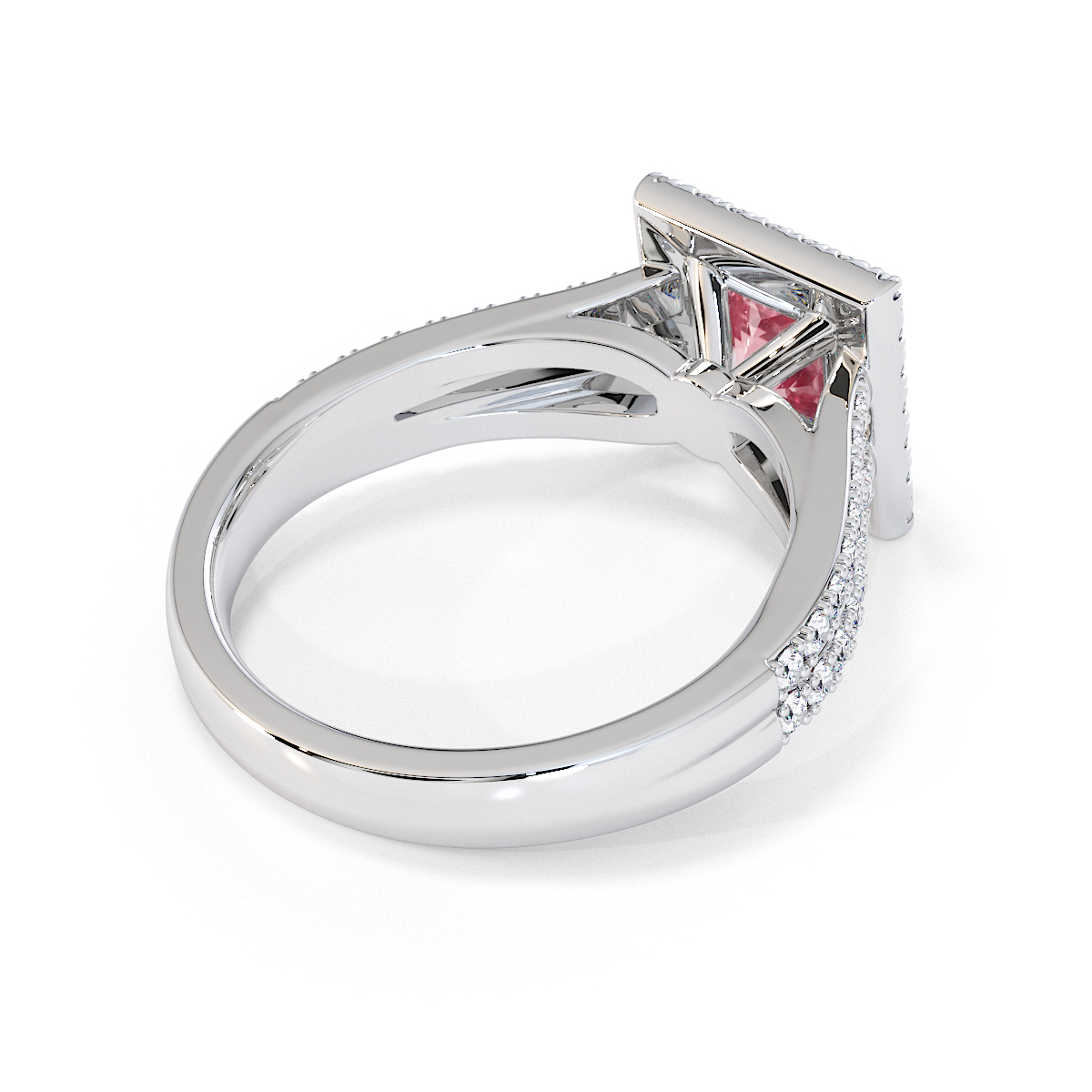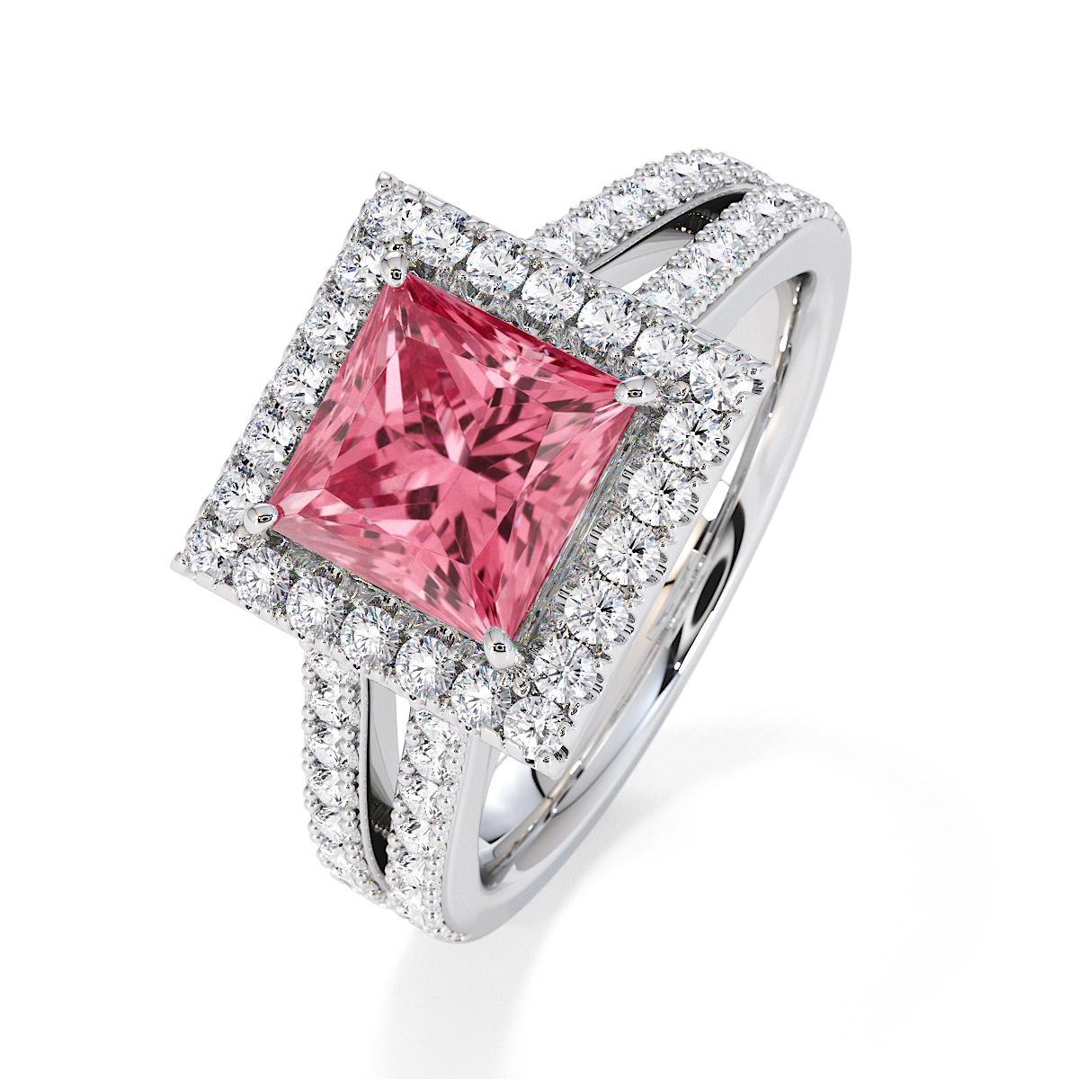 Featuring a gorgeous princess-cut Pink Tourmaline and Diamond Engagement Ring surrounded by a halo of round brilliant stones, the ring is further adorned with prong-set diamonds running up the split shank shoulders. This engagement ring beautifully complements the wedding ring of your choice.