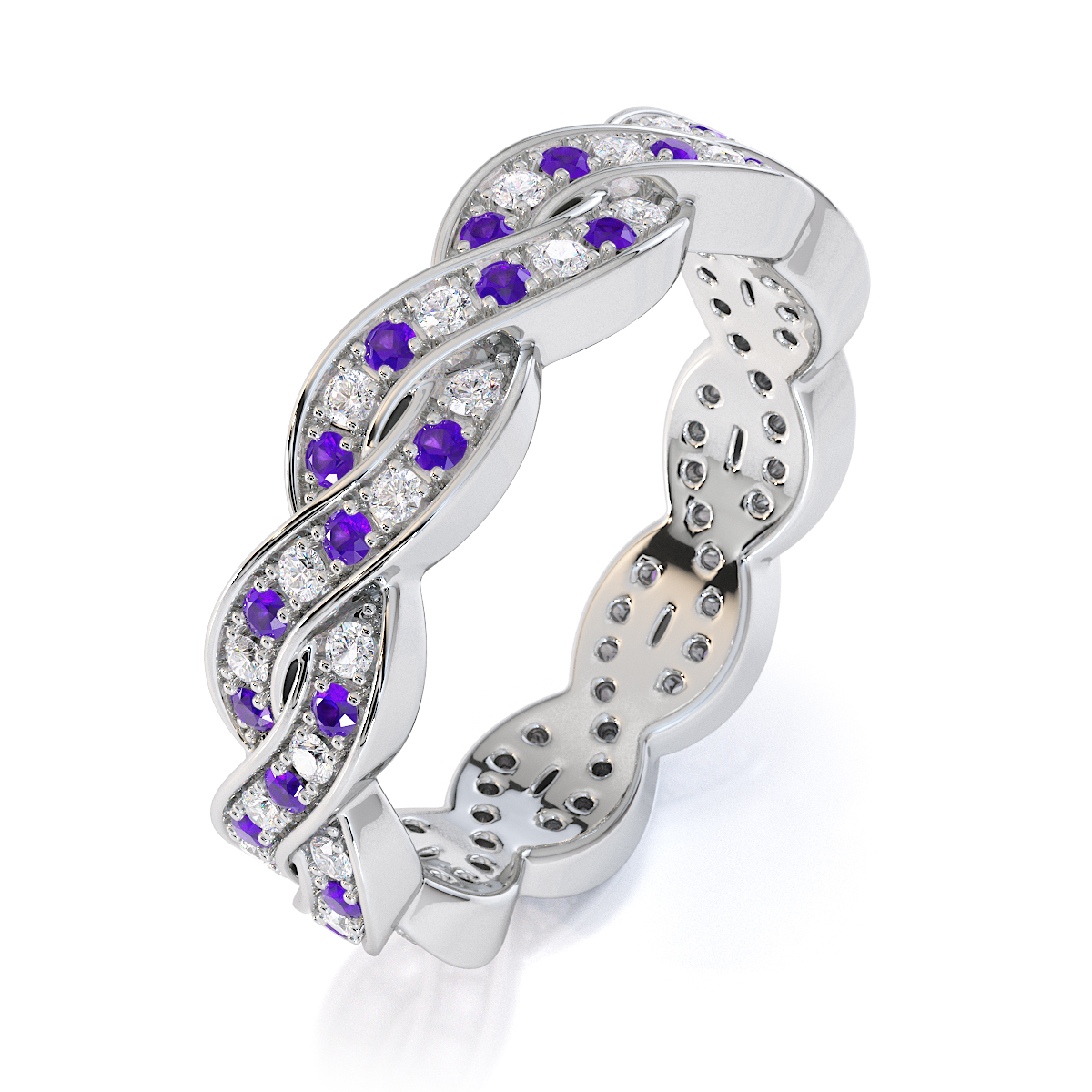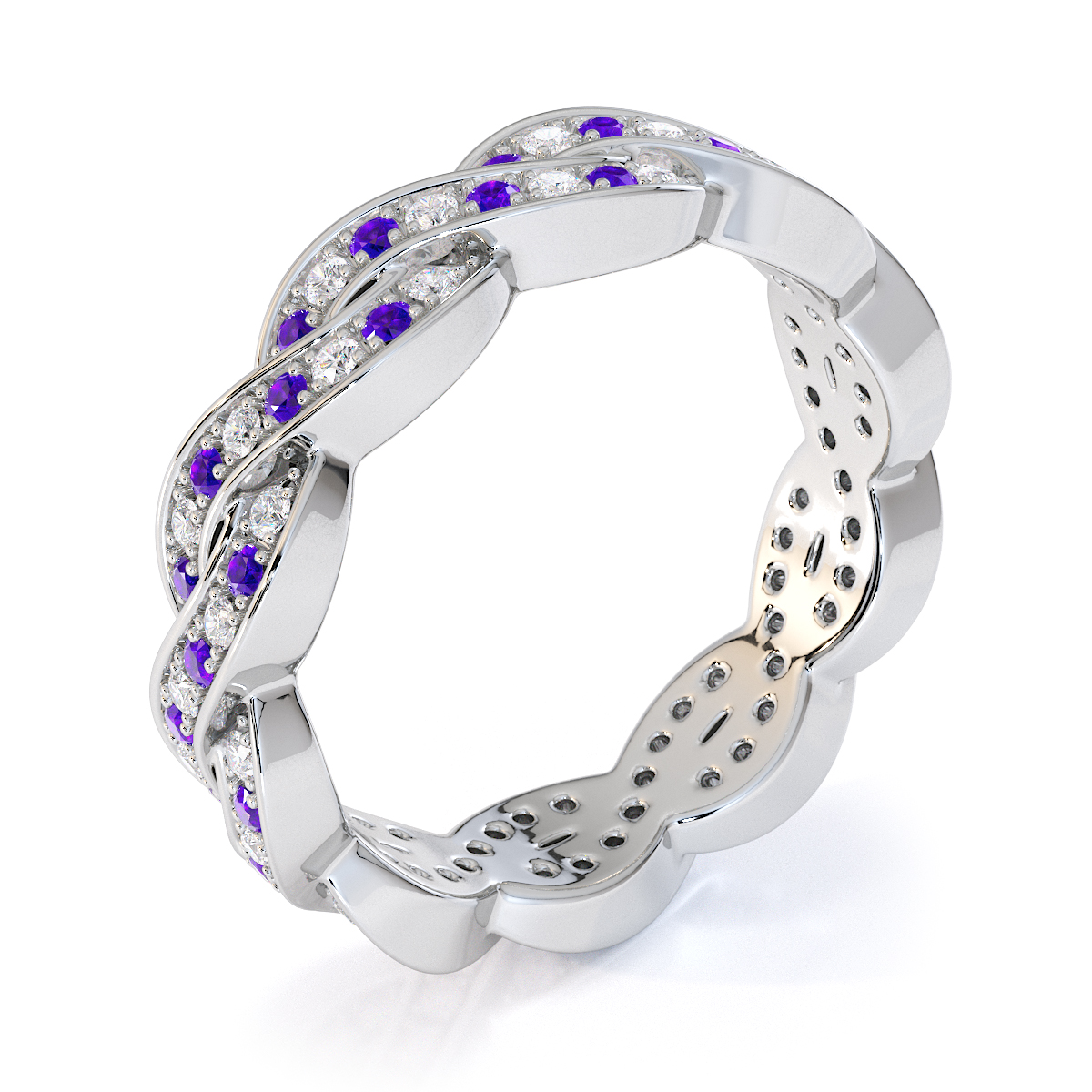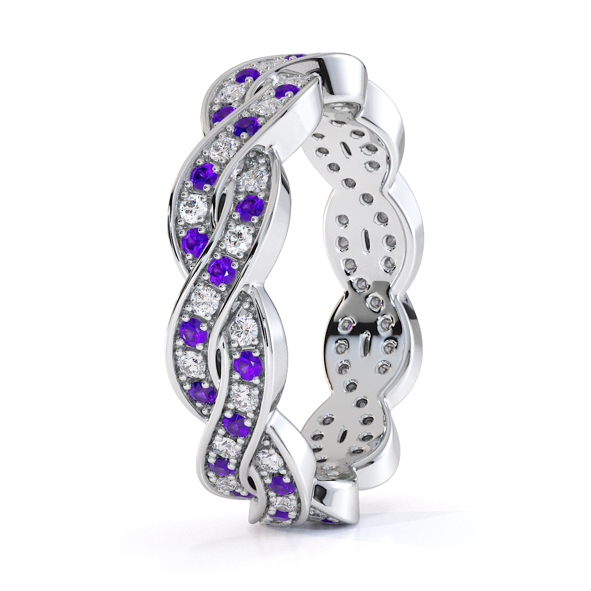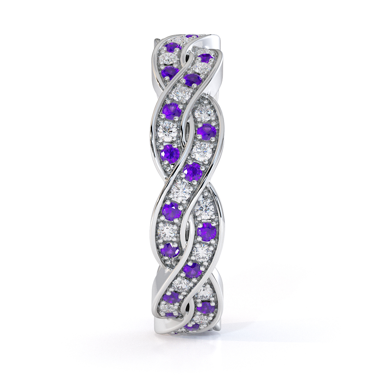 This exquisite full eternity ring features a stunning combination of amethysts and diamonds. The prong setting enhances the brilliance of the gem, creating a luxurious and elegant piece of jewellery perfect for any special occasion.