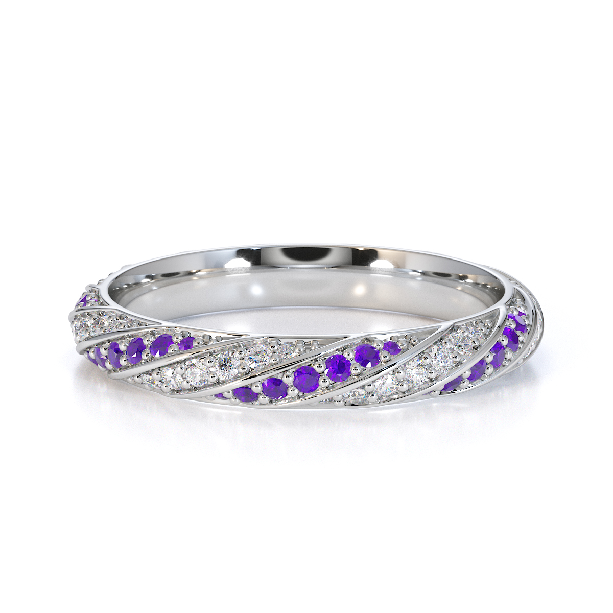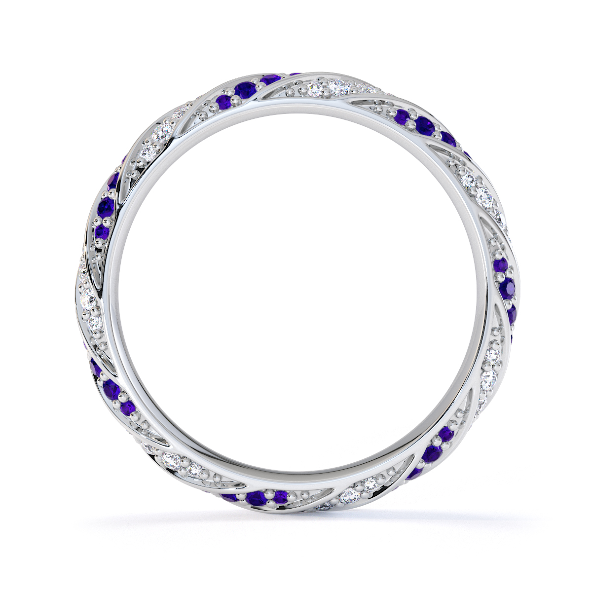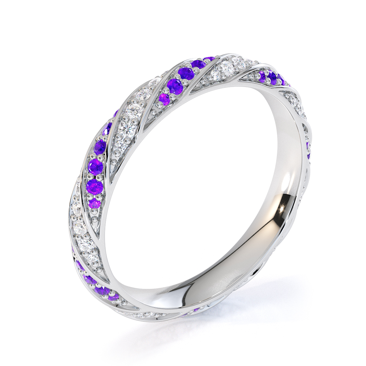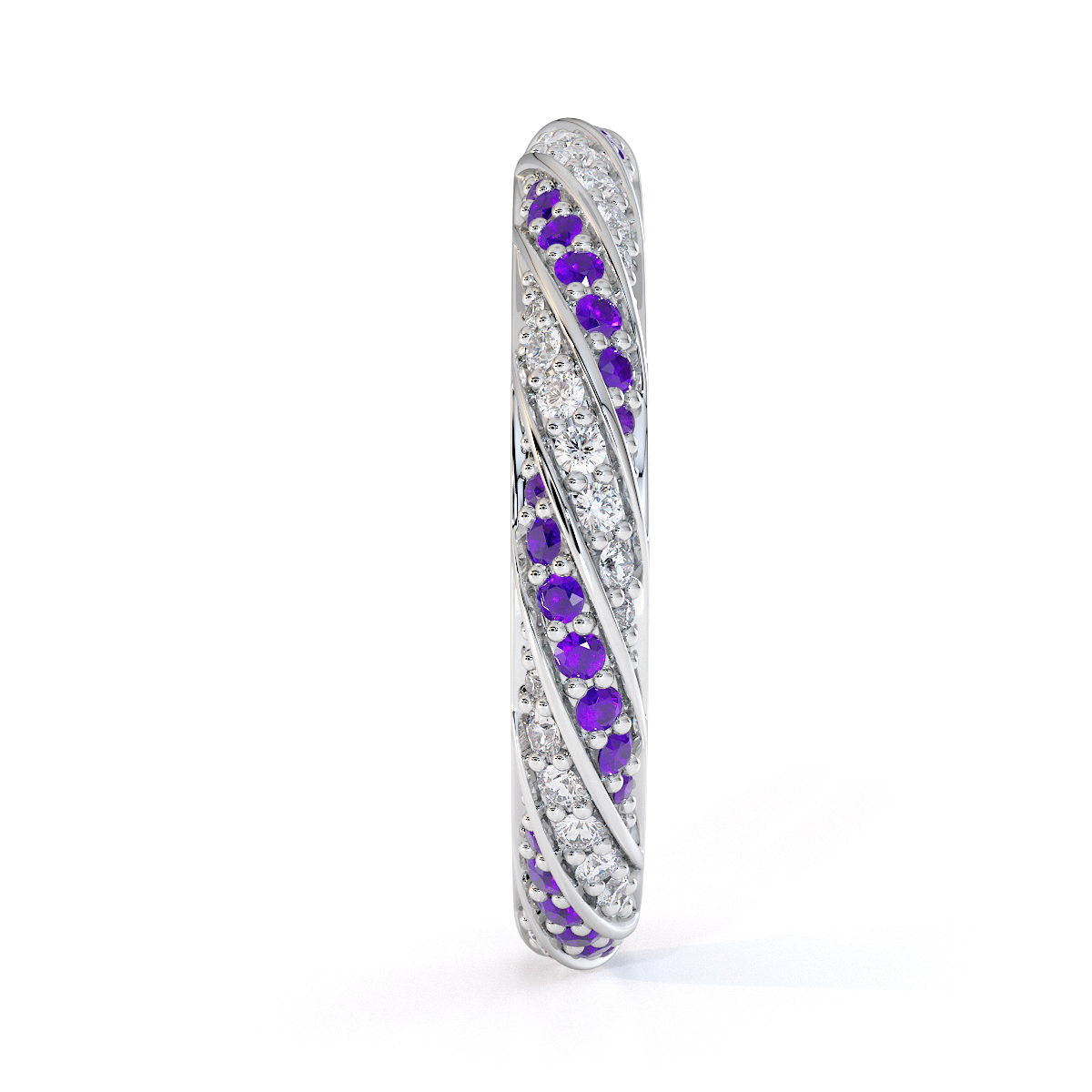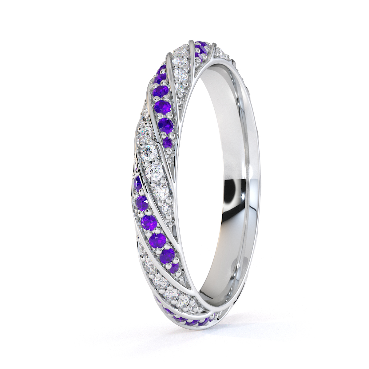 This eternity ring features timeless elegance with amethysts and diamonds, symbolising love and commitment. The full-eternity style, combined with a split prong setting, secures each stone while enhancing their brilliance. This elegant piece adds sophistication to any bride’s ensemble on her special day.