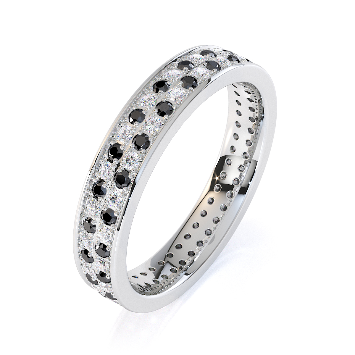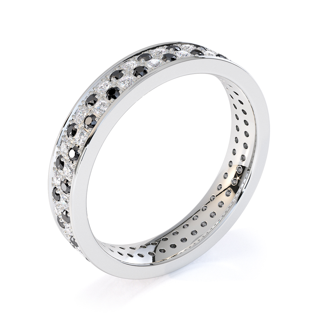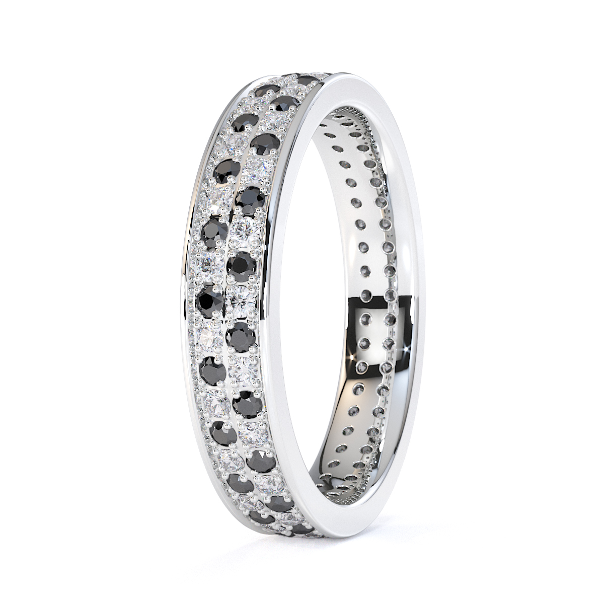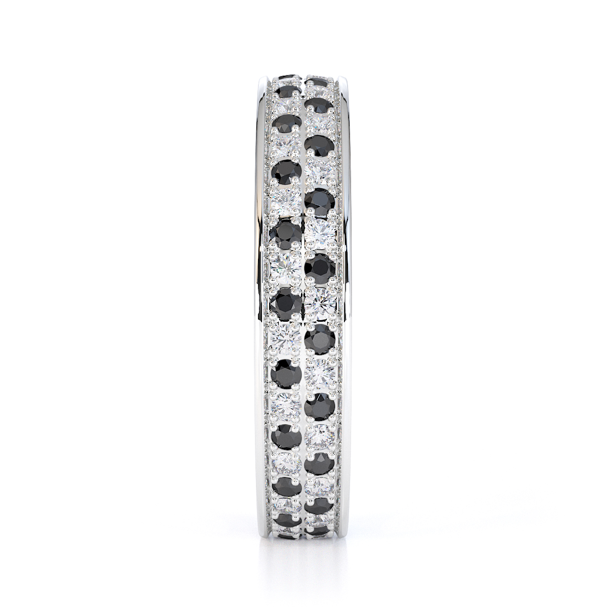 This eternity ring features a stunning combination of black diamonds and diamonds, creating a sophisticated and enchanting design. With a split prong setting, the gem are securely held in place, symbolising love and dedication. The vibrant black diamonds and dazzling diamonds come together to form an exceptional piece of jewellery.