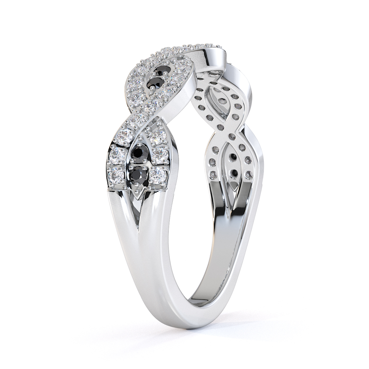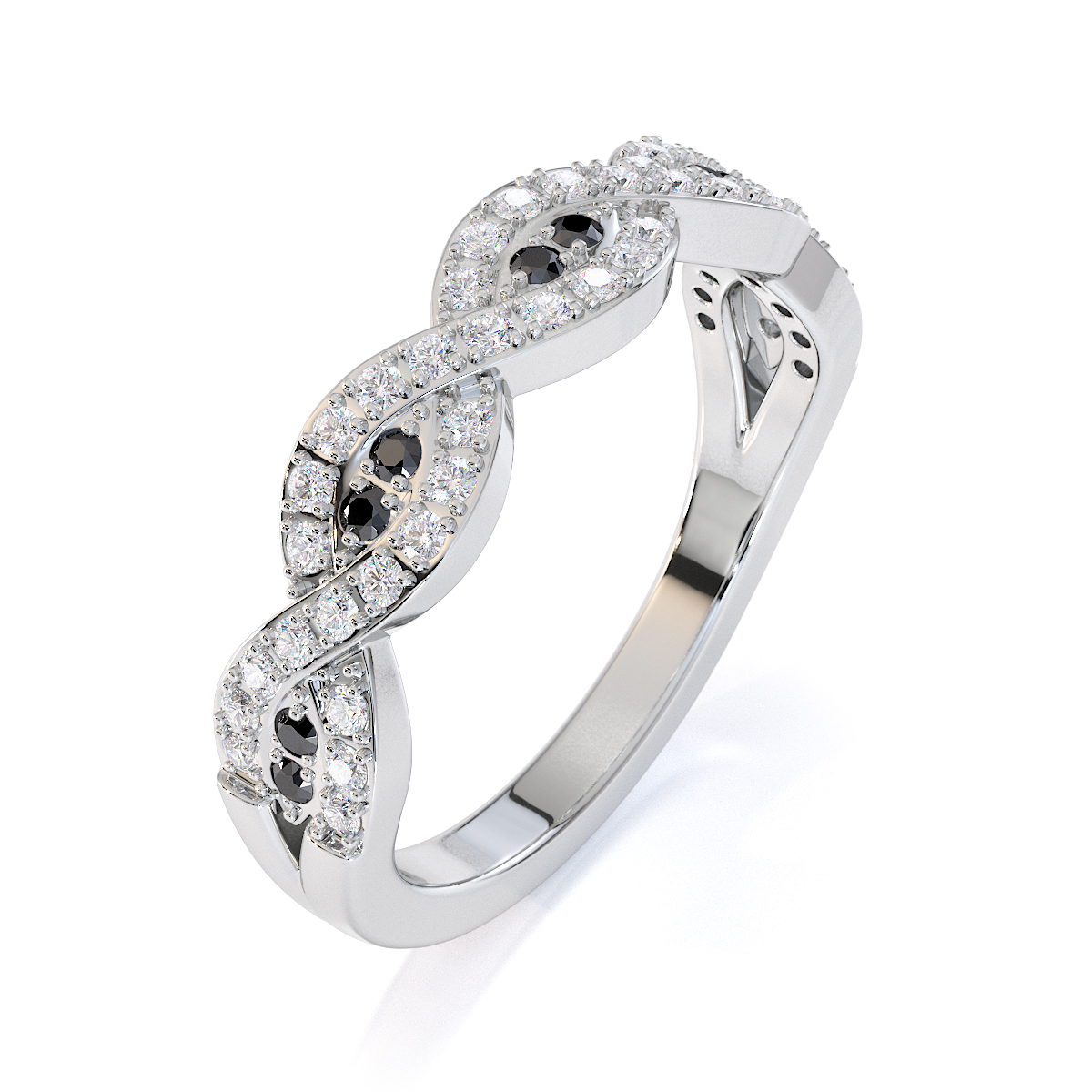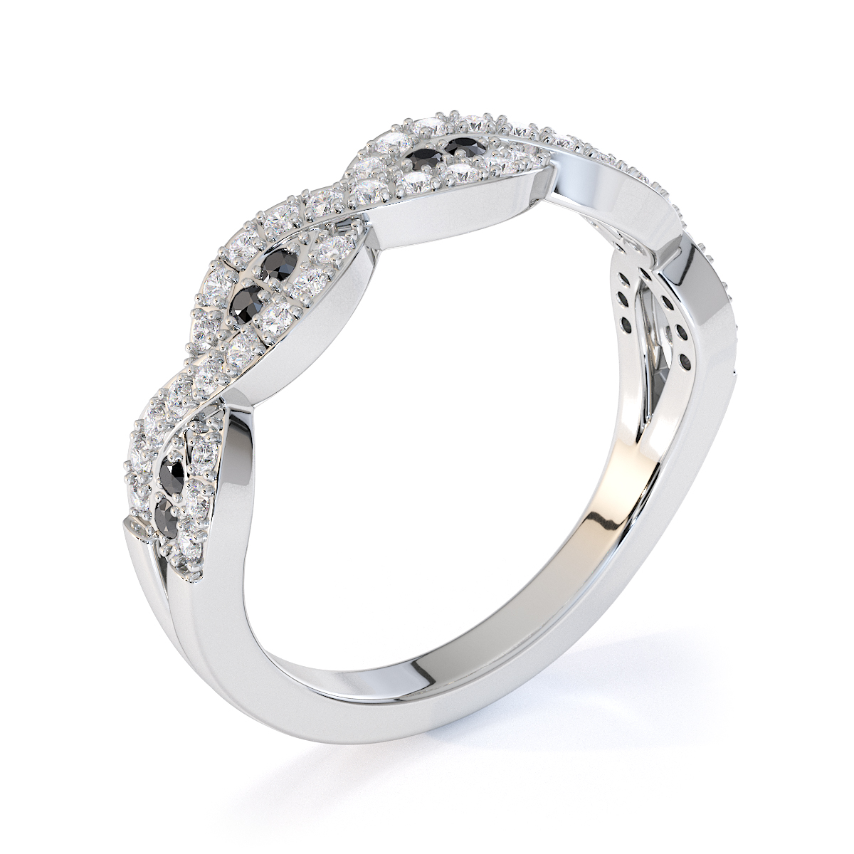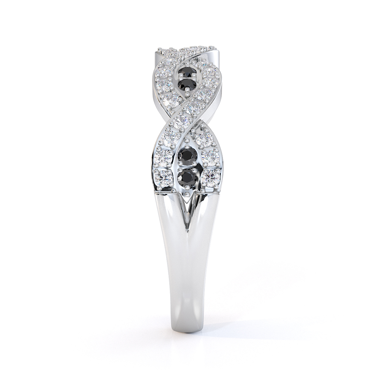 This exquisite half eternity ring features a stunning combination of diamonds and black diamonds, set in a classic prong setting. The timeless design of this ring makes it a perfect choice for symbolising everlasting love and commitment. Crafted with precision and attention to detail, this ring is sure to be a cherished piece for years to come.