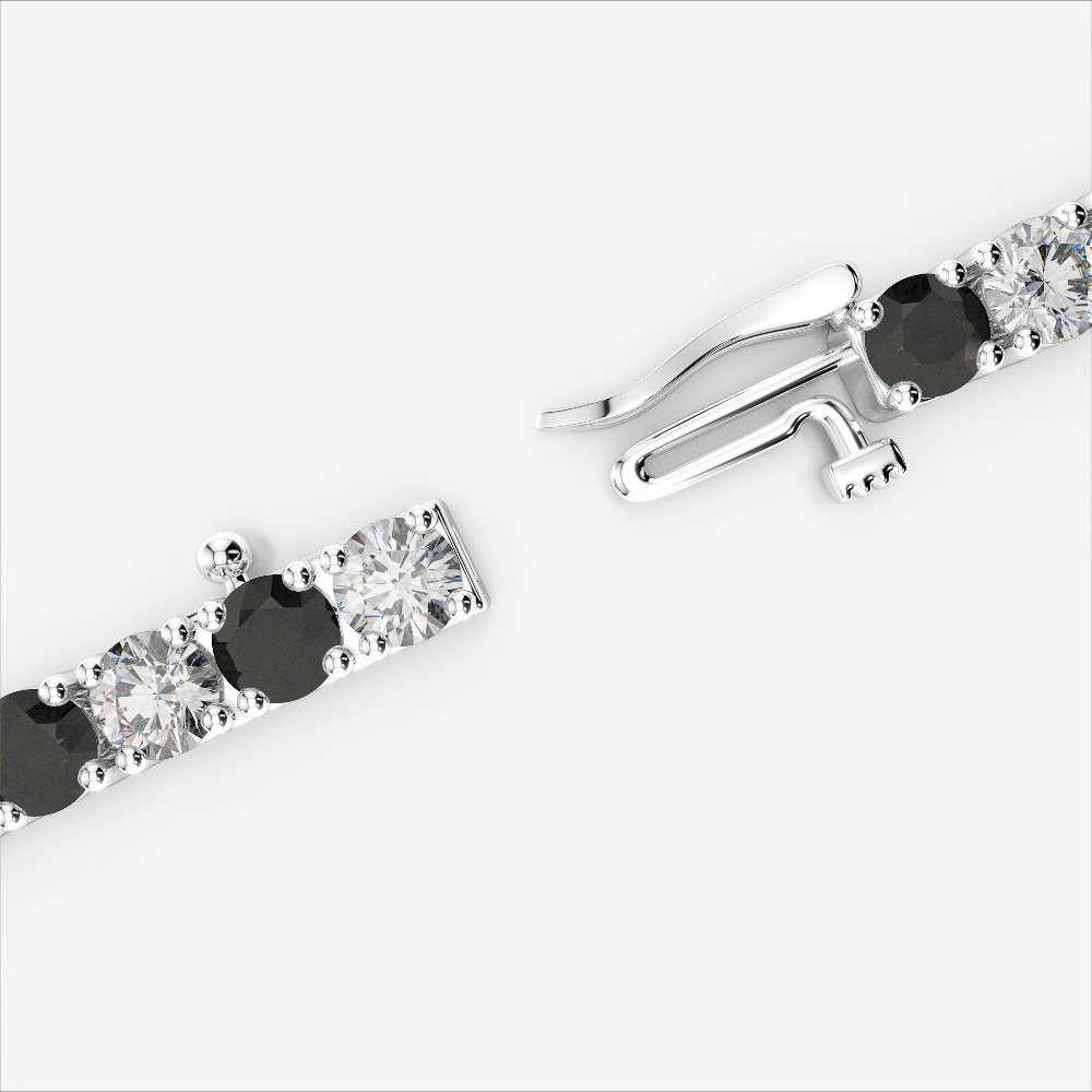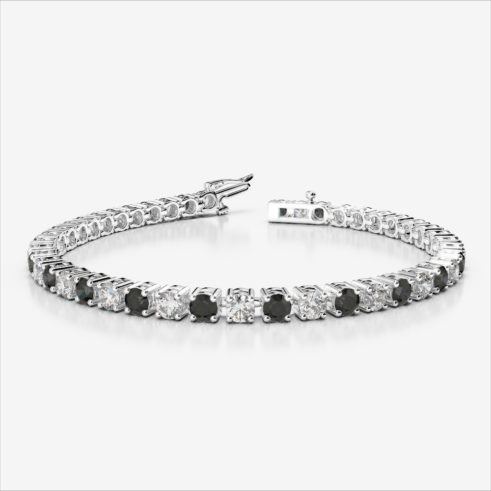 Add timeless charm to your collection with our prong-set round-cut black diamond and diamond tennis bracelet. Carefully crafted, each stone sparkles with brilliance and depth. The bold black diamond contrasts beautifully against the clear diamonds, creating a refined aesthetic. This elegant piece is perfect for celebrating milestones or simply indulging in everyday luxury. A true symbol of style and sentiment.