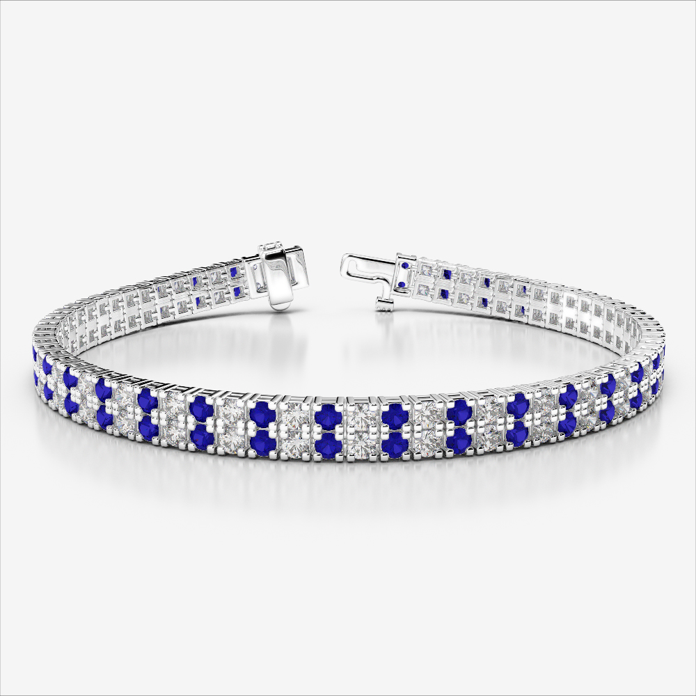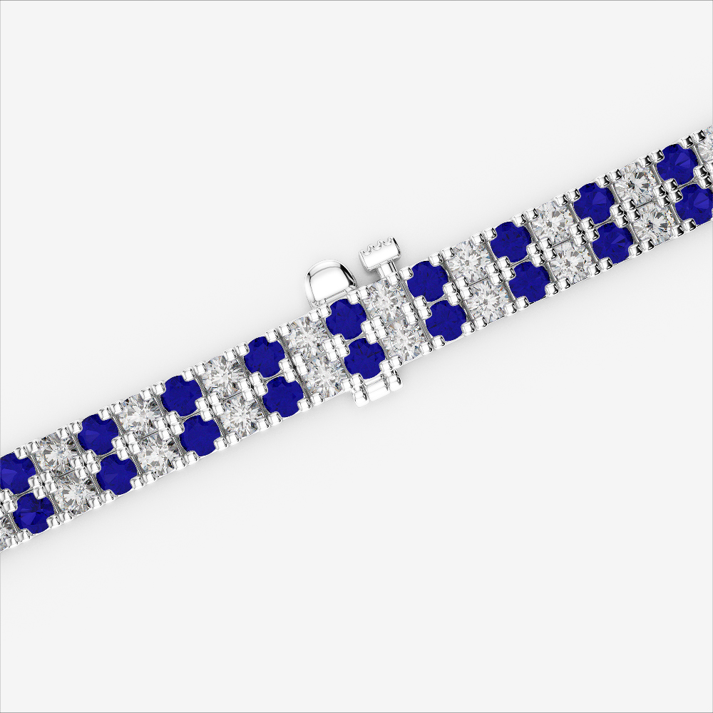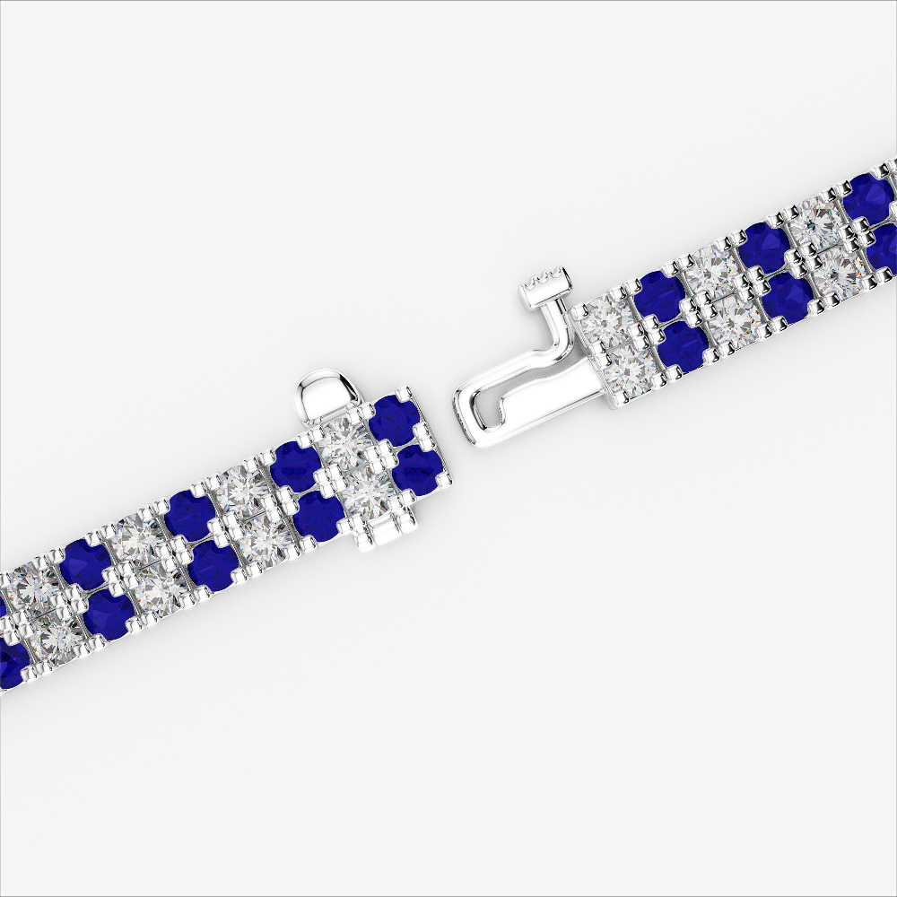 Crafted to the highest standards, this Double Row Prong Set Blue Sapphire and diamond bracelet showcases the harmonious blend of blue sapphire’s richness and diamond’s sparkle. Prong-set round-cut stones ensure exceptional brilliance and sophistication. Perfect for formal events or commemorating milestones, it exemplifies timeless luxury.