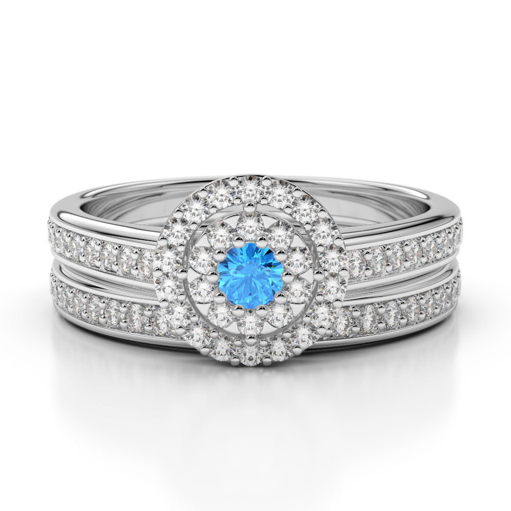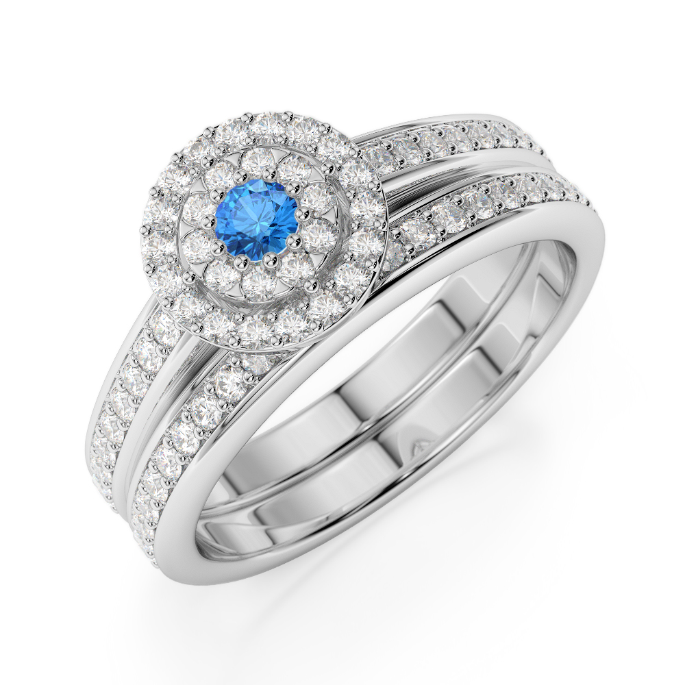 Introducing our exquisite Bridal Set Ring with Prong Setting, featuring a stunning diamond halo ring set with a brilliant blue topaz center. Crafted with utmost precision and attention to detail, this ring exudes elegance and sophistication. The prong setting ensures maximum security and allows the diamonds to shine brilliantly, capturing the light from every angle. Perfect for engagements or special occasions, this blue topaz with diamond halo ring set is a timeless symbol of love and commitment.