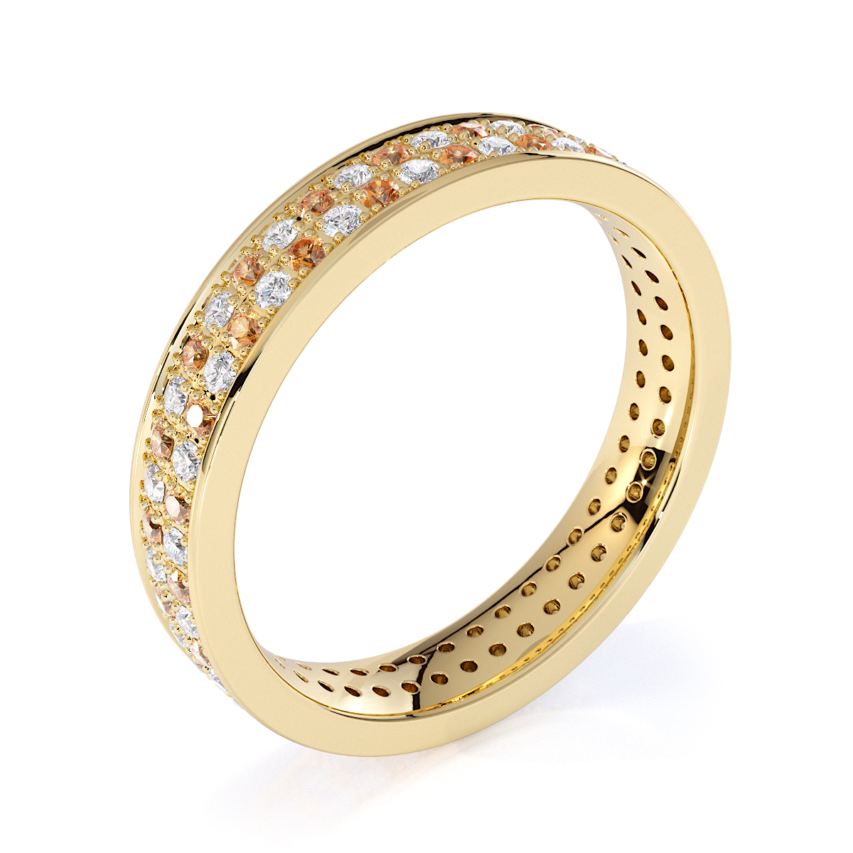 This eternity ring features a stunning combination of citrines and diamonds, creating a sophisticated and enchanting design. With a split prong setting, the gem are securely held in place, symbolising love and dedication. The vibrant citrines and dazzling diamonds come together to form an exceptional piece of jewellery.