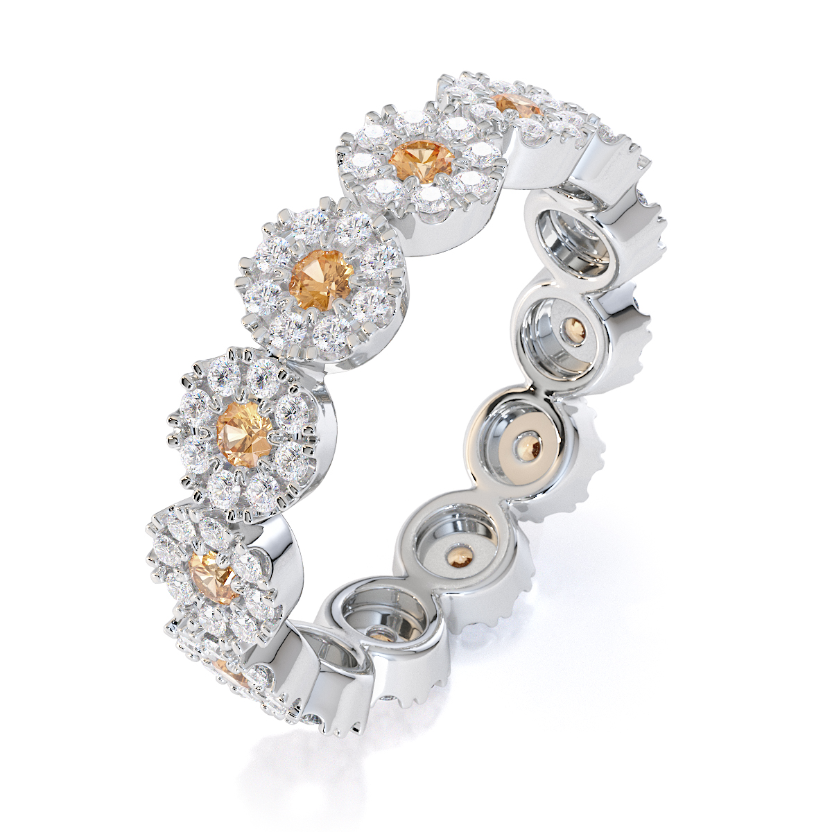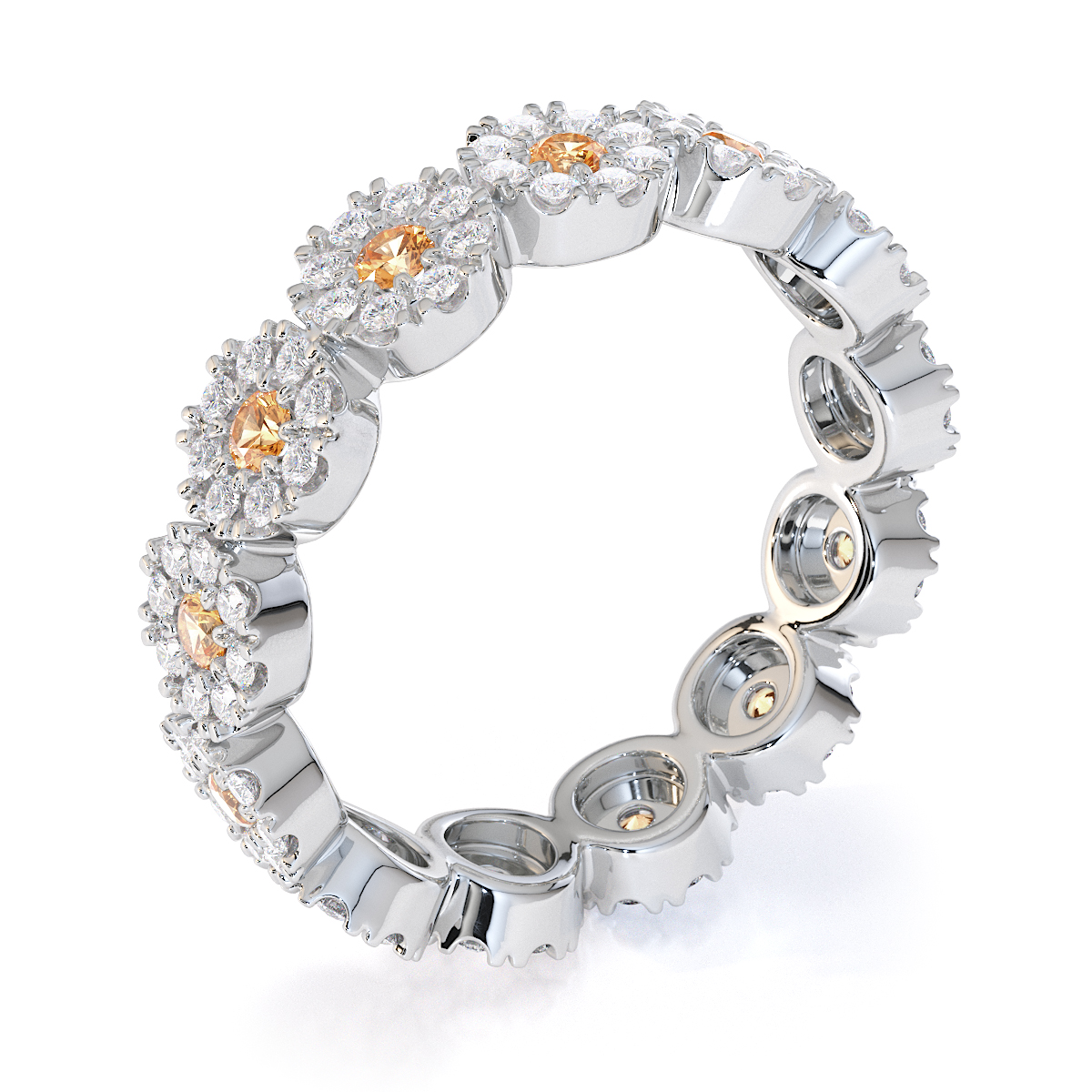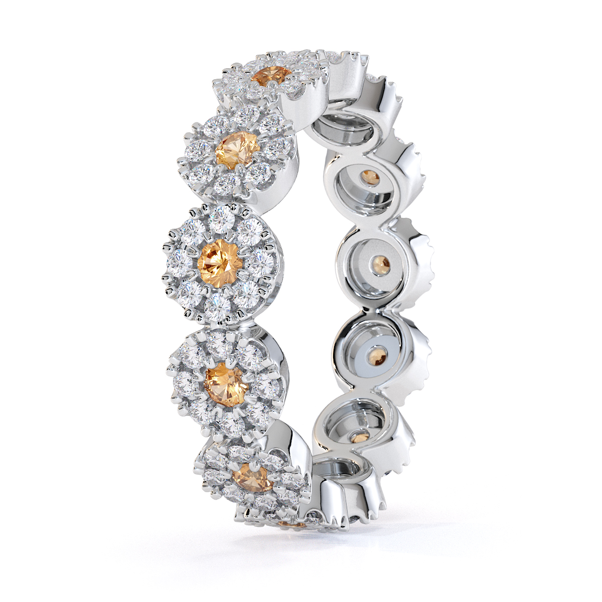 This eternity ring features timeless elegance with citrines and diamonds, symbolising love and commitment. The full-eternity style, combined with a split prong setting, secures each stone while enhancing their brilliance. This elegant piece adds sophistication to any bride’s ensemble on her special day.