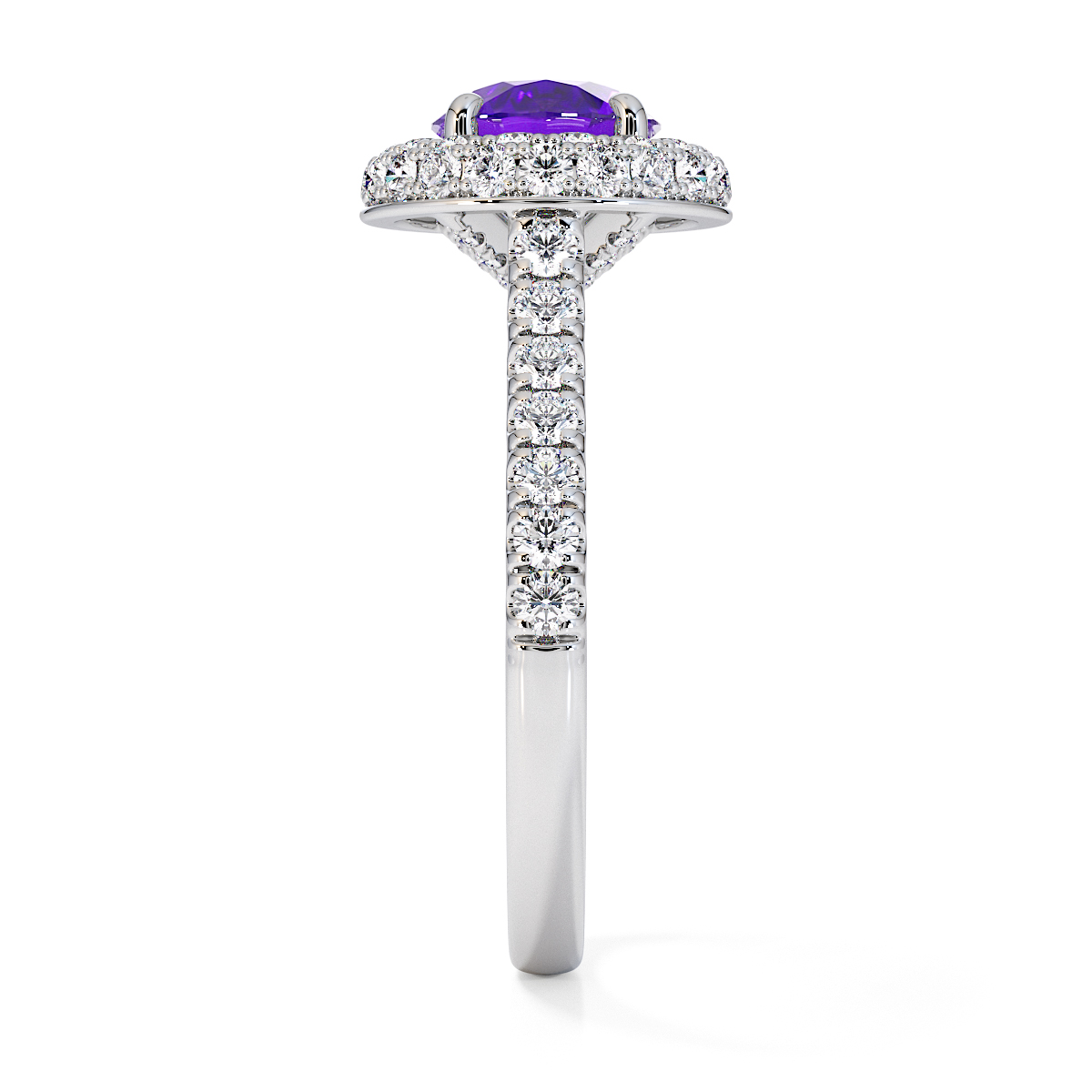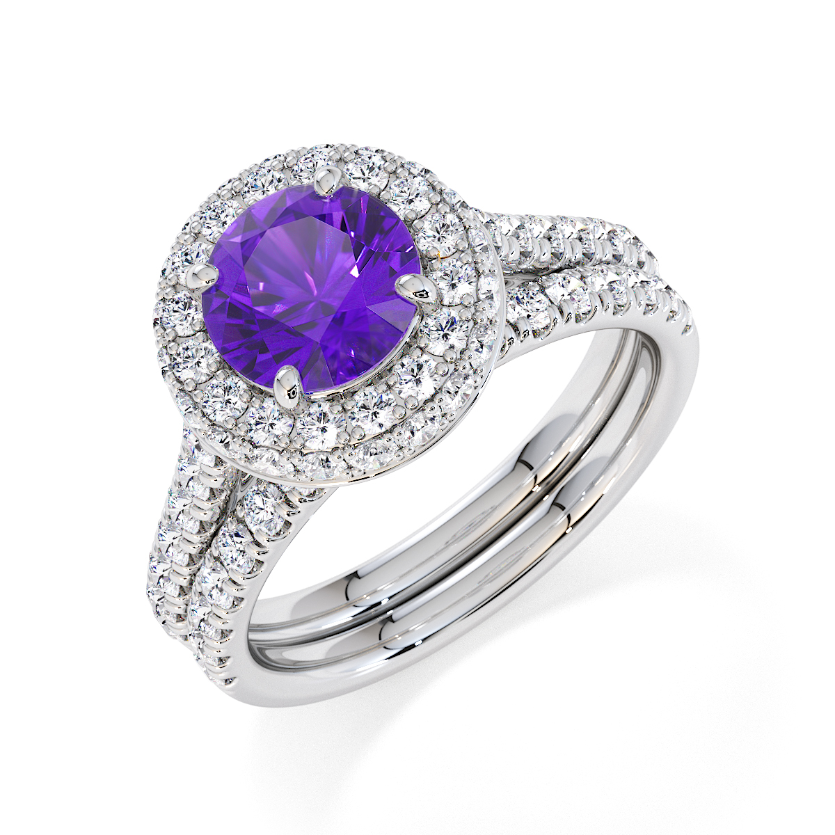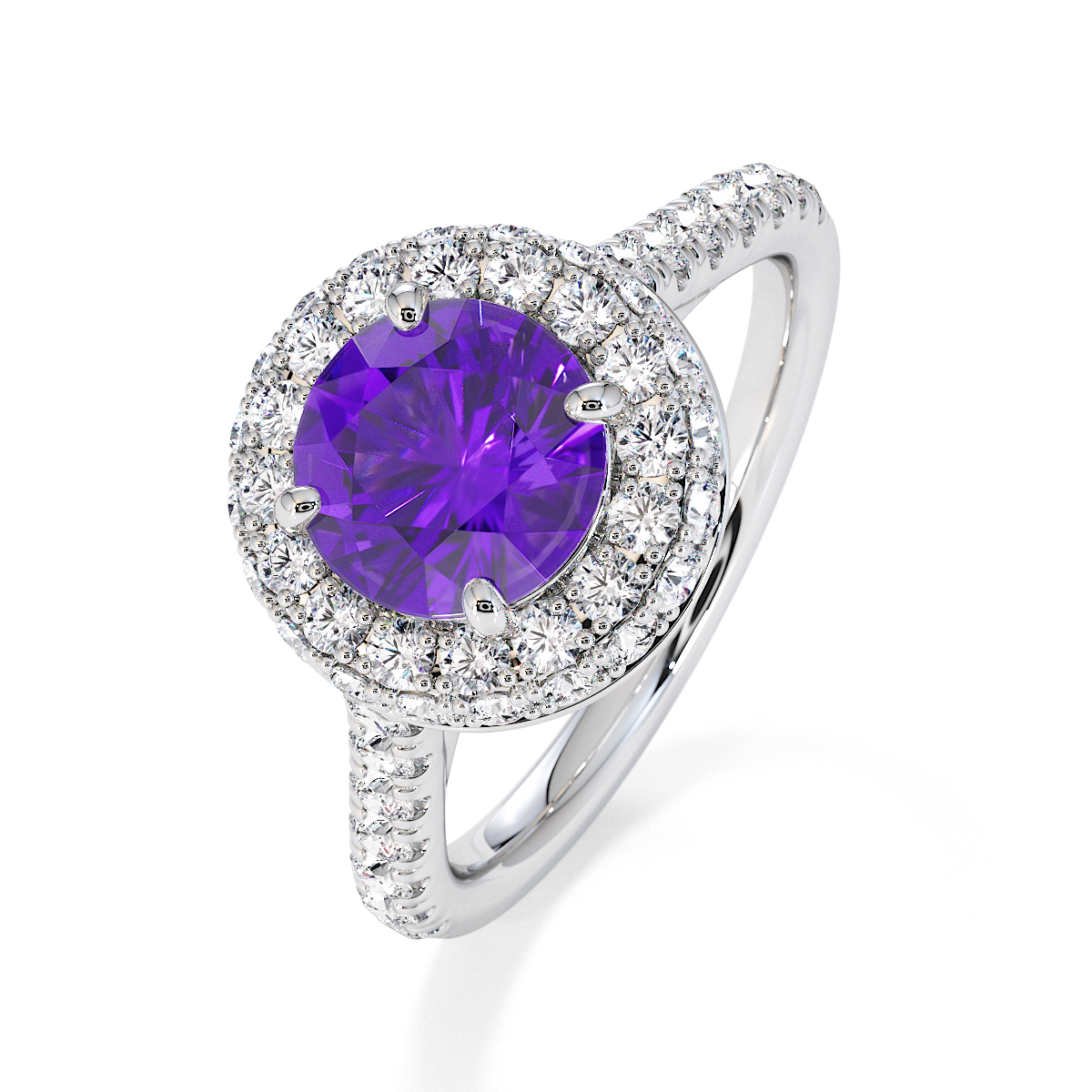 We are presenting our stunning round cut Amethyst and Diamond Engagement Ring, showcasing a halo design and prong-set stones for exceptional brilliance.