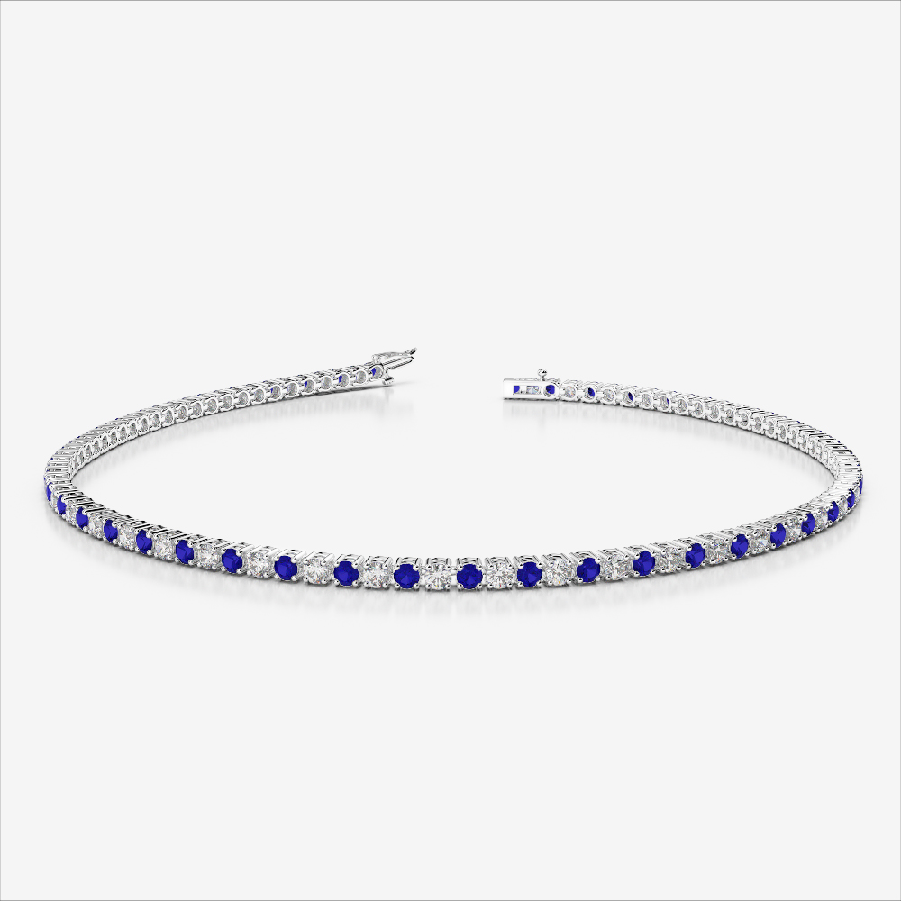 Crafted for those who cherish elegance, this round-cut tennis bracelet features glowing blue sapphires and dazzling diamonds. A perfect luxury piece for you or a loved one.