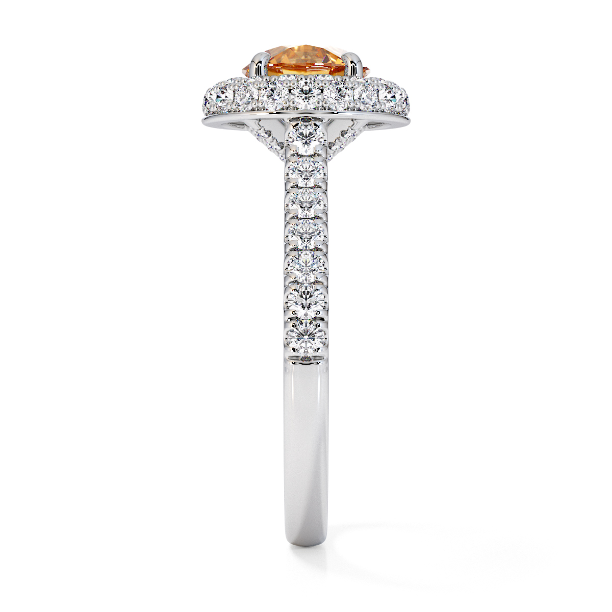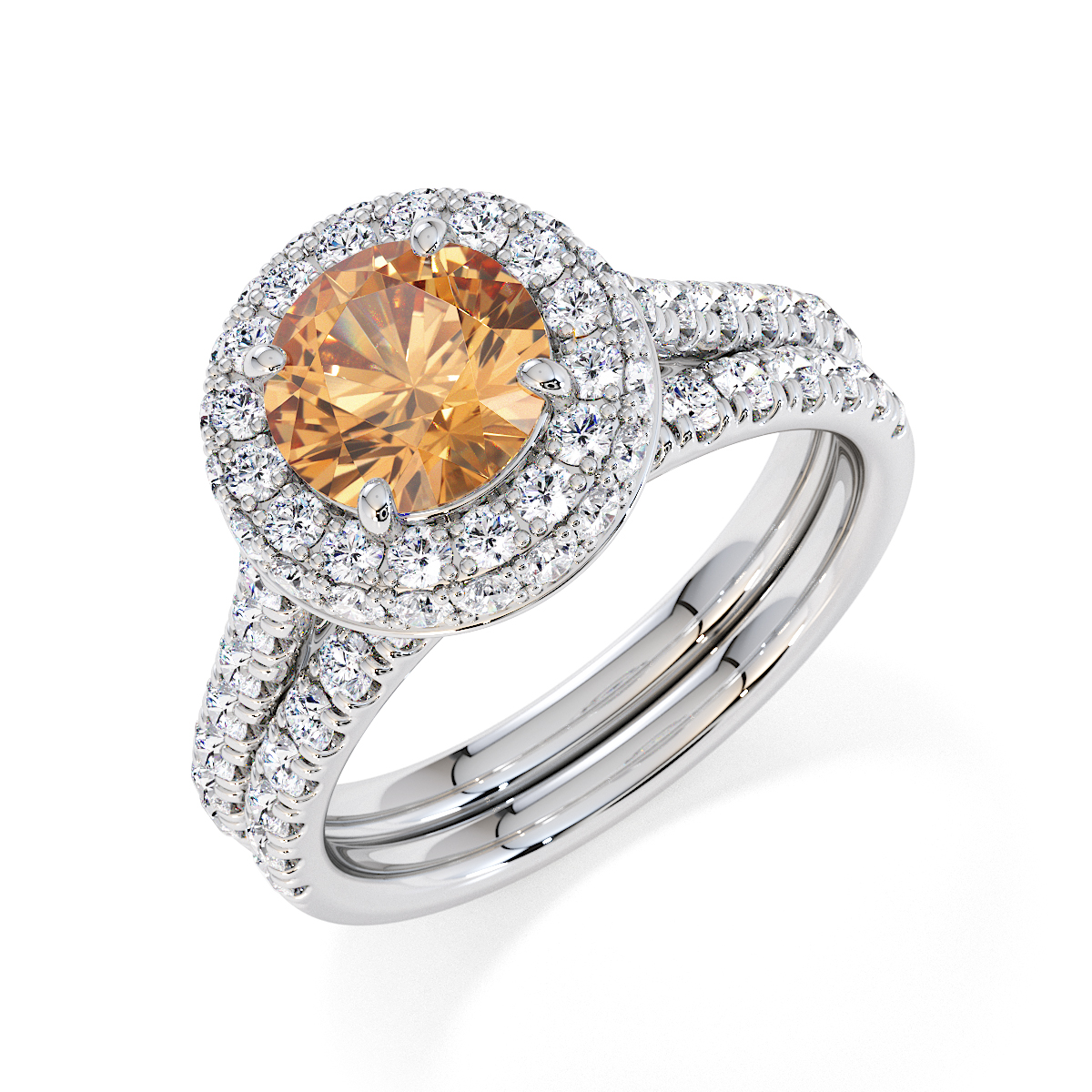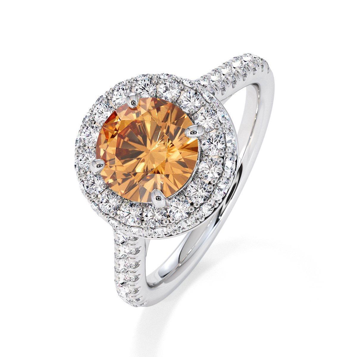 We are presenting our stunning round cut Citrine and Diamond Engagement Ring, showcasing a halo design and prong-set stones for exceptional brilliance.