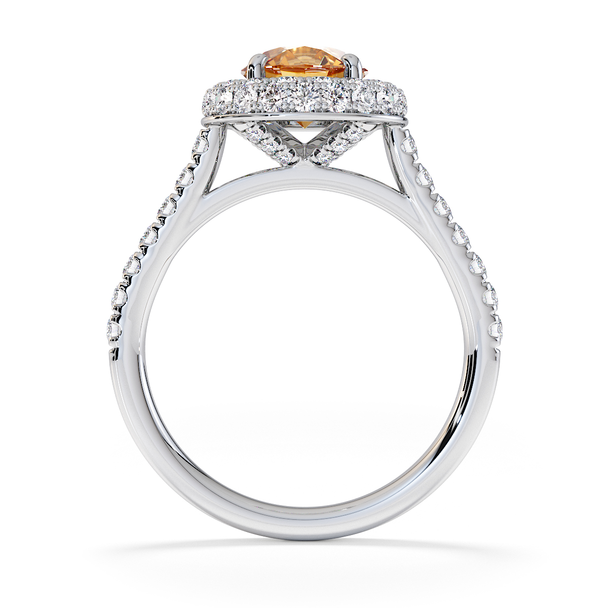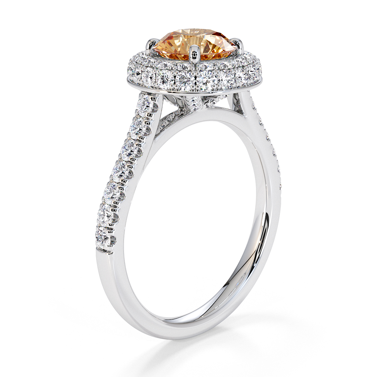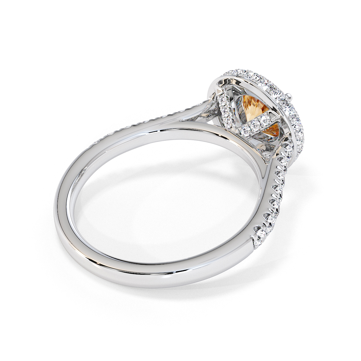 We are presenting our stunning round cut Citrine and Diamond Engagement Ring, showcasing a halo design and prong-set stones for exceptional brilliance.