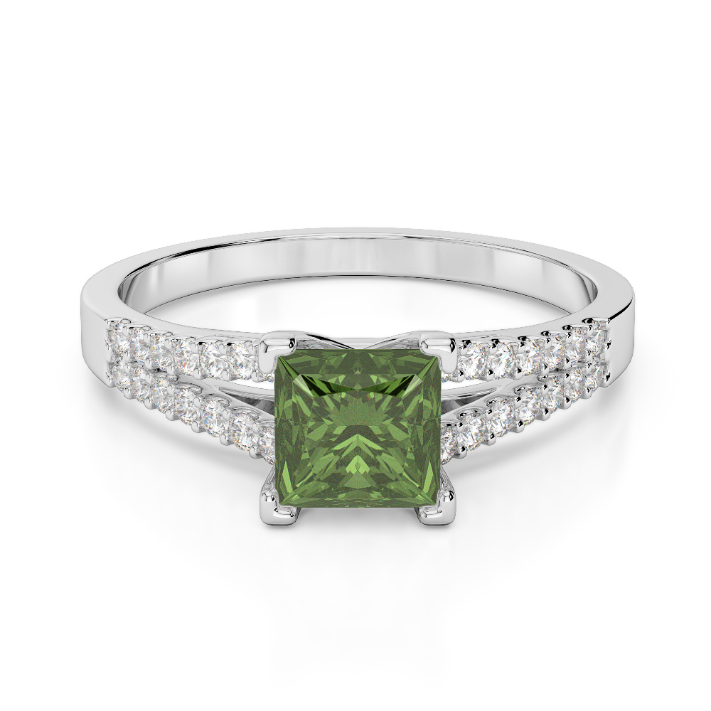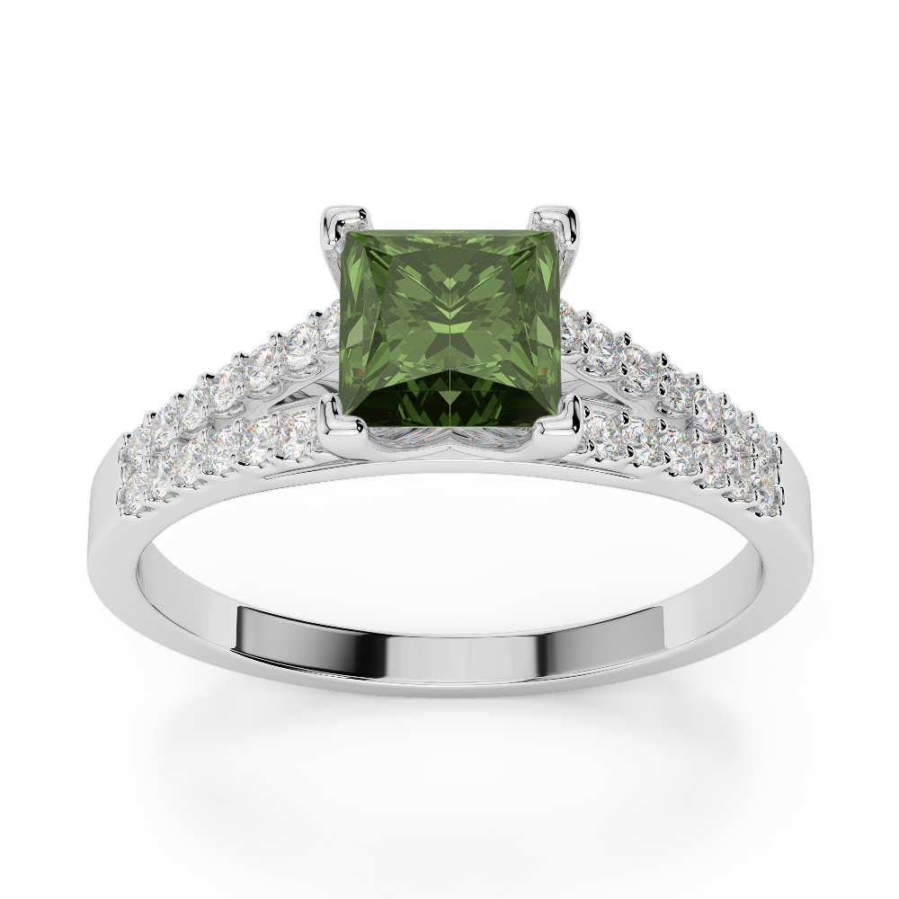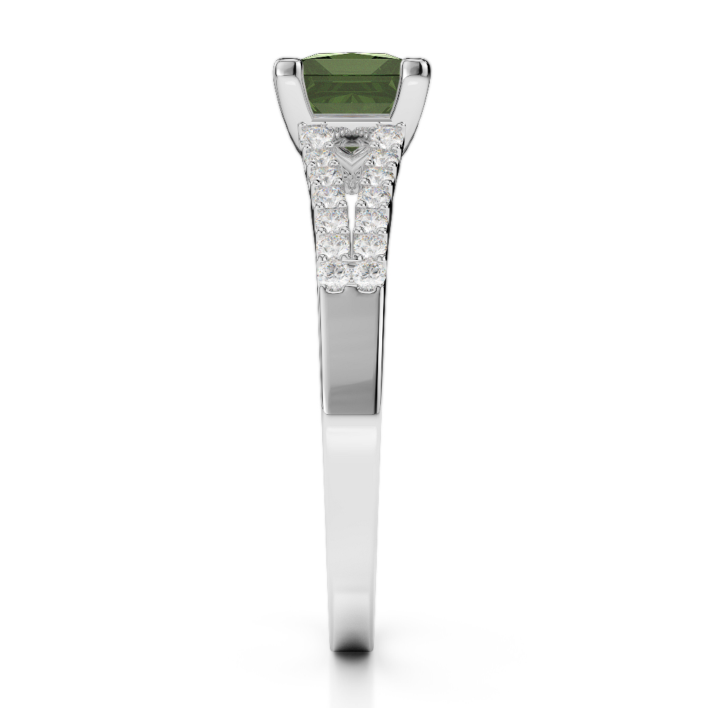 Indulge in elegance with our Princess Cut Green Tourmaline Diamond Engagement Ring, showcasing a regal Green Tourmaline in a secure prong setting that allows light to pass freely through its facets, enhancing its natural brilliance. A halo of sparkling diamonds surrounds the centerpiece, creating a timeless display of charm and light.