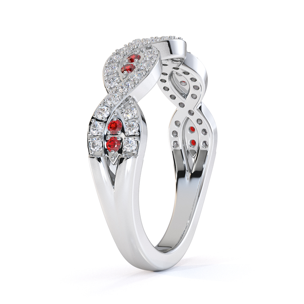 This exquisite half eternity ring features a stunning combination of diamonds and garnets, set in a classic prong setting. The timeless design of this ring makes it a perfect choice for symbolising everlasting love and commitment. Crafted with precision and attention to detail, this ring is sure to be a cherished piece for years to come.