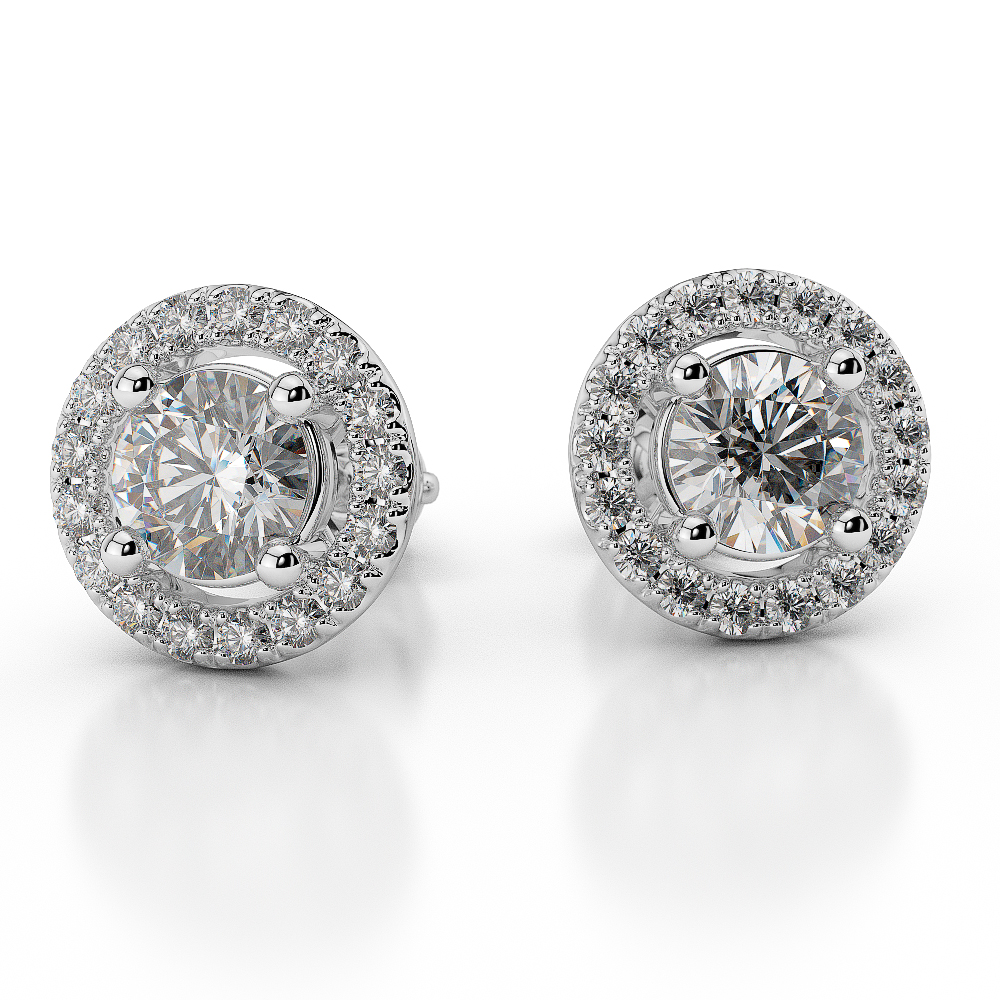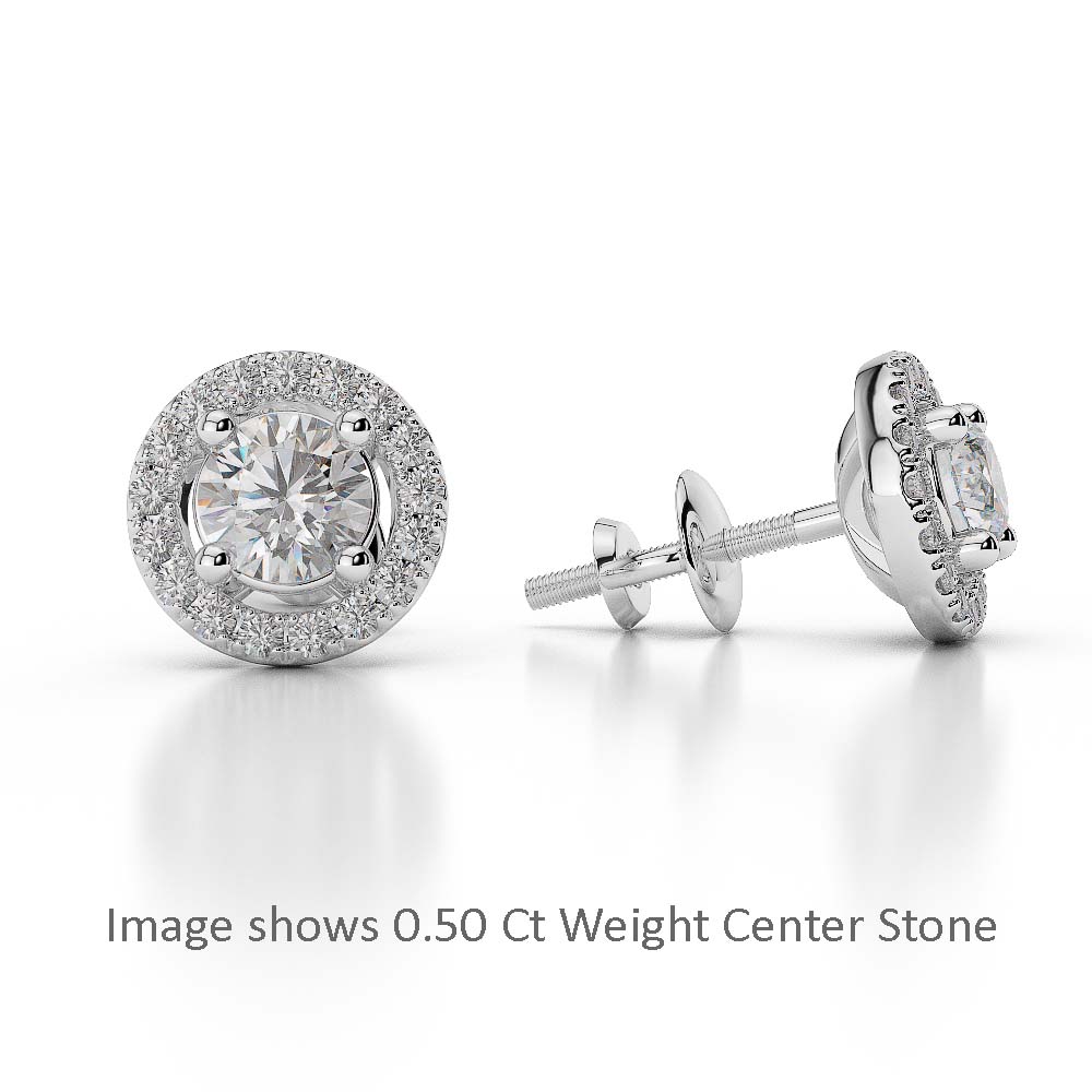 Our diamond halo earrings are a stunning addition to any outfit, featuring round brilliant cut diamonds. With a prong setting, they hold the diamonds securely, allowing maximum light to enhance their brilliance. The halo design adds an extra touch of elegance, framing the diamonds and creating a captivating sparkle. Crafted with precision, these earrings make a timeless statement of sophistication.
