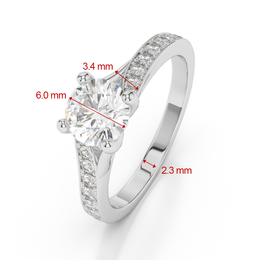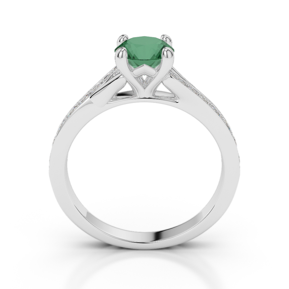 This exquisite Emerald And Diamond Engagement Ring features a stunning round brilliant cut diamond, expertly set in a classic prong setting to maximize its brilliance and sparkle. The prongs securely hold the diamond while allowing light to enter from all angles, enhancing its fire and scintillation. As the radiant centerpiece of this timeless design, the diamond beautifully symbolizes the eternal love and commitment shared between partners.