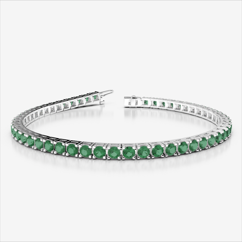 Elevate your look with this Round Cut Emerald Tennis Bracelet, where each prong set Emerald is chosen for fire and consistency. The linear brilliance and refined setting make it a standout piece for those who appreciate timeless luxury.