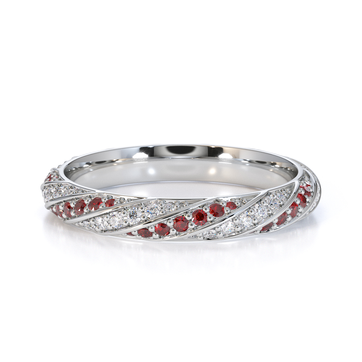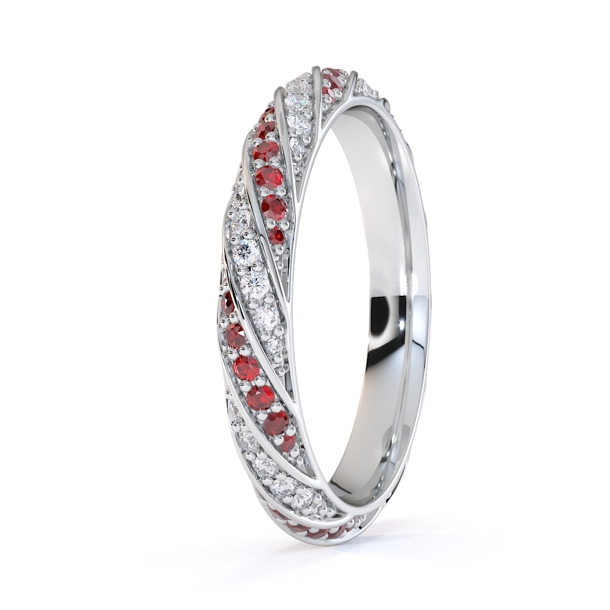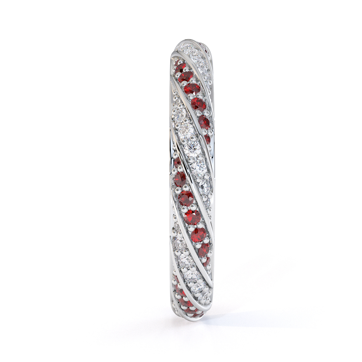 This eternity ring features timeless elegance with garnets and diamonds, symbolising love and commitment. The full-eternity style, combined with a split prong setting, secures each stone while enhancing their brilliance. This elegant piece adds sophistication to any bride’s ensemble on her special day.