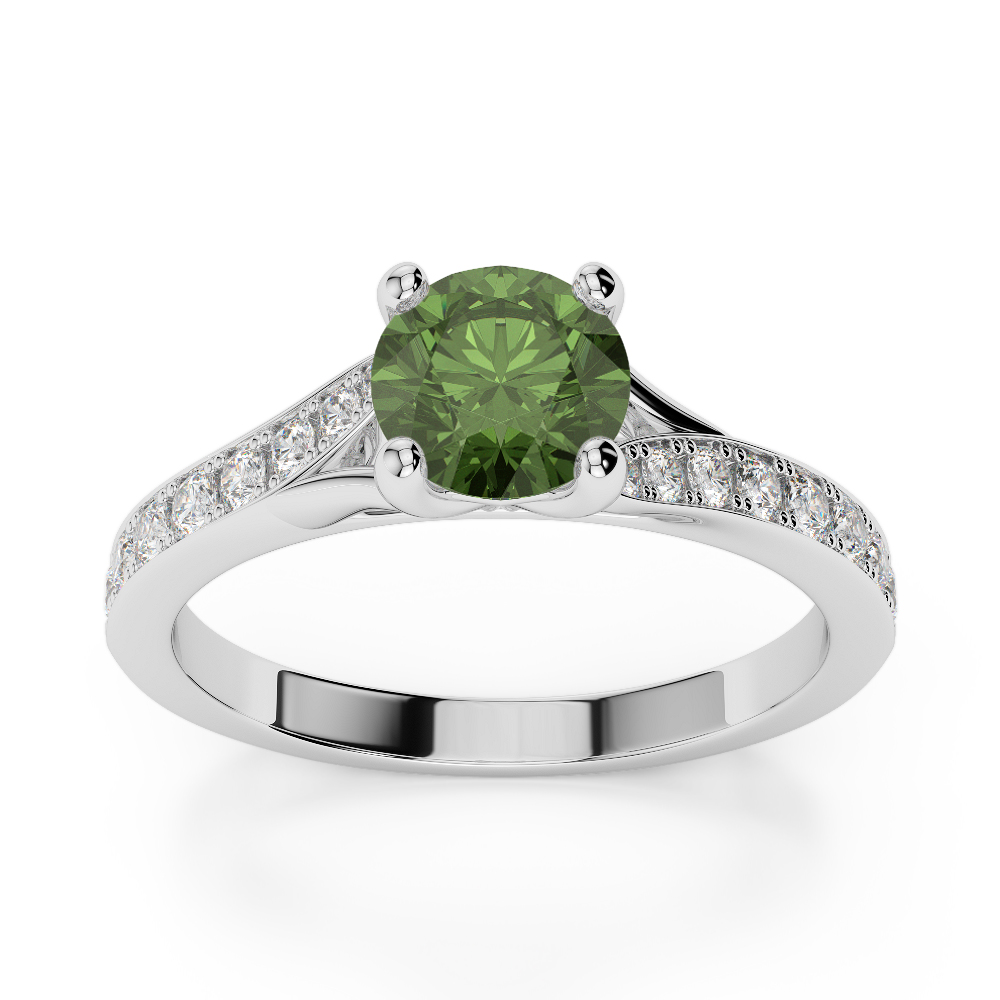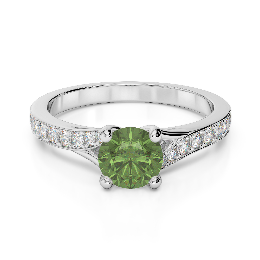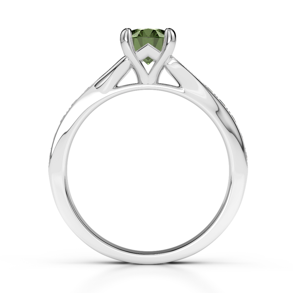 This exquisite Green Tourmaline And Diamond Engagement Ring features a stunning round brilliant cut diamond, expertly set in a classic prong setting to maximize its brilliance and sparkle. The prongs securely hold the diamond while allowing light to enter from all angles, enhancing its fire and scintillation. As the radiant centerpiece of this timeless design, the diamond beautifully symbolizes the eternal love and commitment shared between partners.