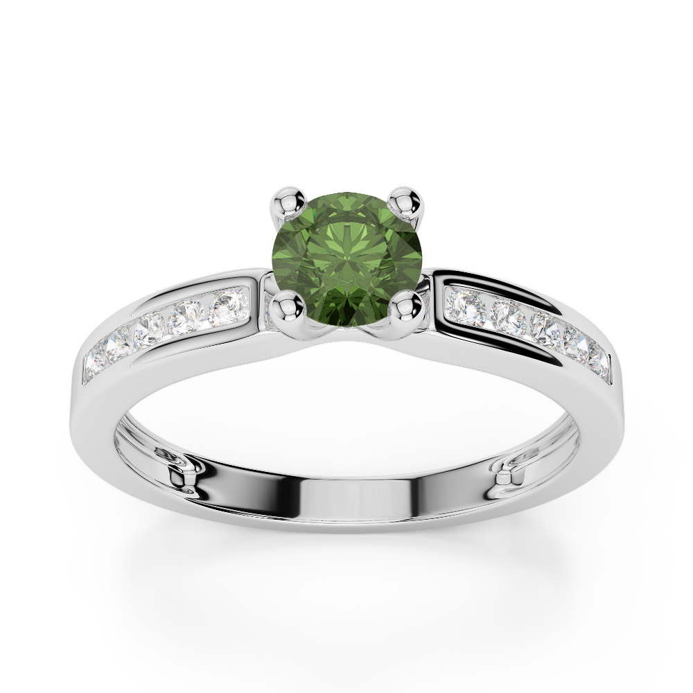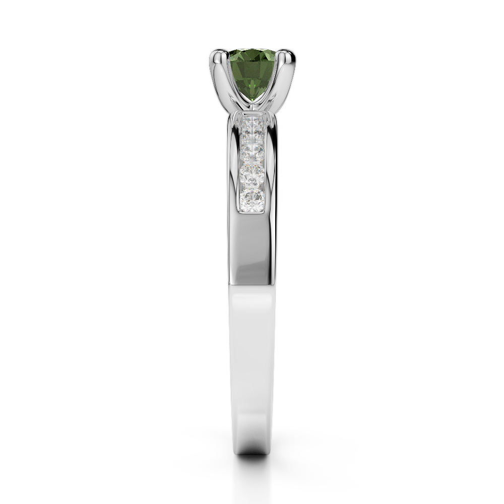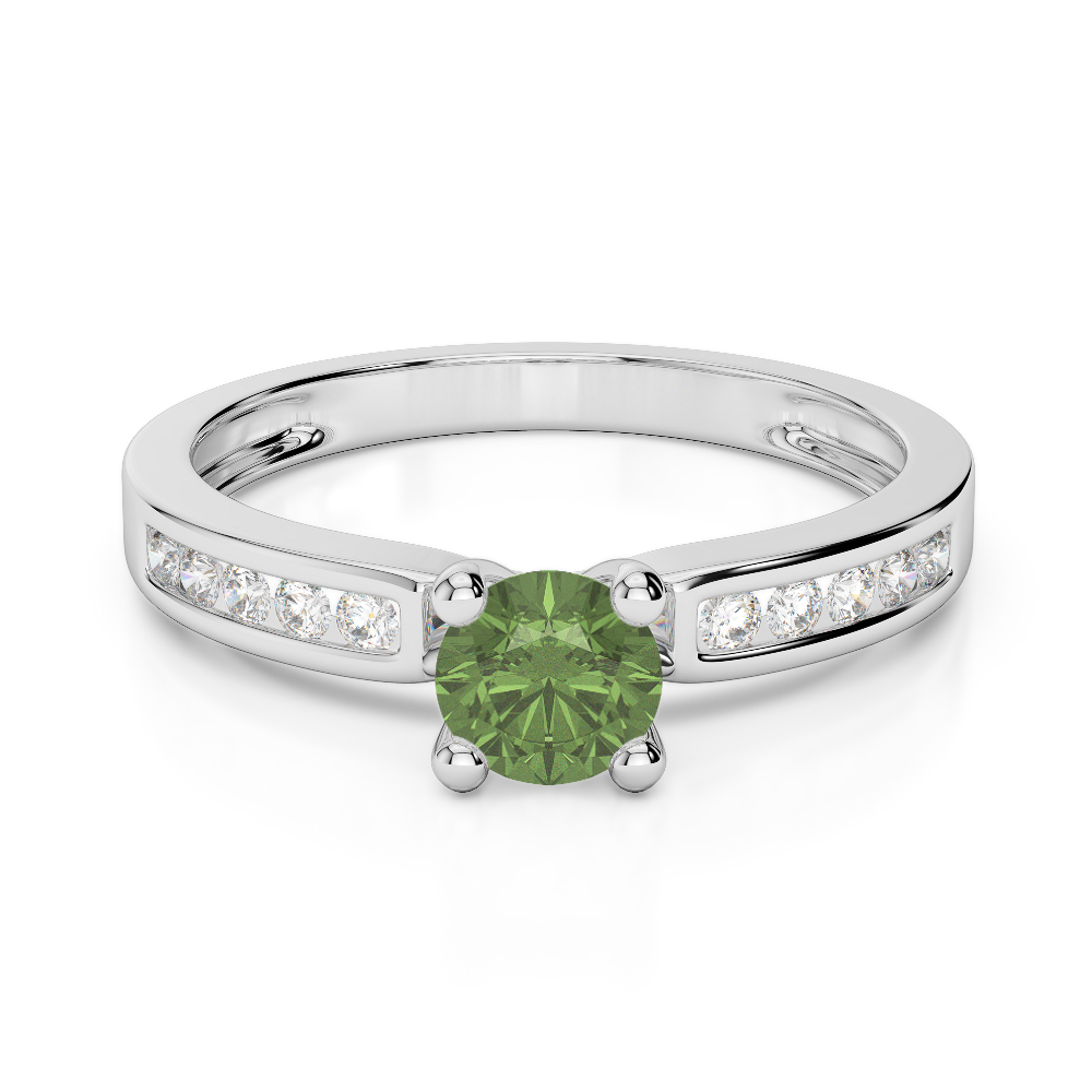 Indulge in the timeless elegance of this exquisite Green Tourmaline And Diamond Engagement Ring, crafted from lustrous gold and adorned with brilliant diamonds that capture the light with every movement. The ring features a stunning central diamond, expertly cut to maximize its sparkle and secured in a classic prong setting that elevates the stone, allowing light to enter freely for unmatched brilliance. Complementing the centerpiece, smaller diamonds are gracefully set into the band using a sleek channel setting, providing a smooth, secure finish while adding a continuous stream of radiance. Together, these settings create a breathtaking display of brilliance and refined craftsmanship.