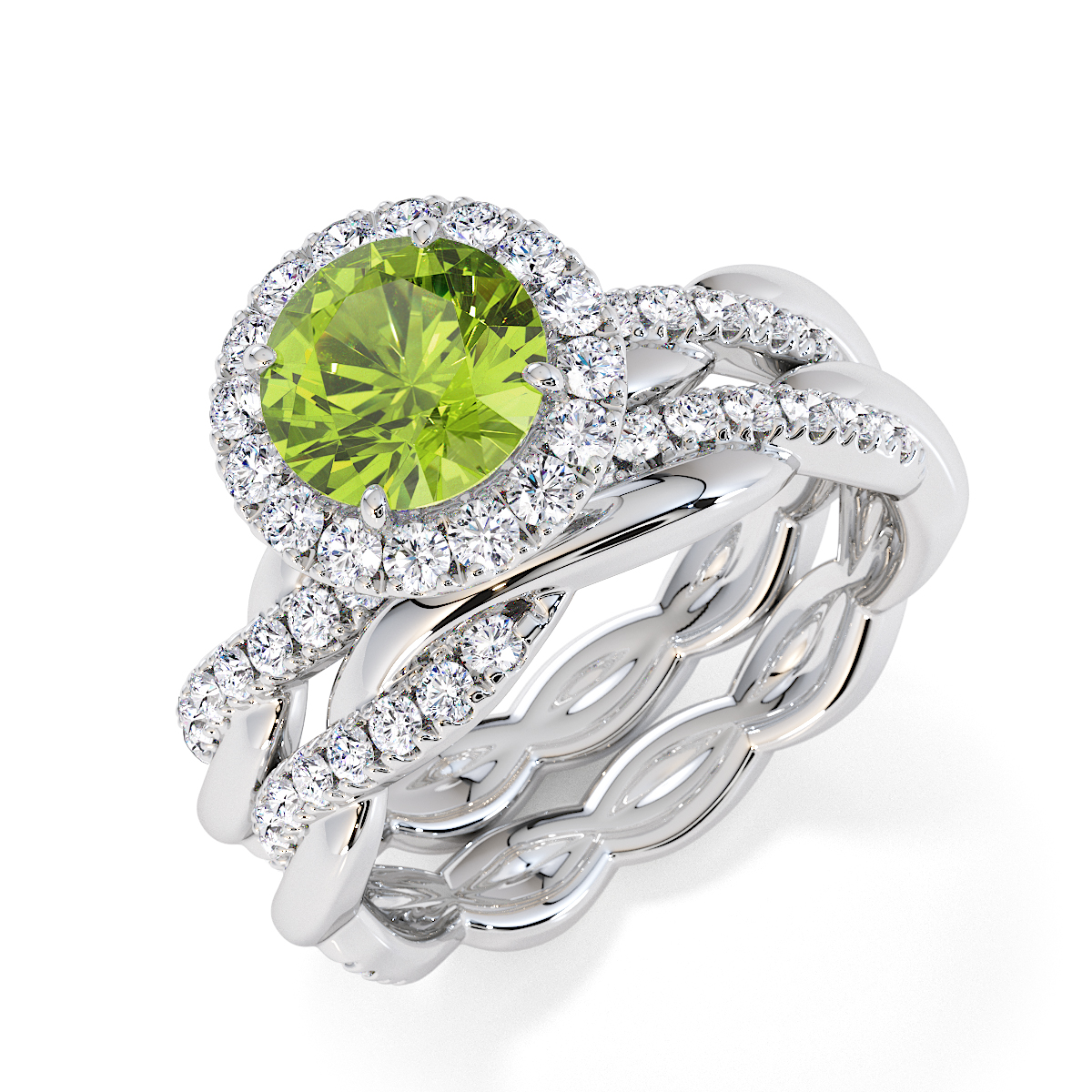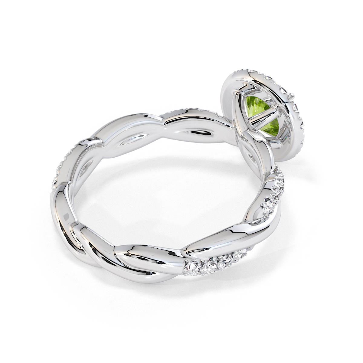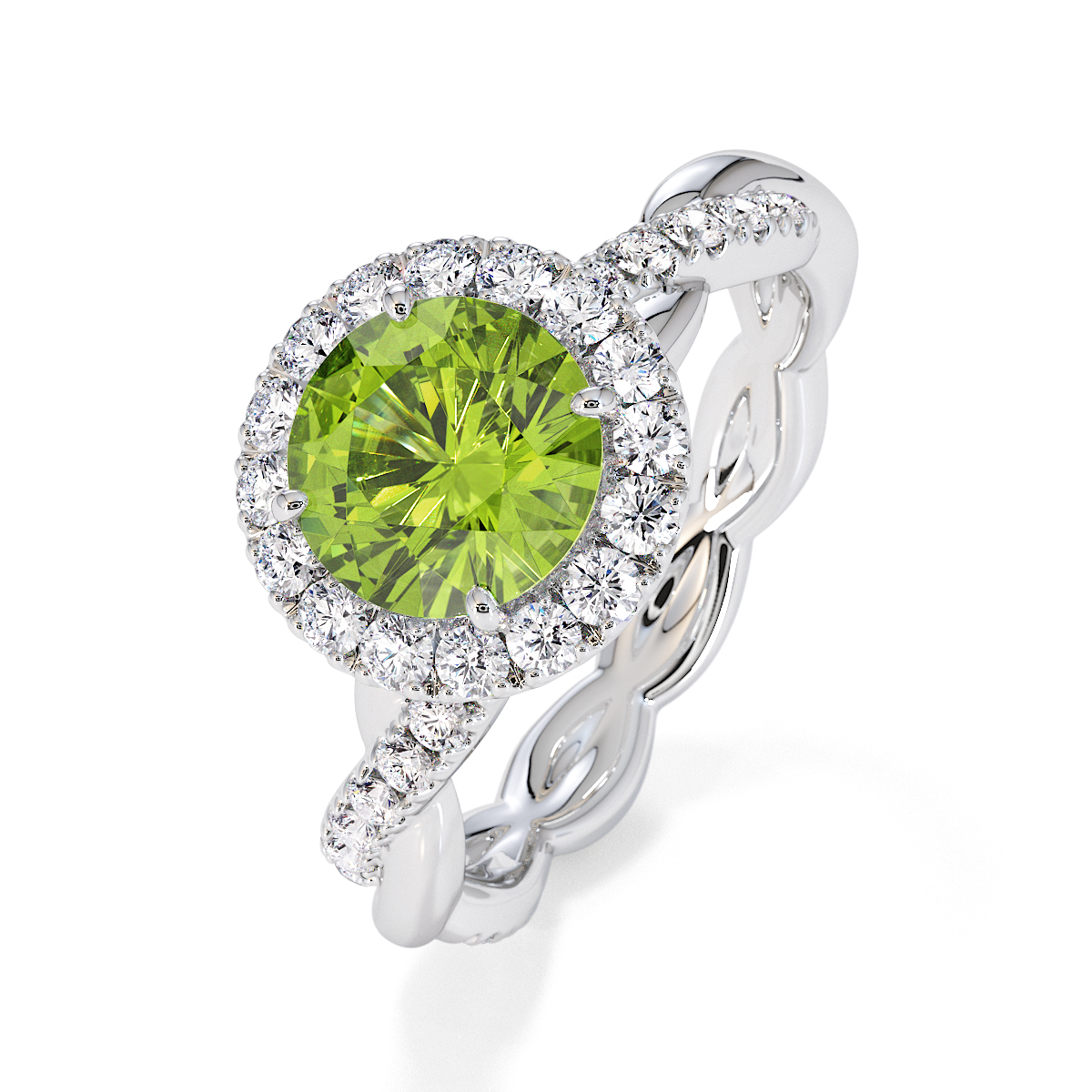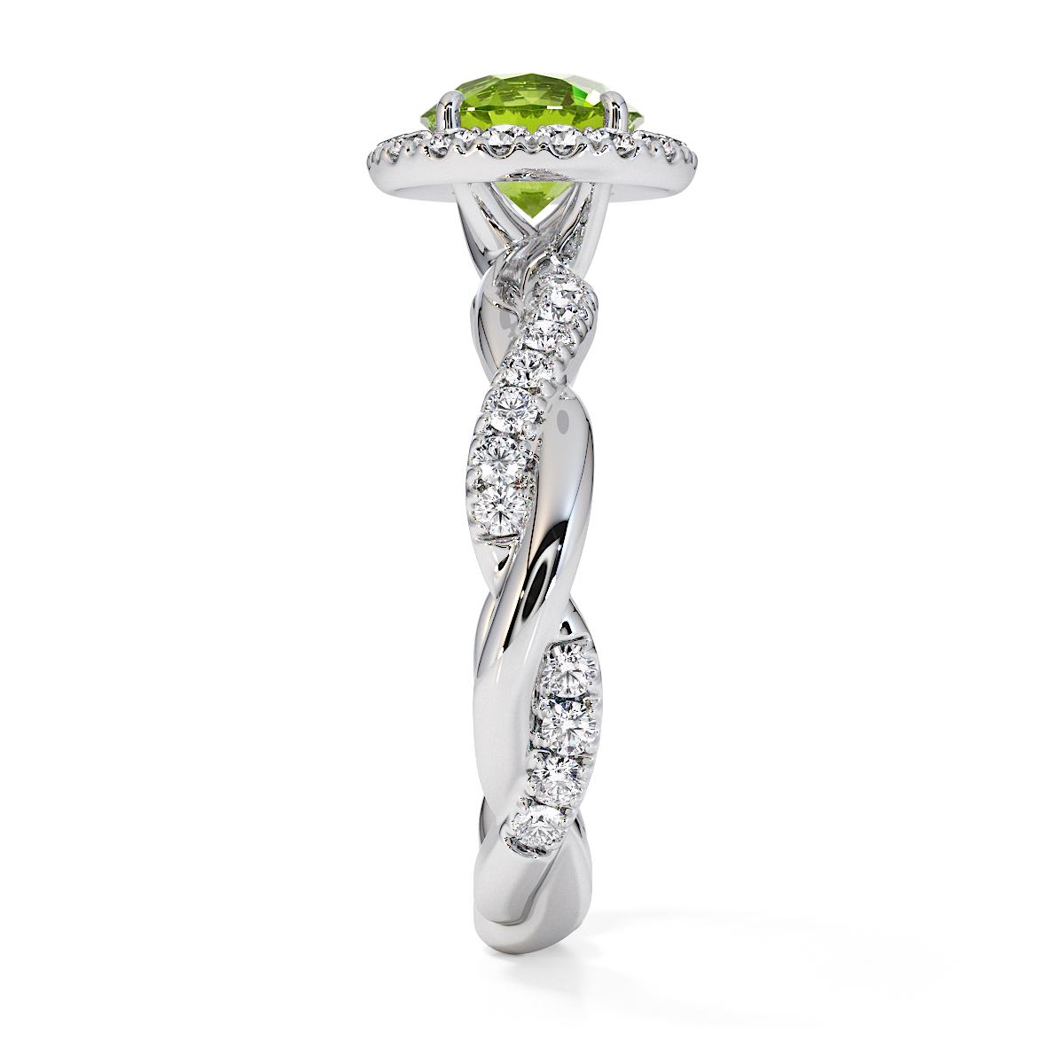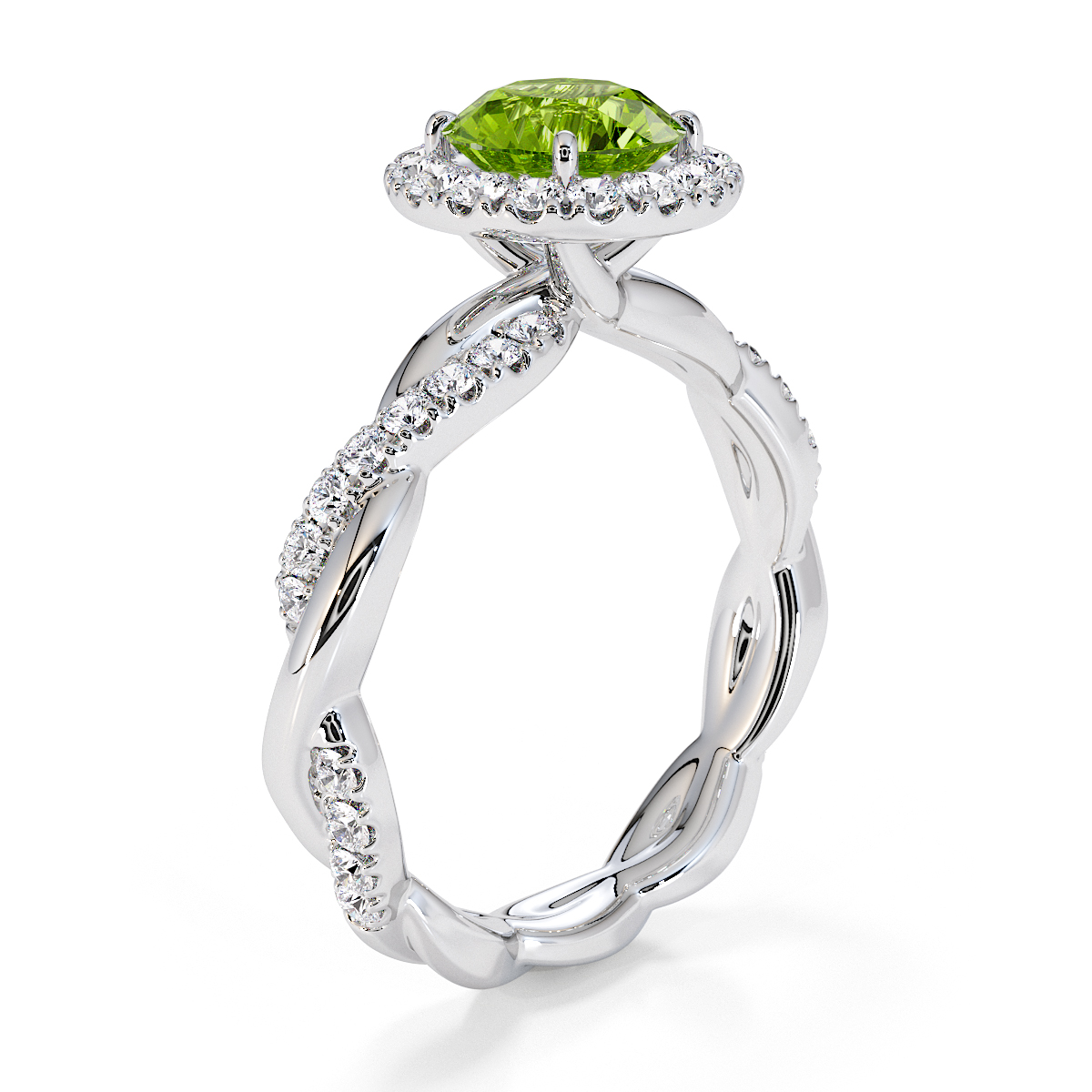 Presenting our stunning round cut Peridot and Diamond Engagement Ring. The ring is further adorned with a halo and prong-set diamonds running up the twisted shoulders. It perfectly complements the wedding ring of your choice.