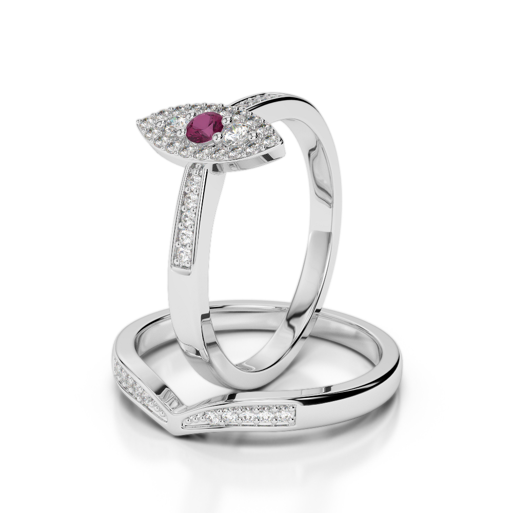 These stunning ruby bridal set rings are perfect for matching wedding and bridal set, featuring round brilliant-cut diamonds set on a prong and pave setting. The bridal set features a single ruby and smaller diamonds on the shoulders, adding comfort and style.