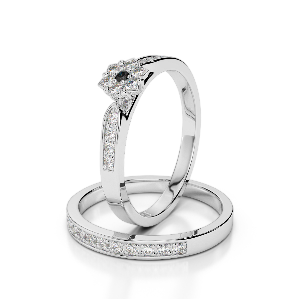 This elegant black diamond bridal set features a single brilliant-cut black diamond in the centre and smaller glittering diamonds across the shoulders, all prong-set for maximum sparkle and security. The set is perfect for both engagement and wedding rings, showcasing naturally mined conflict-free black diamond for comfort and style.