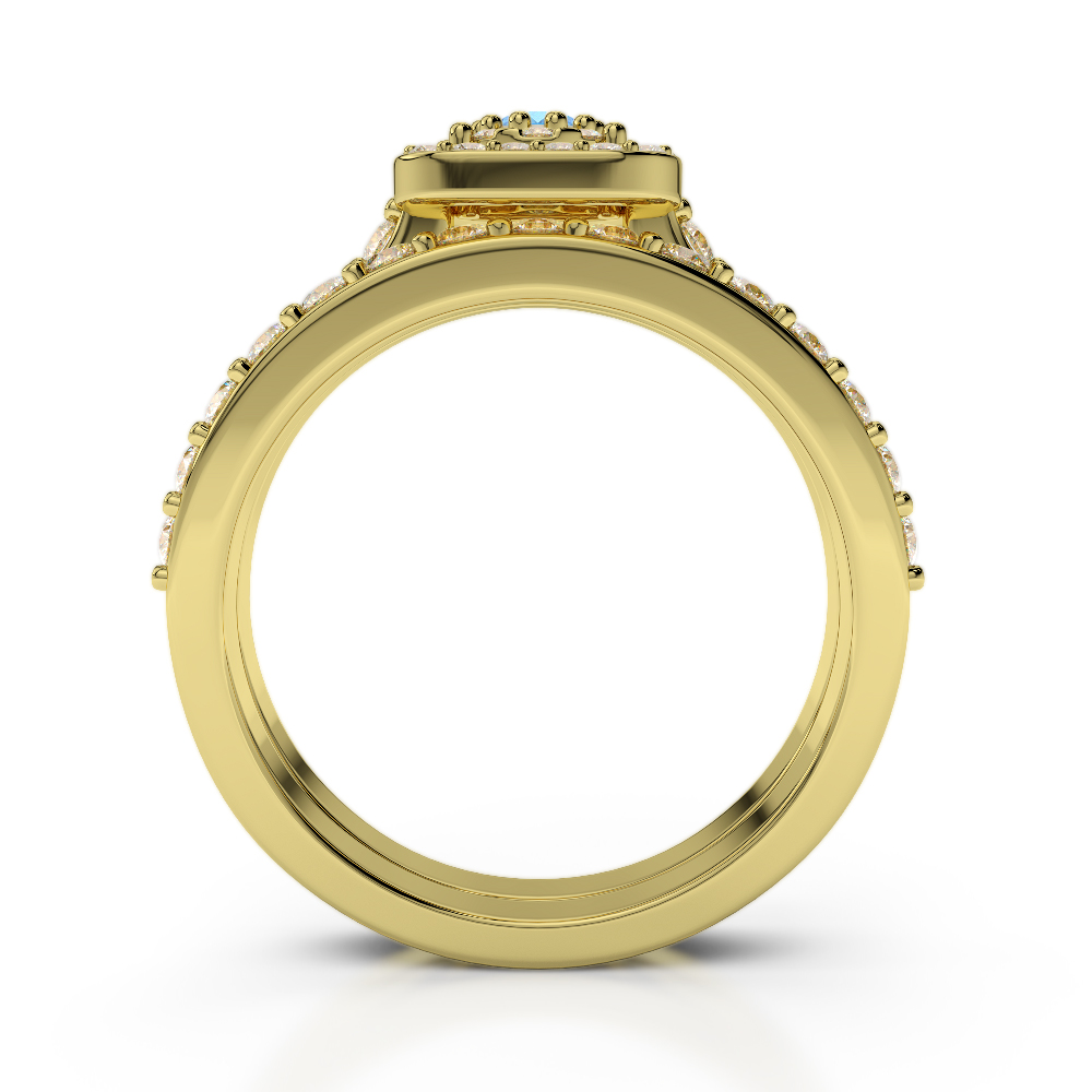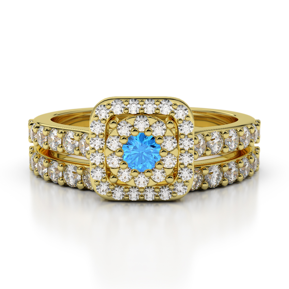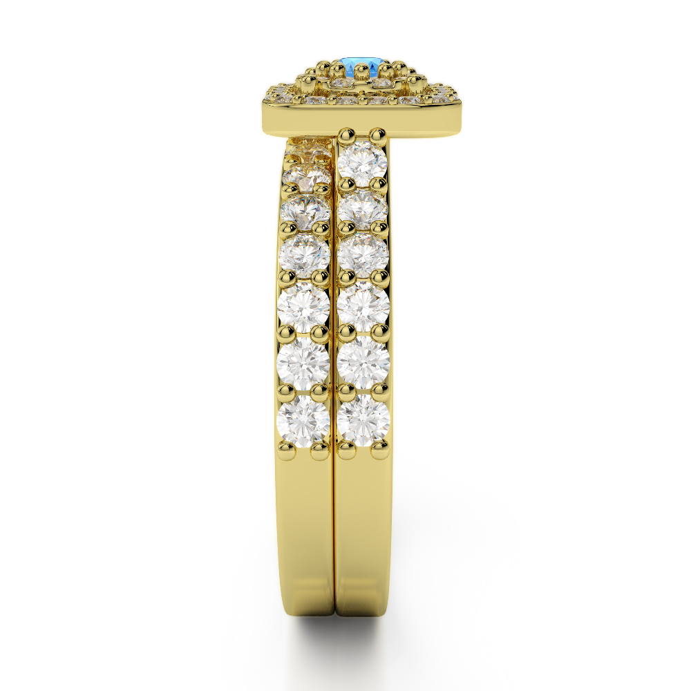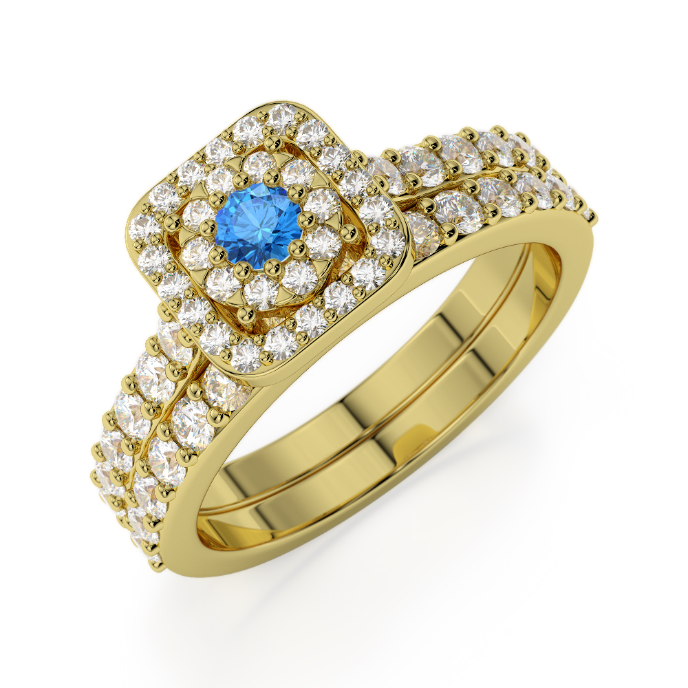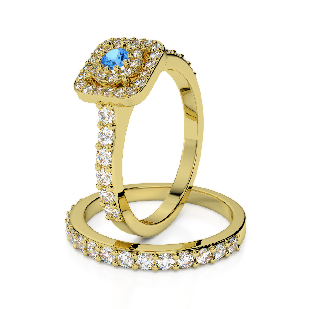 This stunning blue topaz with diamond bridal set features a beautiful halo design that enhances the brilliance of the centre stone. The ring is elegantly crafted with a prong setting, ensuring the diamonds are securely held in place while allowing maximum light to pass through for exceptional sparkle. Perfect for a bride-to-be looking for a timeless and sophisticated piece to symbolise their love and commitment.