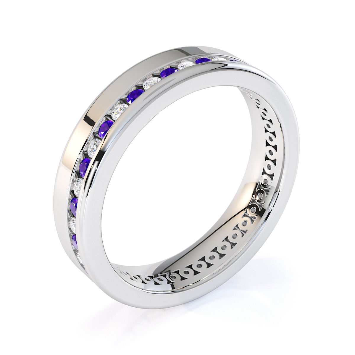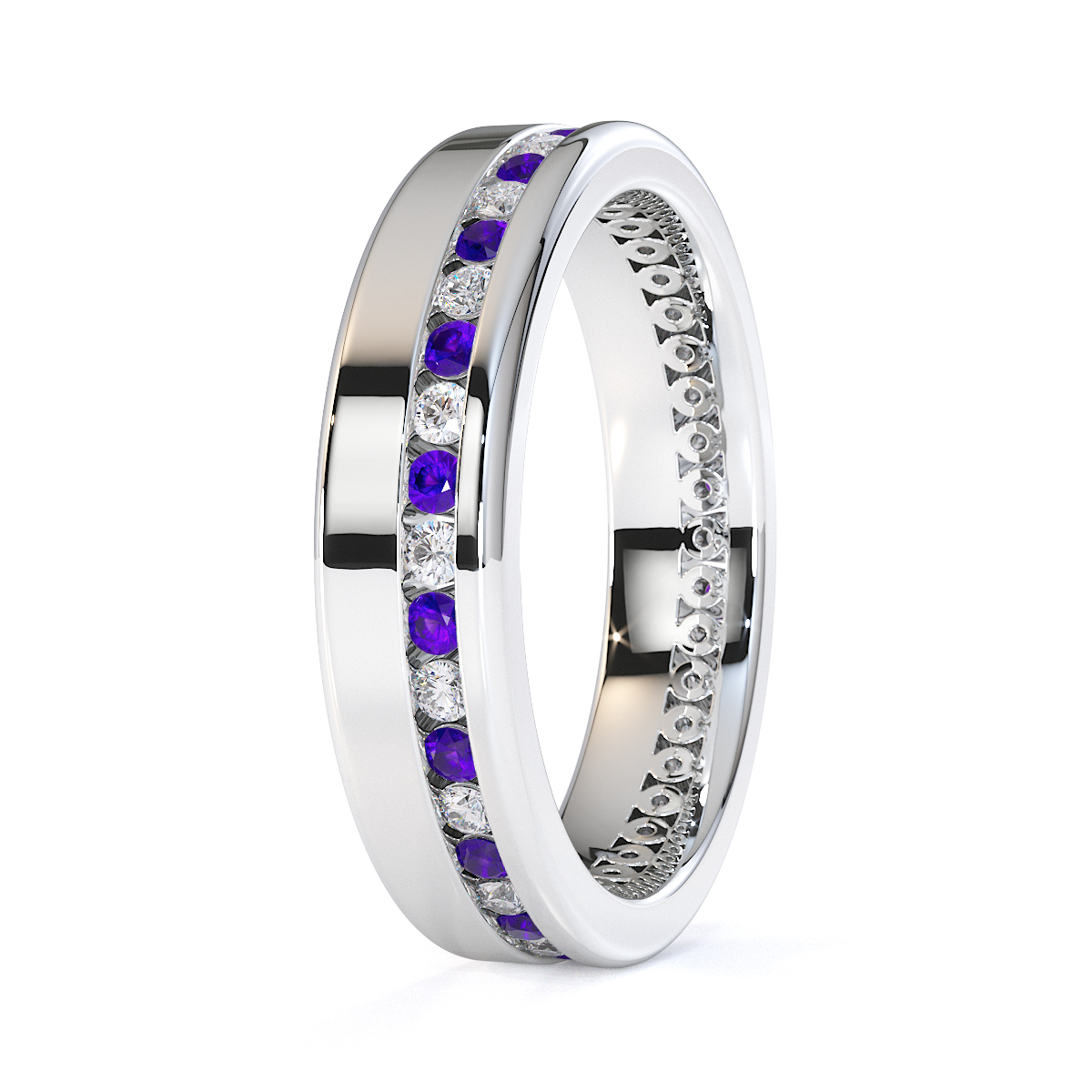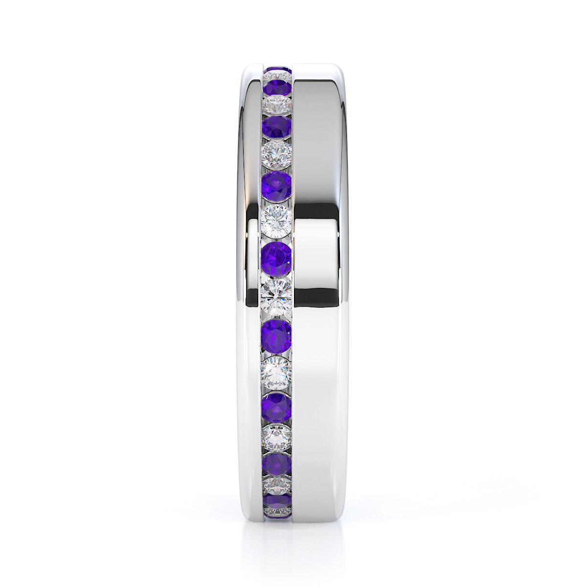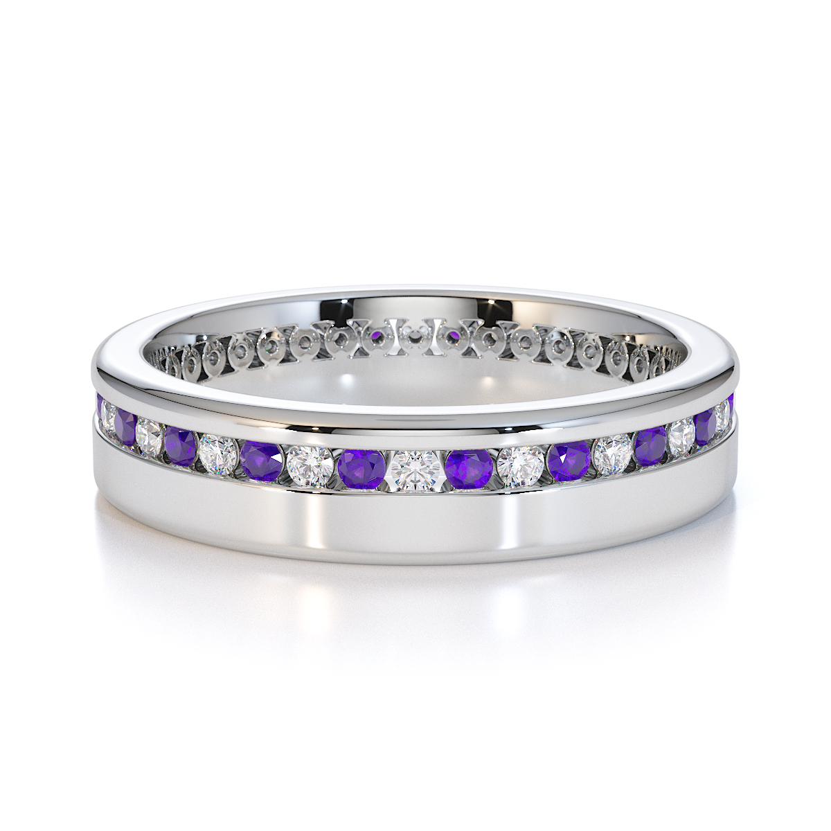 Our eternity ring is a stunning symbol of eternal love and commitment, featuring a full eternity design of amethysts and diamonds. Crafted with precision, the channel setting enhances the brilliance of each gemstone, creating a mesmerizing sparkle. This timeless and luxurious piece is perfect for those seeking a cherished treasure to last forever.
