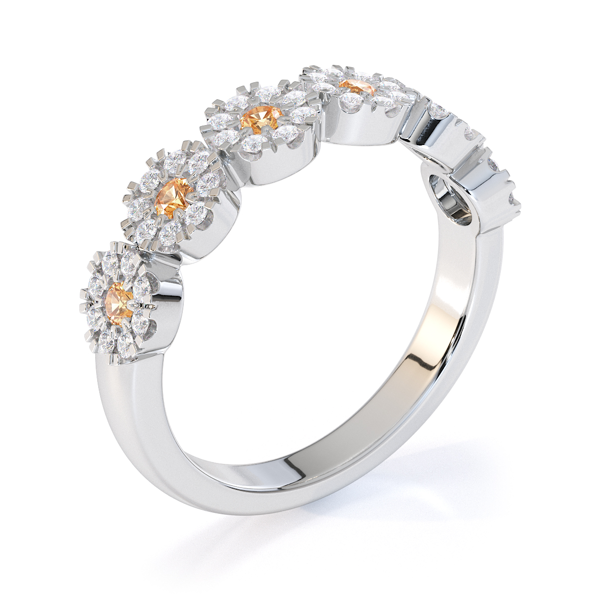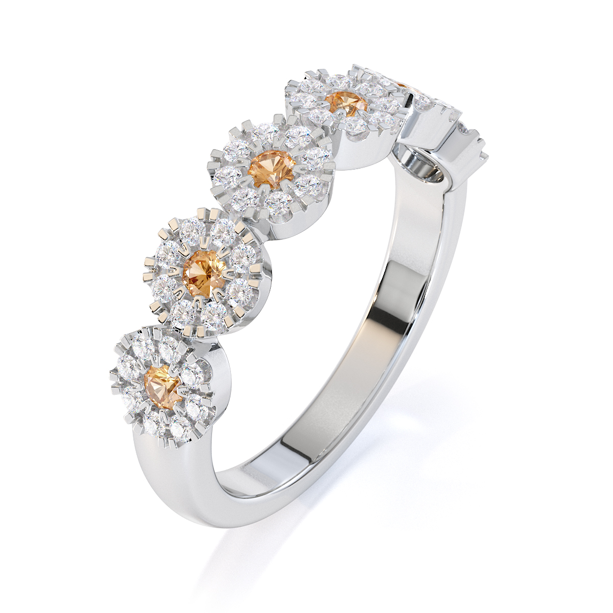 This eternity ring features timeless elegance with citrines and diamonds, symbolising love and commitment. The half-eternity style, combined with a split prong setting, securely holds each stone while enhancing its brilliance. This elegant piece adds a touch of sophistication to any bride’s ensemble on her special day.