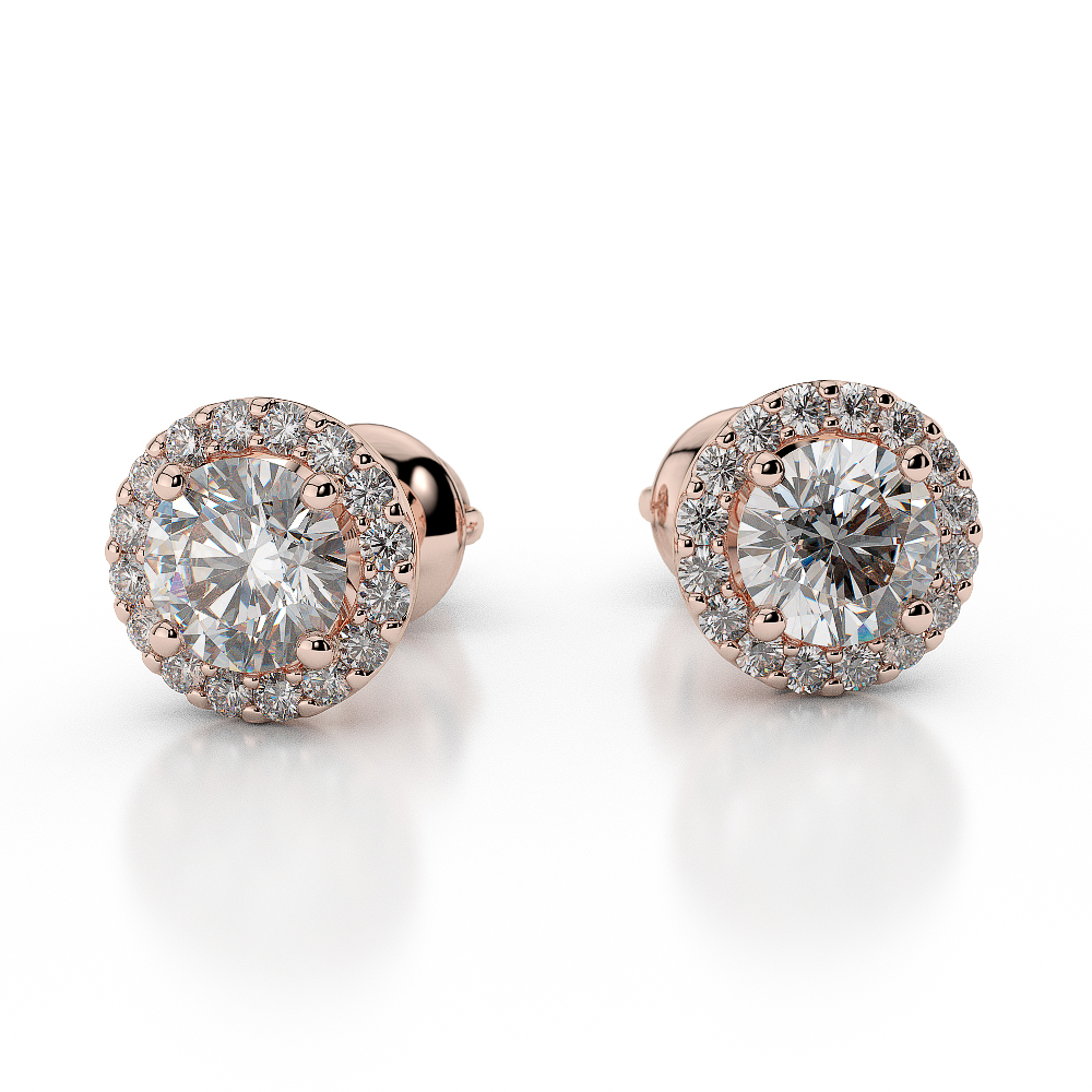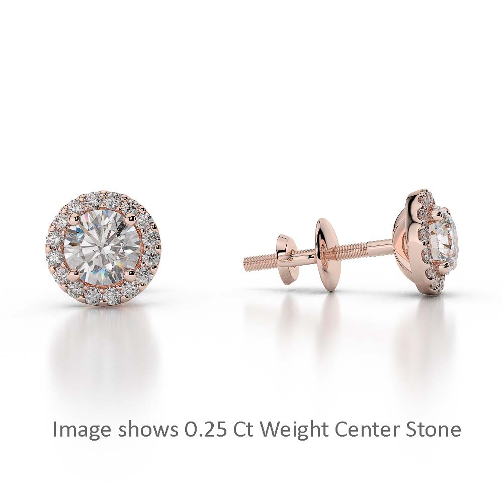 With their round brilliant cut diamonds, these halo earrings are a gorgeous accent to any ensemble. They firmly hold the diamonds in a prong setting, letting the most light possible to accentuate their brilliance. The diamonds are framed by the halo design, which gives a touch of elegance and stunning brightness. Manufactured with great care and accuracy.