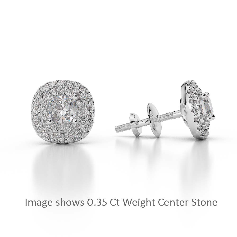 These halo earrings are a stunning finishing touch for any outfit thanks to their Cushion brilliant cut diamonds. With the diamonds securely held in a prong setting, the maximum amount of light is allowed to highlight the beauty of the stones. The halo design encircles the diamonds, adding a touch of elegance and breathtaking brilliance. Produced with meticulous attention to detail.