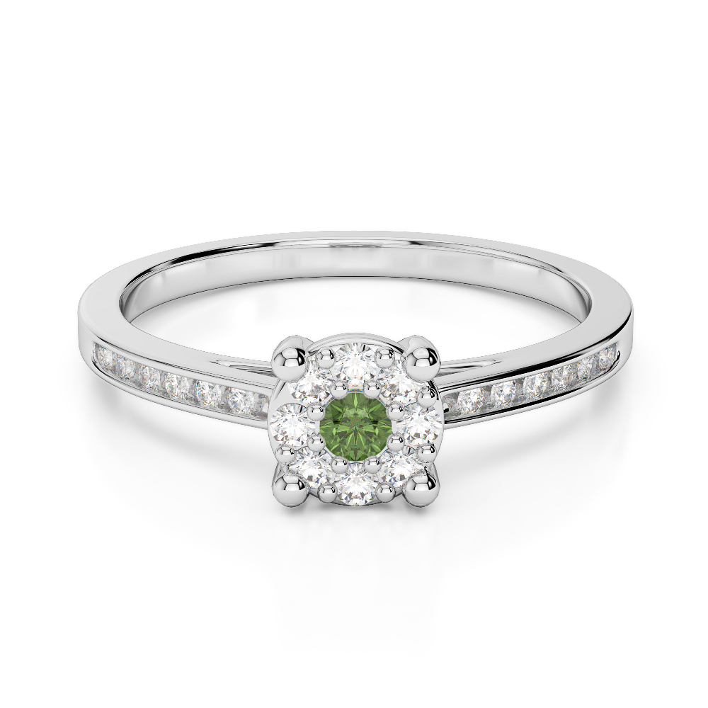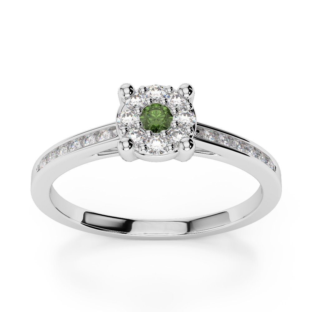 Elevate your love story with this exquisite Green Tourmaline And Diamond Engagement Ring, a stunning embodiment of elegance and commitment. Crafted in lustrous gold, this ring features a breathtaking array of sparkling diamonds that dance with every movement, capturing the light and the heart. The intricate design showcases a central diamond, expertly cut to maximize brilliance and securely set in a classic prong setting, surrounded by a halo of smaller diamonds that enhance its radiance. Additional diamonds, elegantly set in a sleek channel setting along the band, add further brilliance and a refined finish to this timeless piece.