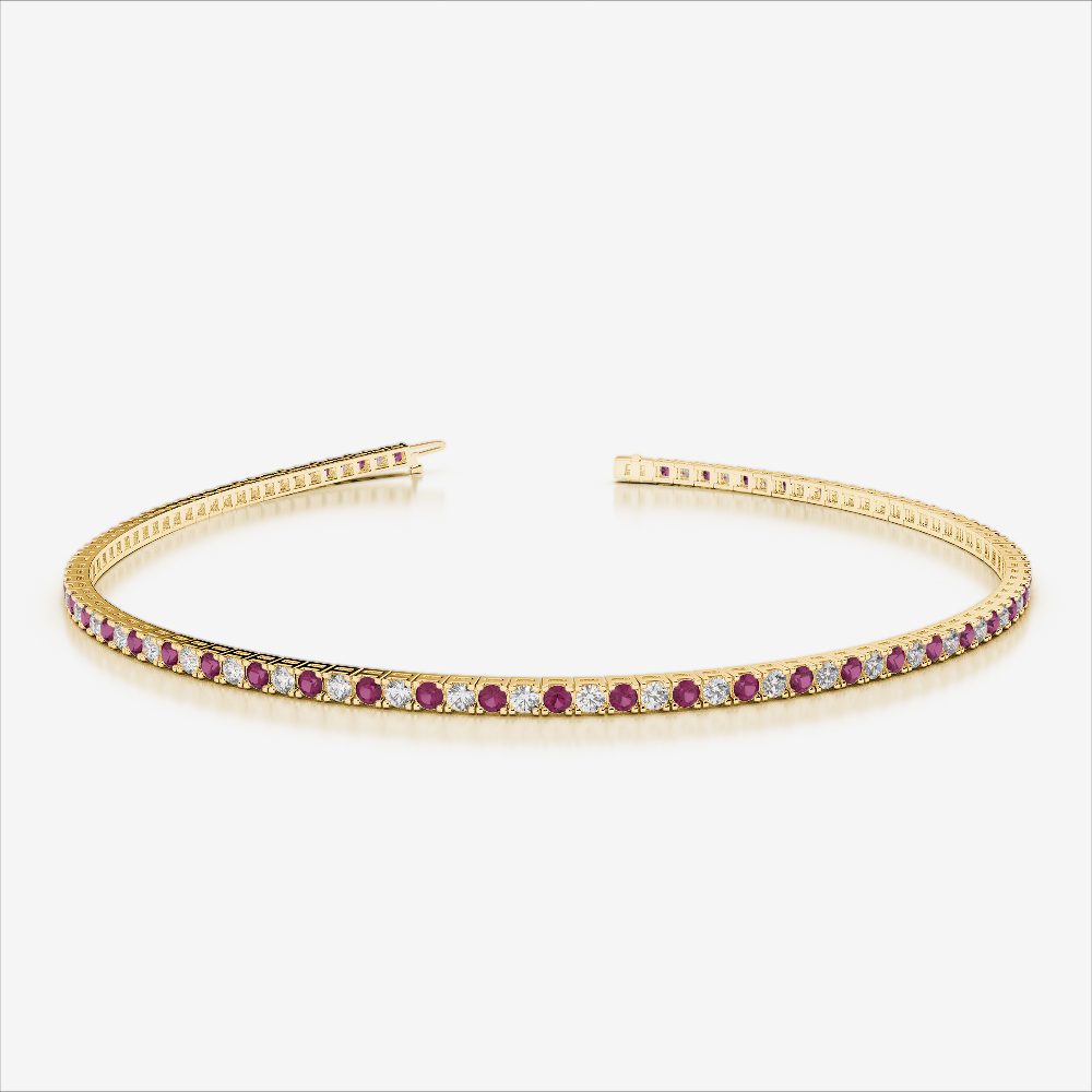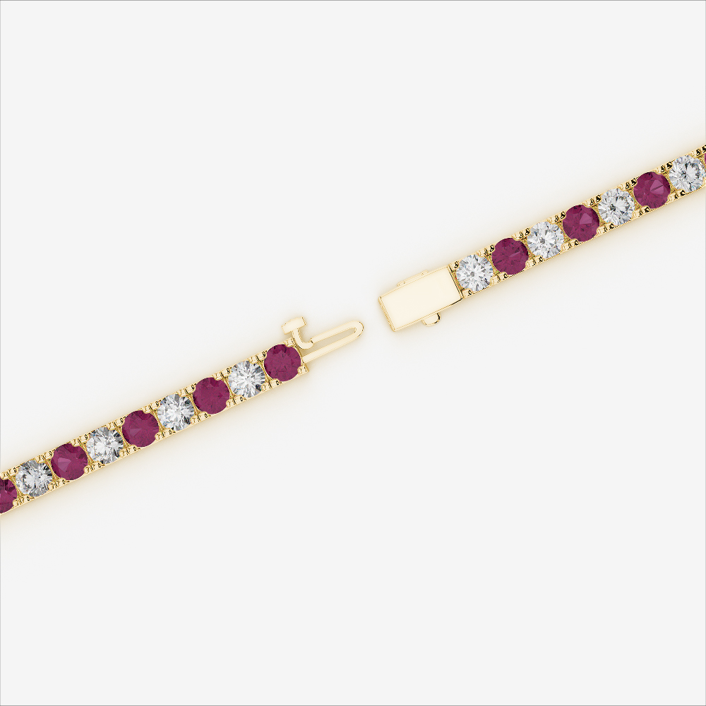Step into elegance with our prong-set round-cut ruby and diamond tennis bracelet. Designed to enchant, this piece blends the natural beauty of rubieswith the radiance of diamonds. A true expression of refined taste, it complements every outfit. Whether gifted or self-selected, this bracelet becomes a cherished part of your collection—graceful, glowing, and unforgettable.