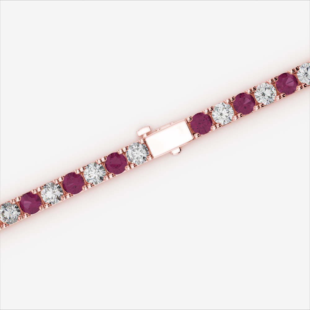 Bring classic glamour to your look with our prong-set round-cut ruby and diamond tennis bracelet. Each gemstone is selected for its brilliance, creating a balanced display of colour and sparkle. Elegant and luxurious, it suits every occasion, from formal gatherings to everyday grace. Gift this to someone you love—or treat yourself to a lifelong touch of radiance.