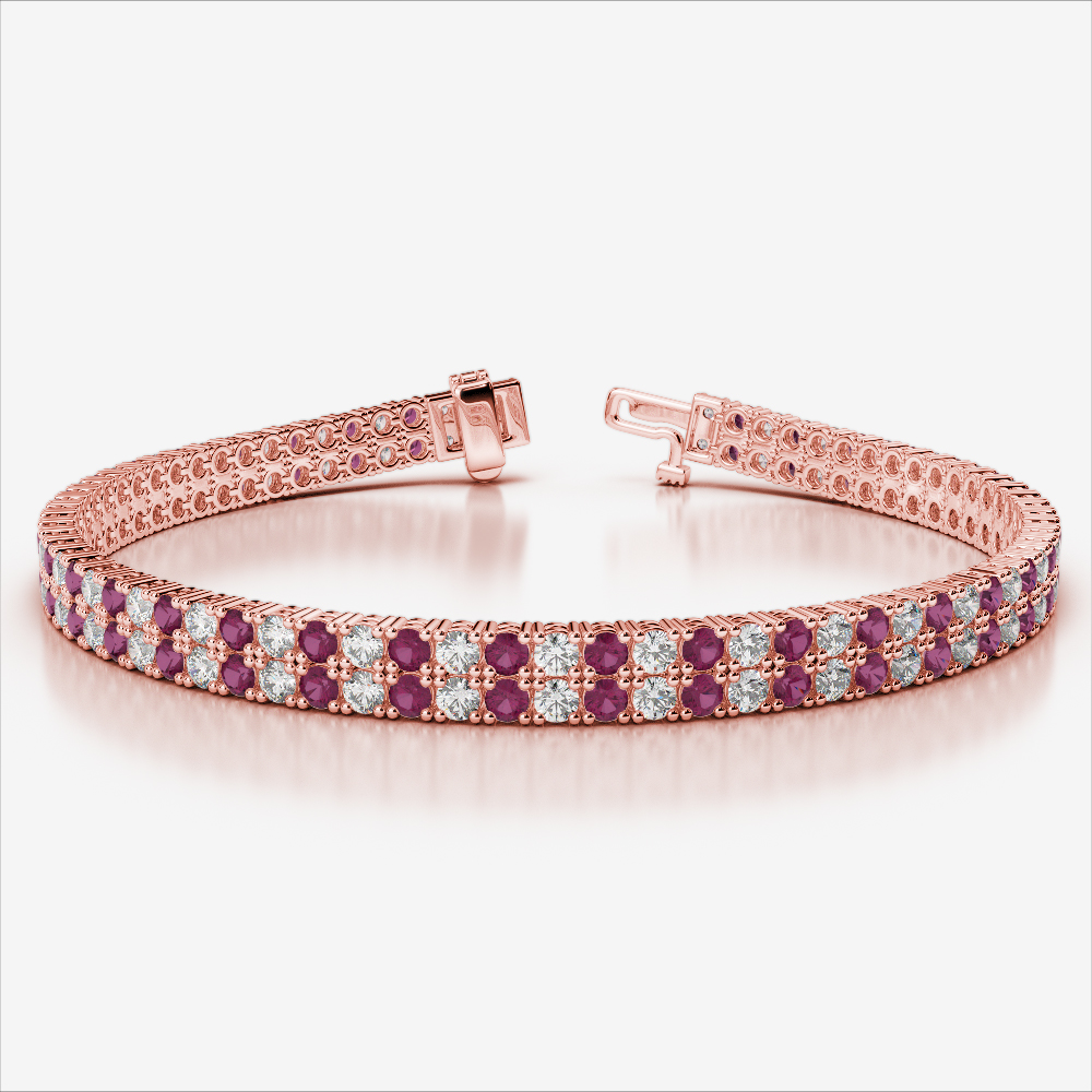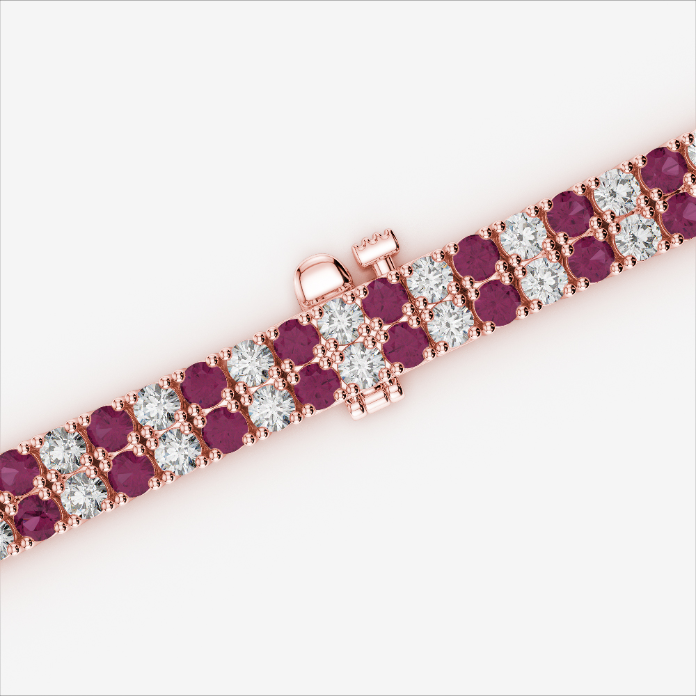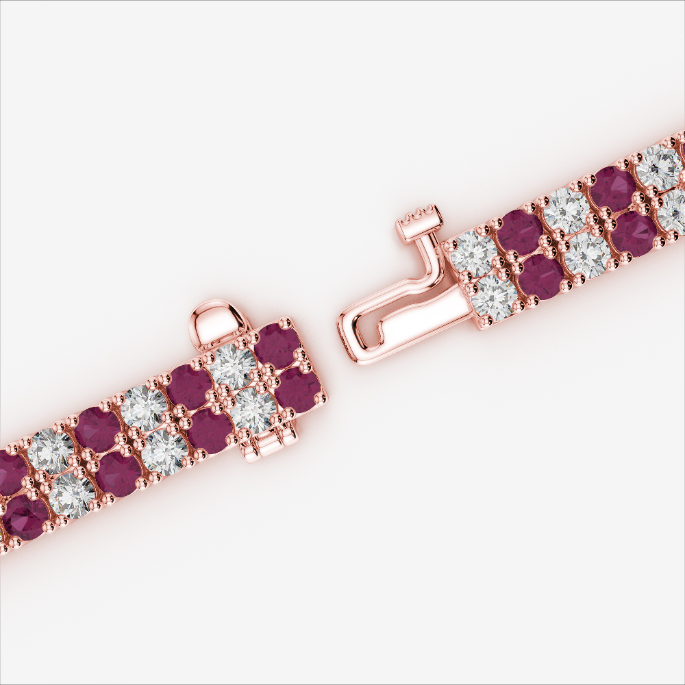 Wrap your wrist in elegance with our Double Row Prong Set ruby and diamond bracelet. Featuring prong-set round-cut stones that dazzle with every movement, this bracelet is made for those who appreciate luxury. It’s the ultimate gift to commemorate life’s most treasured moments.