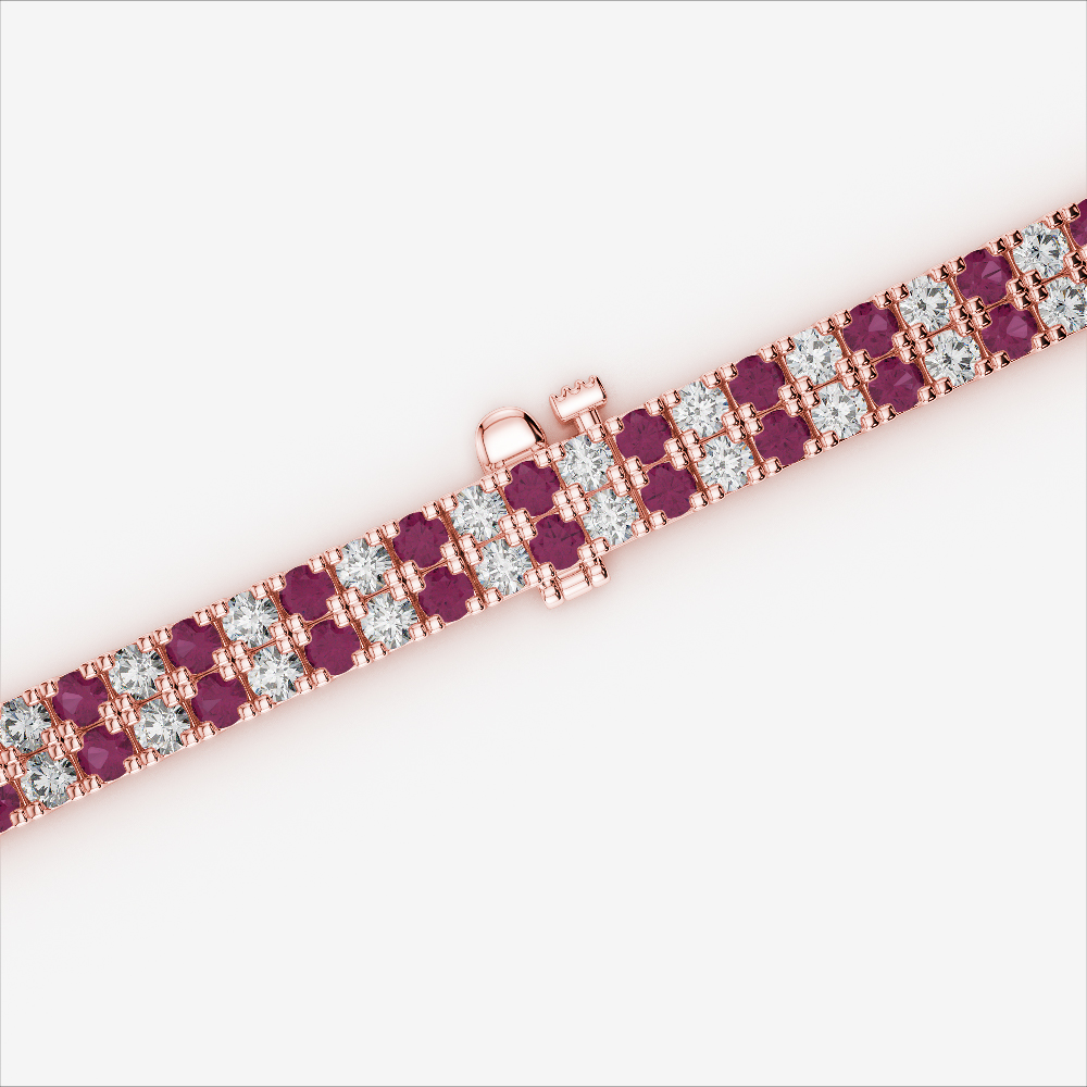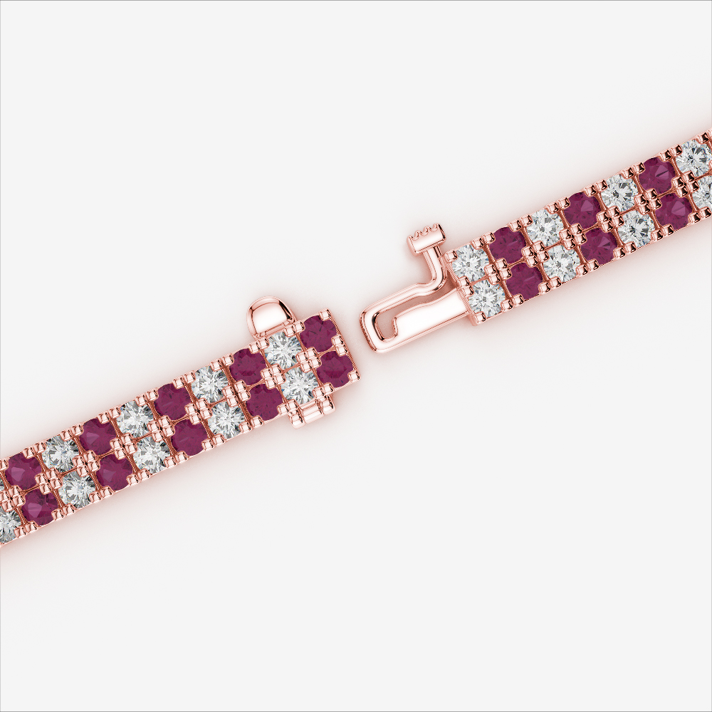 Elevate your collection with our Double Row Prong Set ruby and diamond bracelet. The prong-set round-cut diamonds and rubies shine with remarkable clarity, delivering classic elegance for modern women. Whether worn solo or layered, this bracelet is an enduring token of grace and celebration.