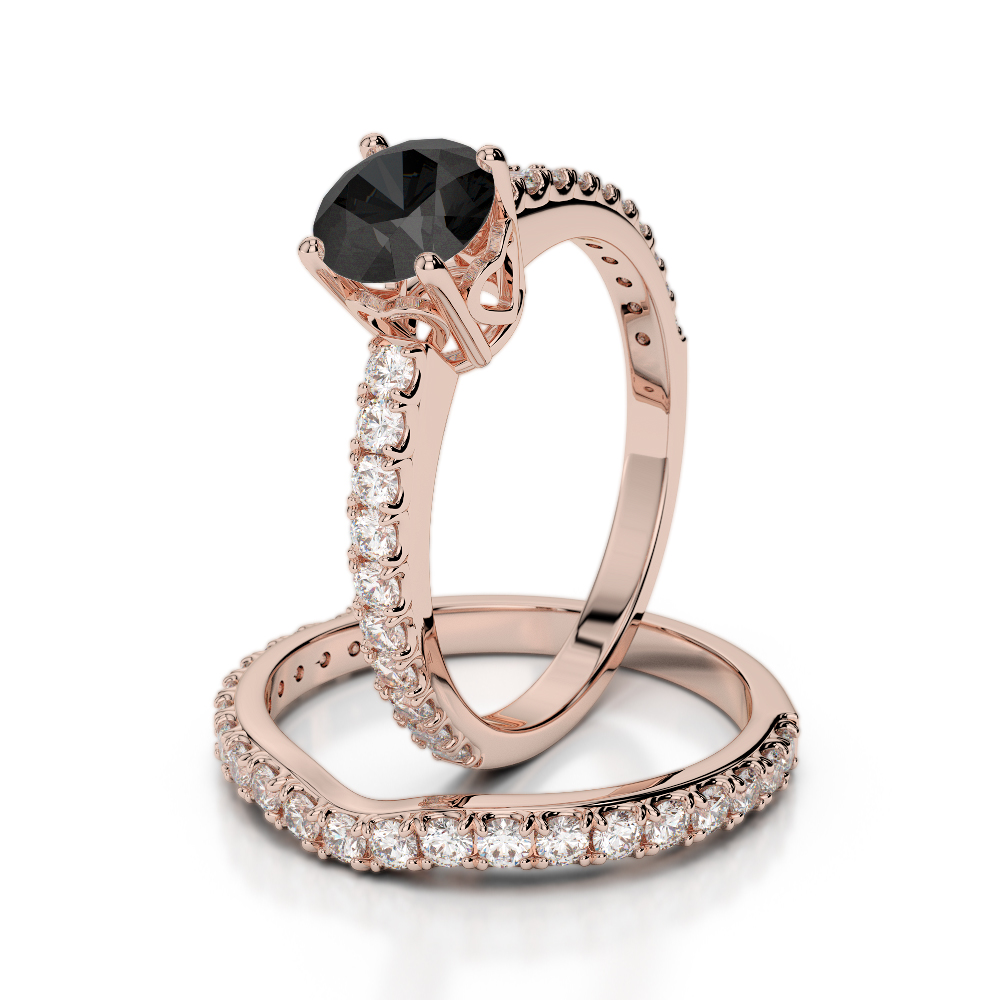 This black diamond bridal set ring set features round brilliant-cut diamonds, making it the perfect choice for your wedding day. The bridal set boasts a sparkling diamonds at its center, while the wedding ring is encrusted with round brilliant-cut diamonds, all beautifully set in a combination of prong and scallop settings. The set is meticulously designed to fit together seamlessly, adding both comfort and style to your look. The naturally mined conflict-free diamonds add a touch of elegance to the overall ensemble.