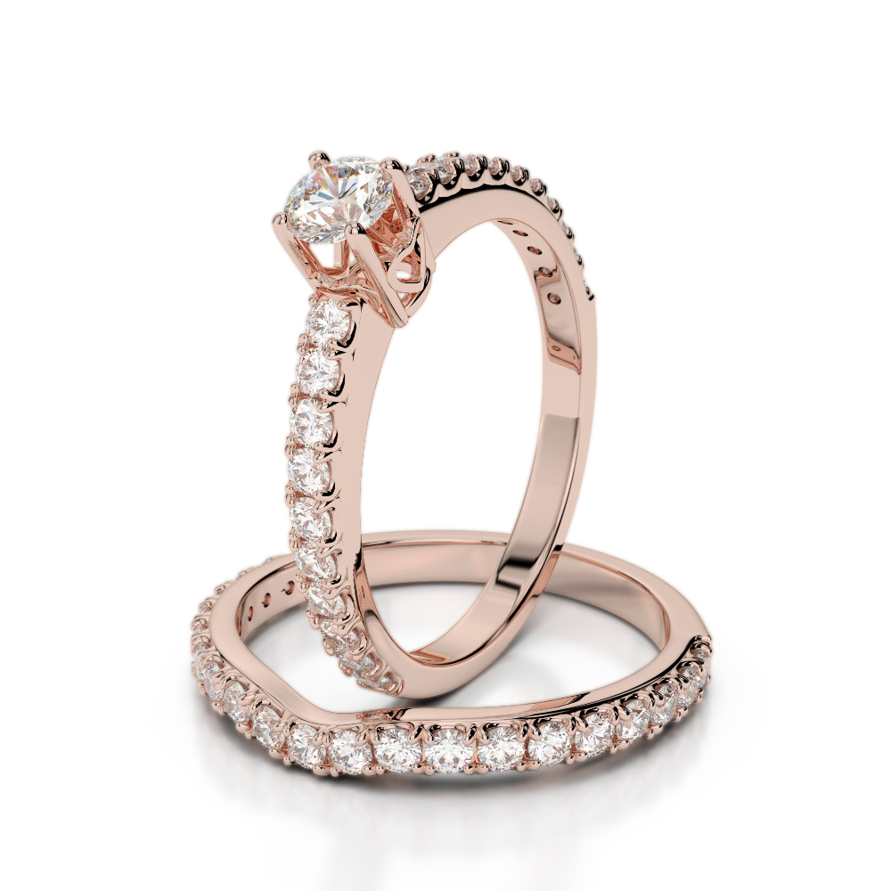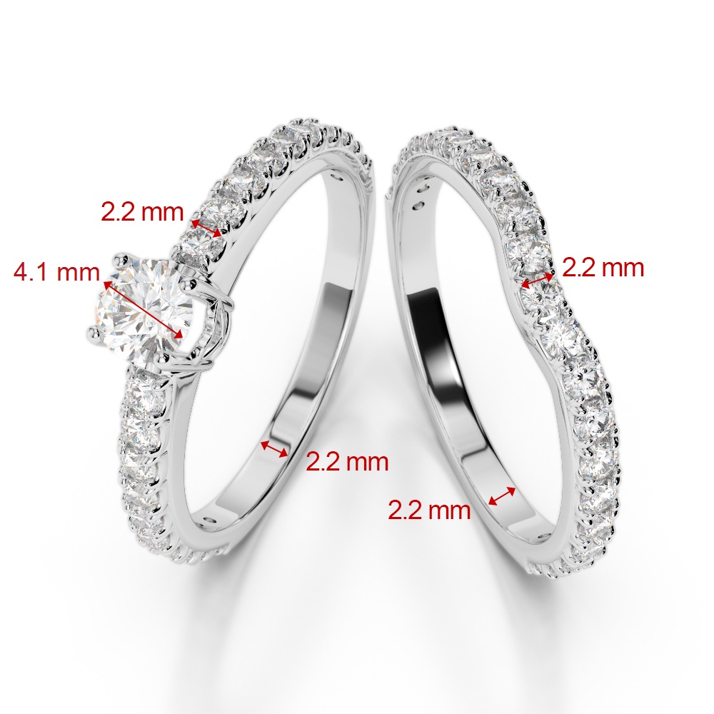 This diamond bridal set ring set features round brilliant-cut diamonds, making it the perfect choice for your wedding day. The bridal set boasts a sparkling diamond at its center, while the wedding ring is encrusted with round brilliant-cut diamonds, all beautifully set in a combination of prong and scallop settings. The set is meticulously designed to fit together seamlessly, adding both comfort and style to your look. The naturally mined conflict-free diamonds add a touch of elegance to the overall ensemble.