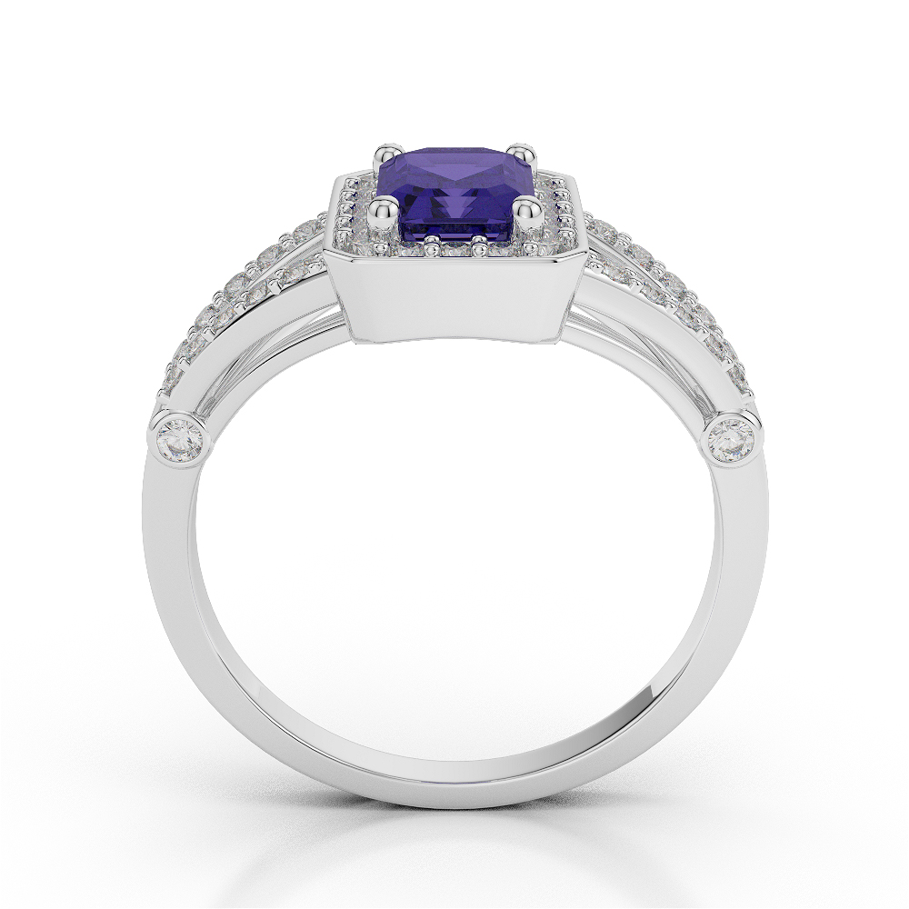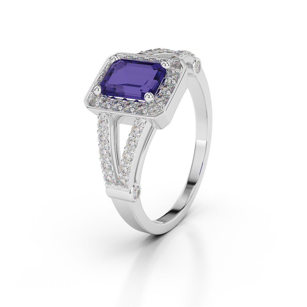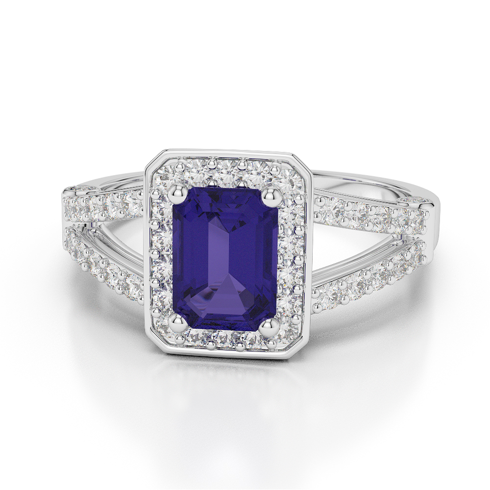 This stunning tanzanite and diamond ring is a stunning piece of jewellery, featuring an emerald-cut sapphire surrounded by a halo of sparkling diamonds. Set in a split shank band, it exudes elegance and sophistication, making it a perfect gift or special occasion accessory.