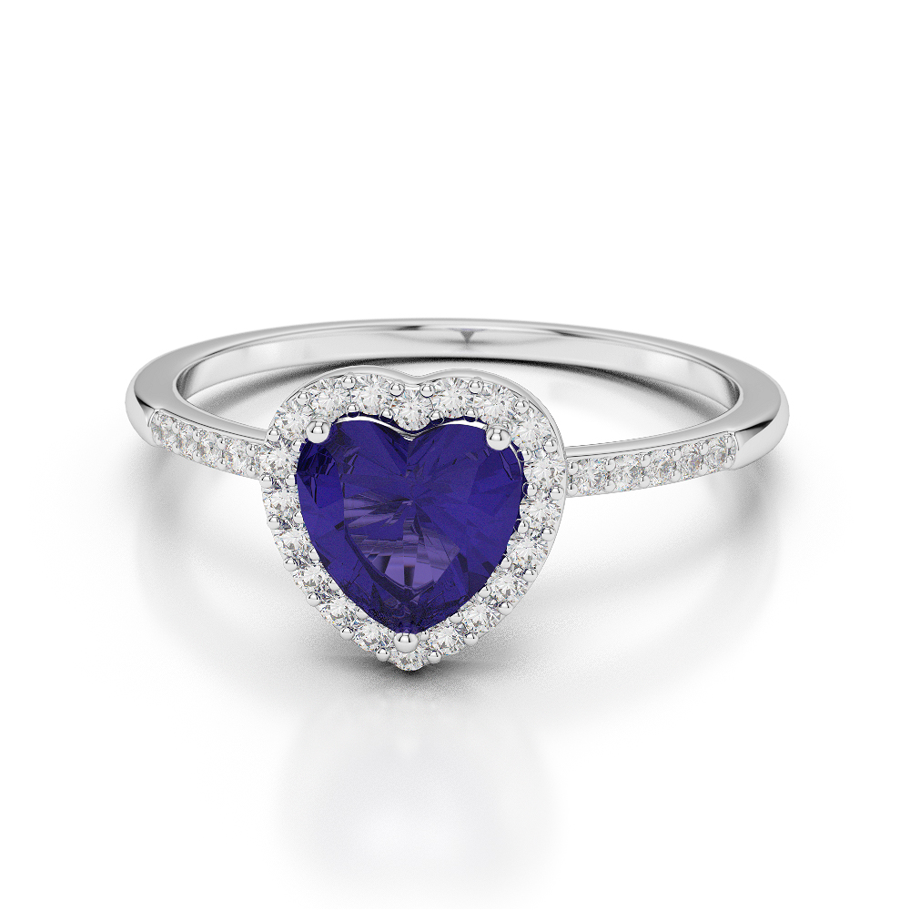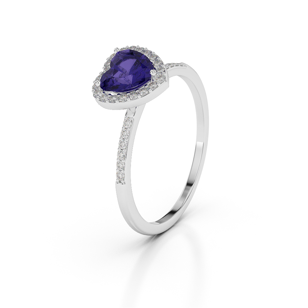 This tanzanite heart-shaped ring, prong-set and adorned with diamonds, is a symbol of elegance and sophistication, crafted with precision and attention to detail. The heart-shaped sapphire symbolises love and affection, while a halo of dazzling diamonds surrounds it, enhancing its brilliance and creating a mesmerising sparkle.